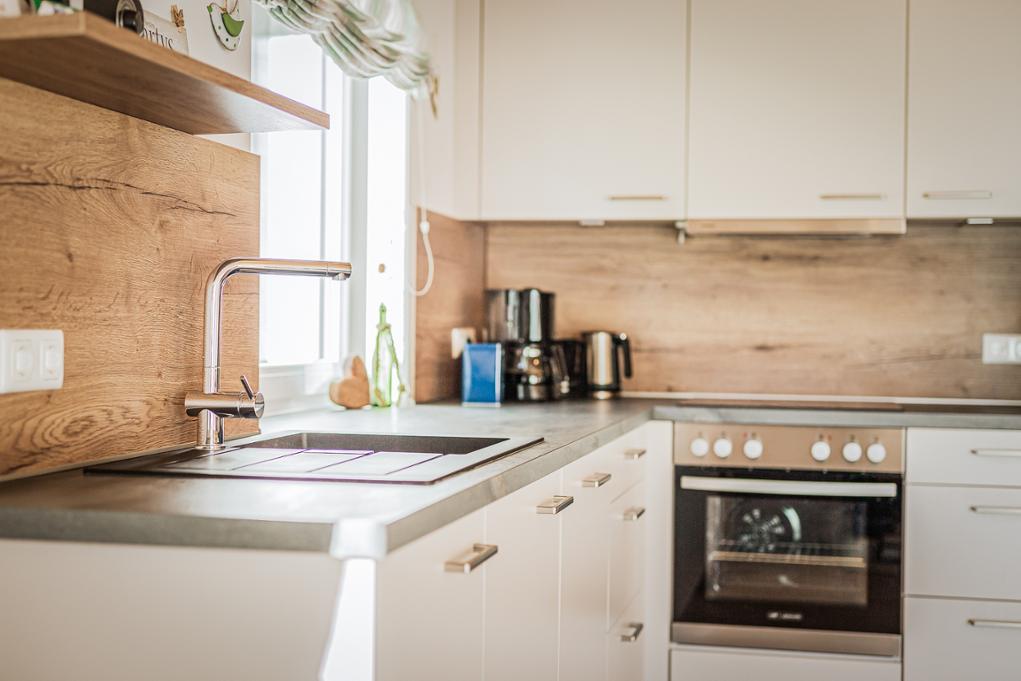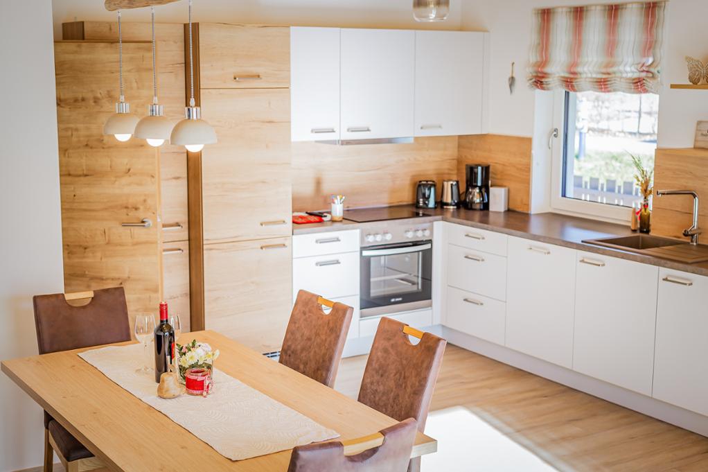 Die modern eingerichtete Küche im Erdgeschoß beinhaltet E-Herd, Kühlgefrierschrank, Geschirrspüler, Toaster Wasserkocher, Kaffeemaschine, sämtliches Geschirr sowie Reinigungsmittel.