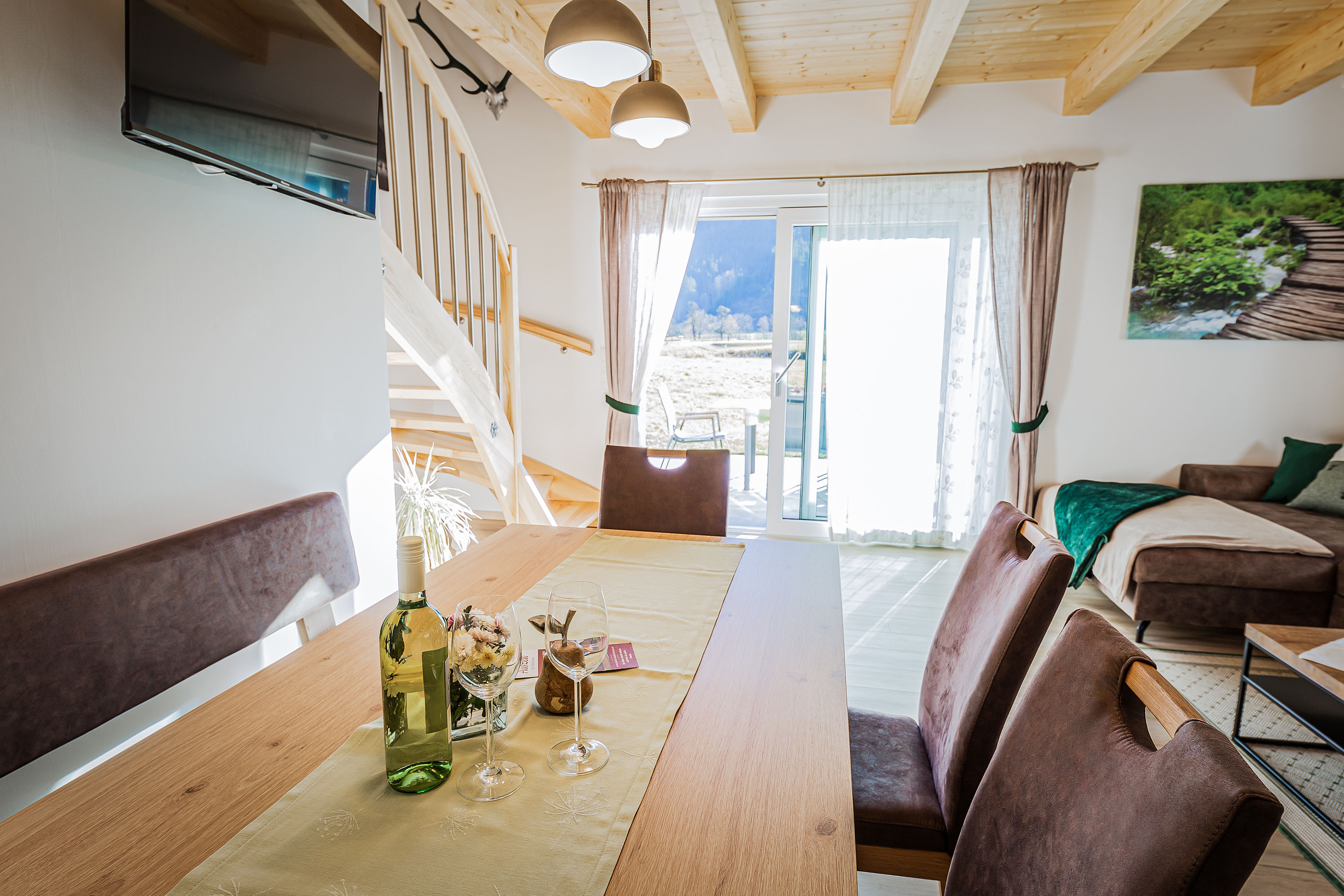 Der Essbereich und die Wohnlandschaft bieten heimeliges Flair mit Sat TV.