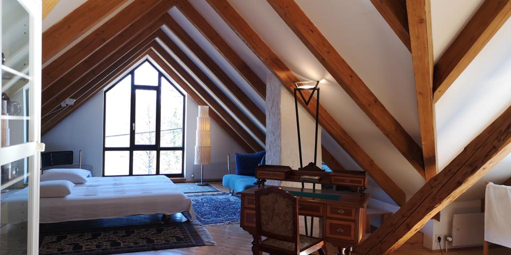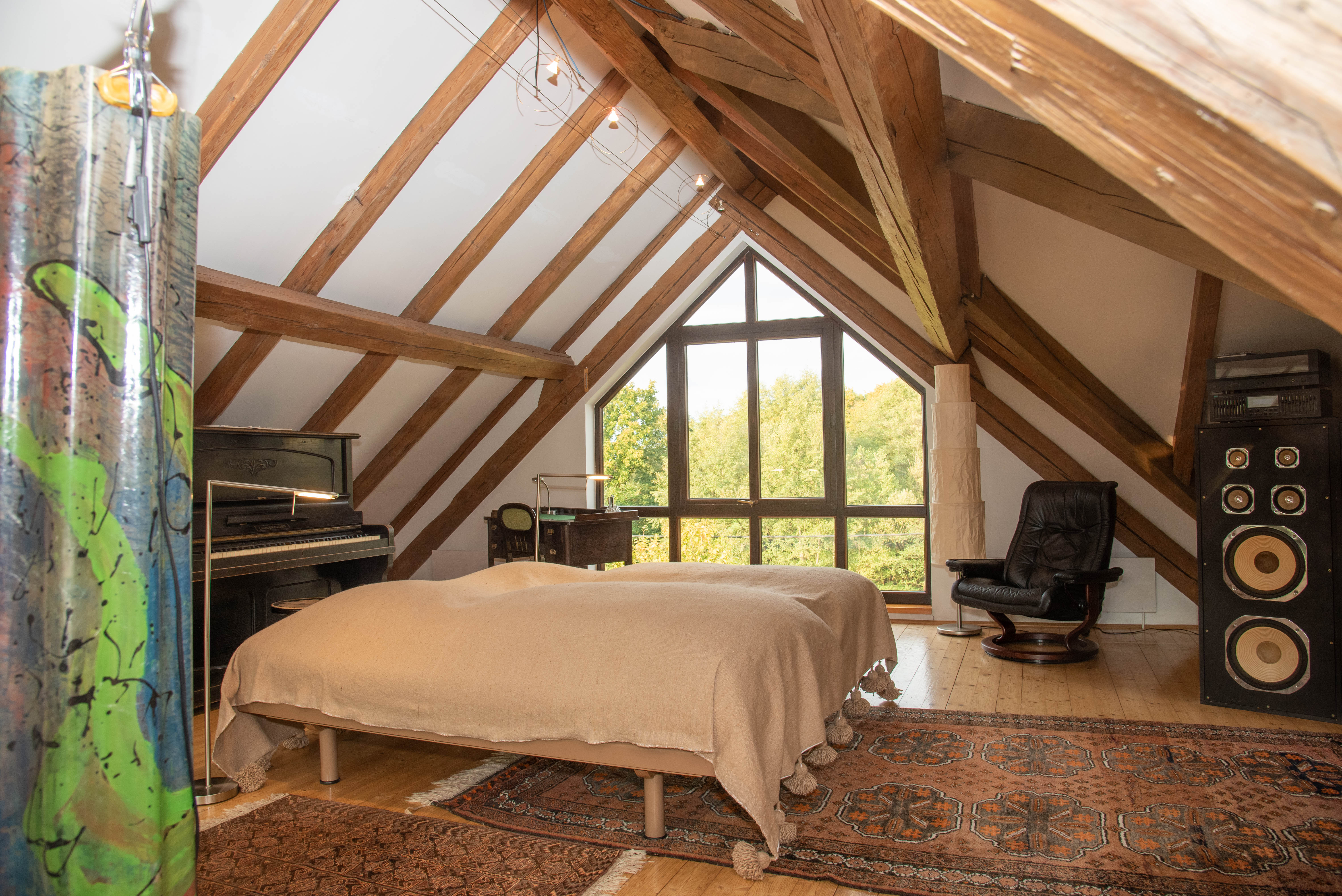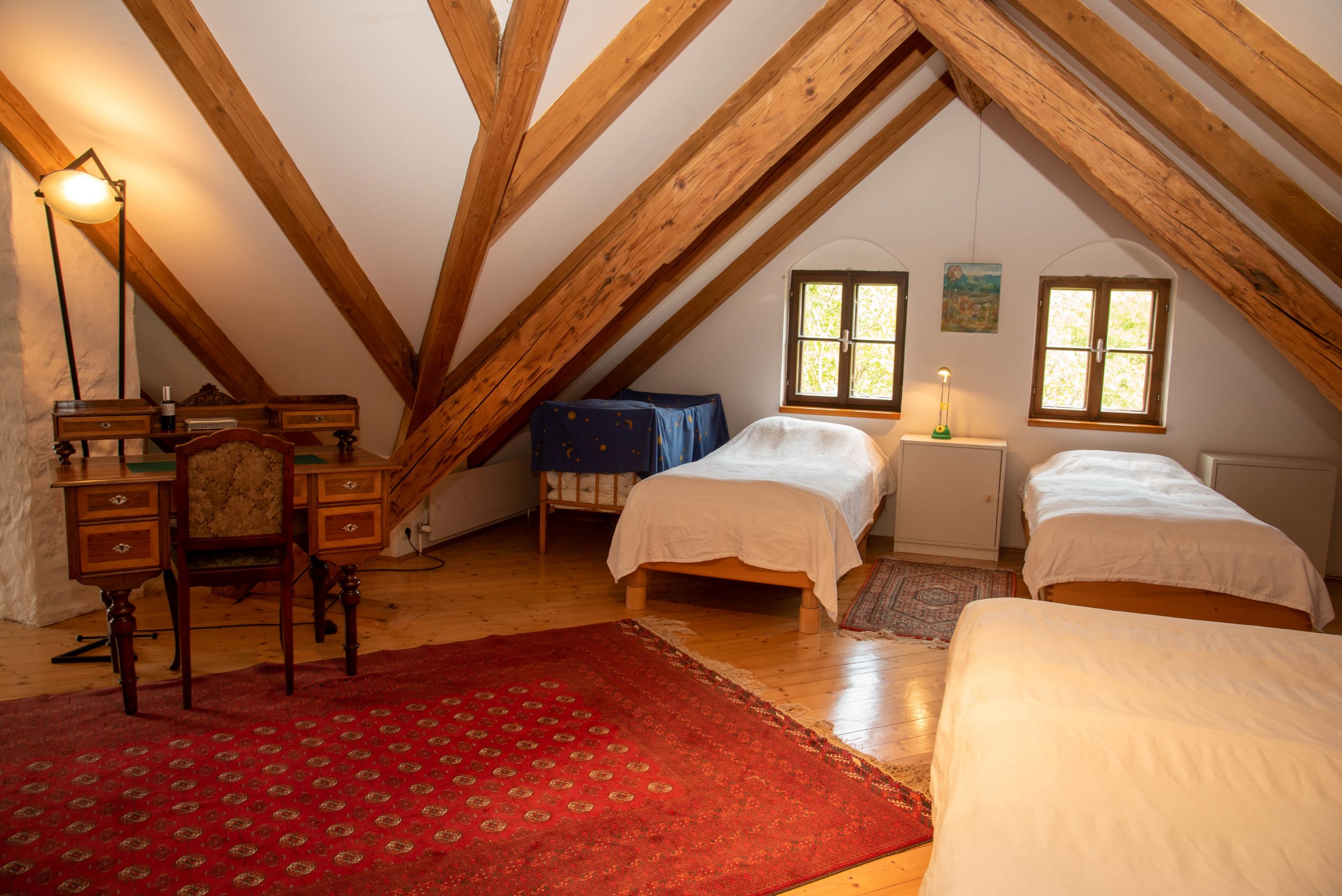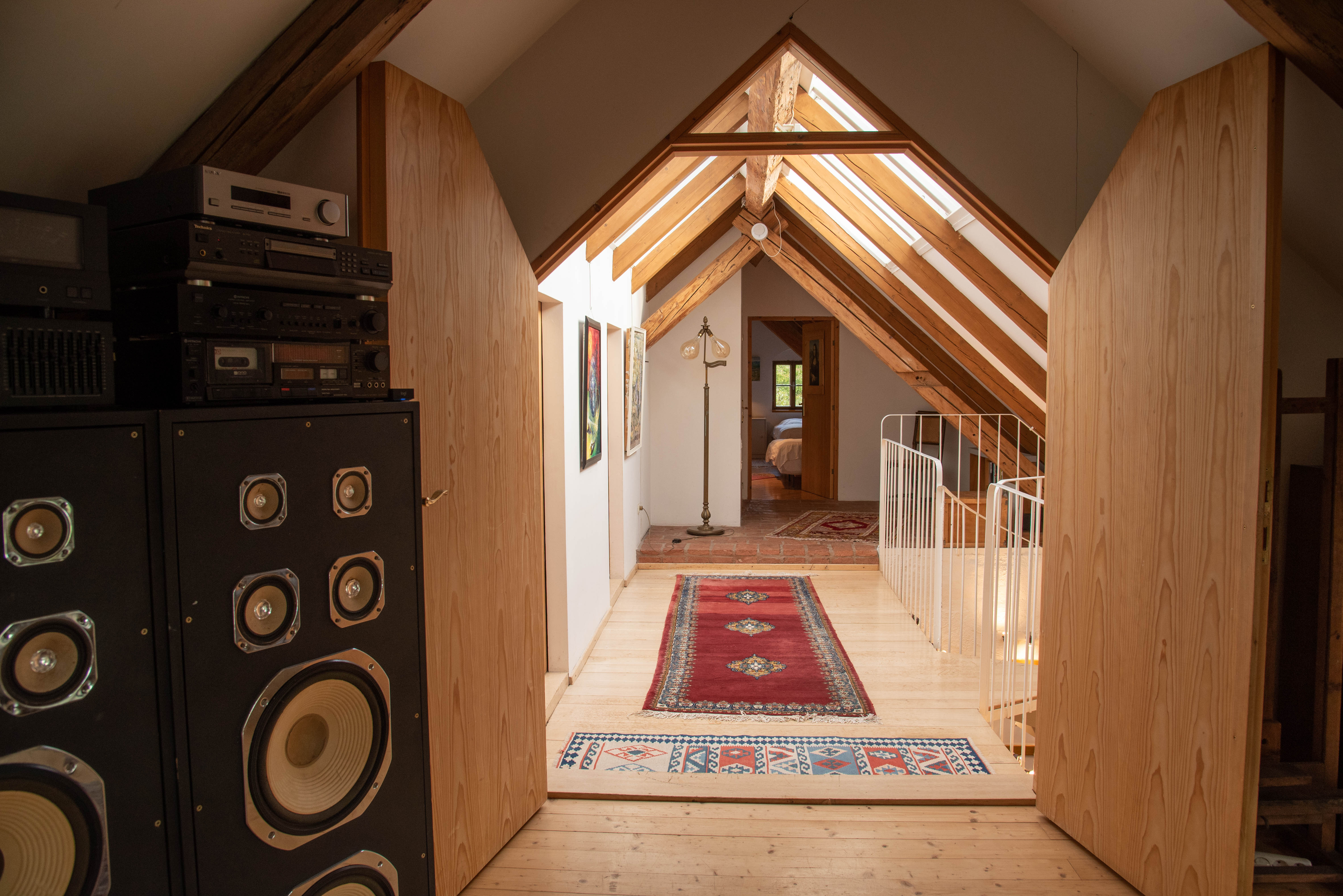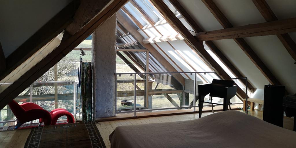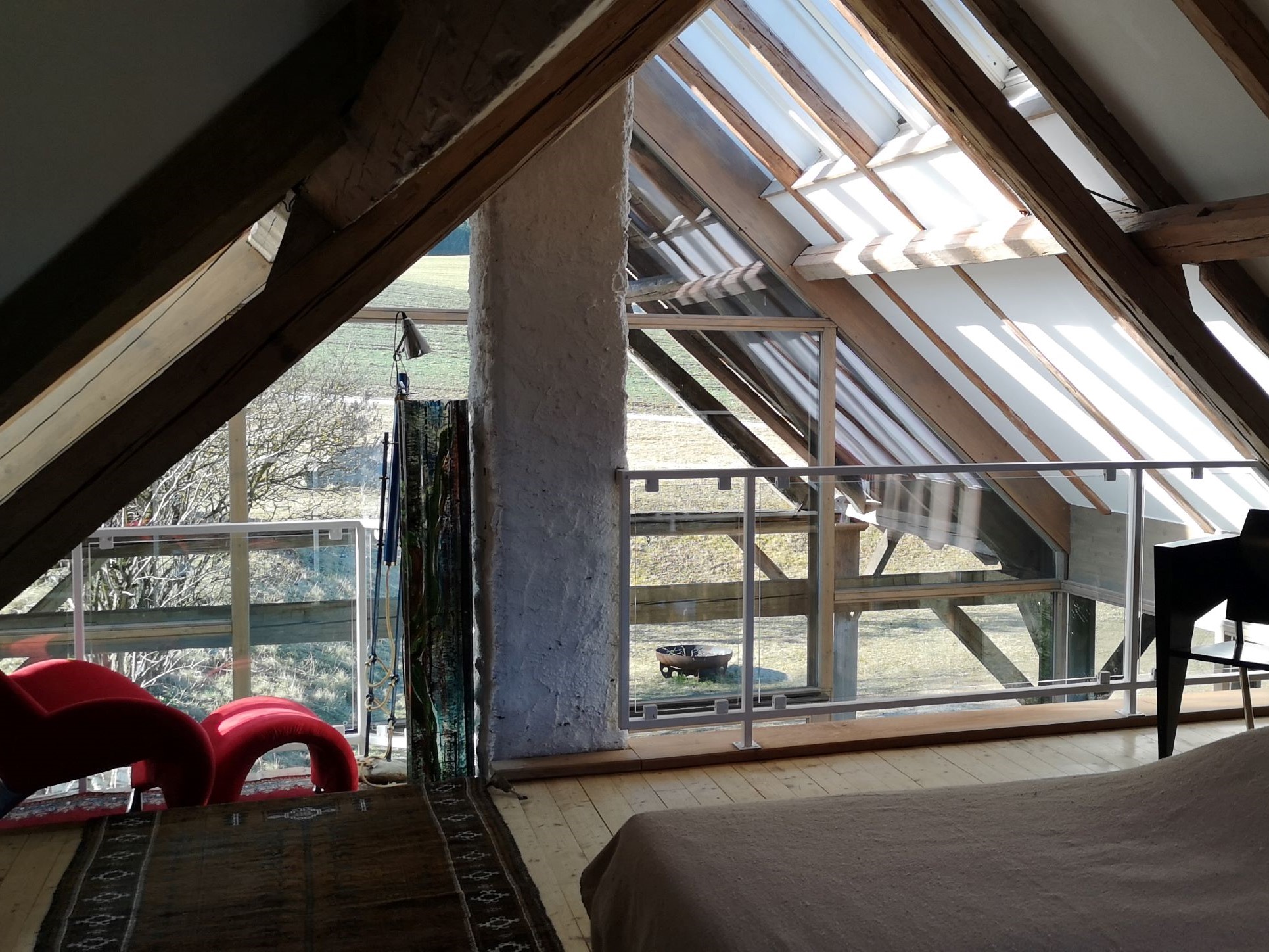 Beim Ausbau des Hofes im Waldviertel wurde das Dach zur Gänze entfernt und mit alten gehackten Balken neu aufgebaut und isoliert. Über eine Wendeltreppe gelangt man auf eine Brücke im Obergeschoss, die zwei große Räume miteinander verbindet. Der Dachausbau beherbergt außerdem ein WC und einen begehbaren Schrank. Der Wintergarten ist über den zwei- geschossigen Luftraum mit dem westlichen Schlafraum verbunden und gibt vom Bett freien Blick auf Wiesen und Wälder Richtung Norden und Süden.