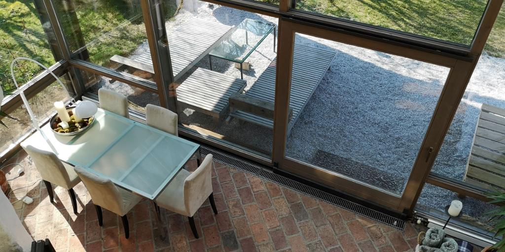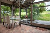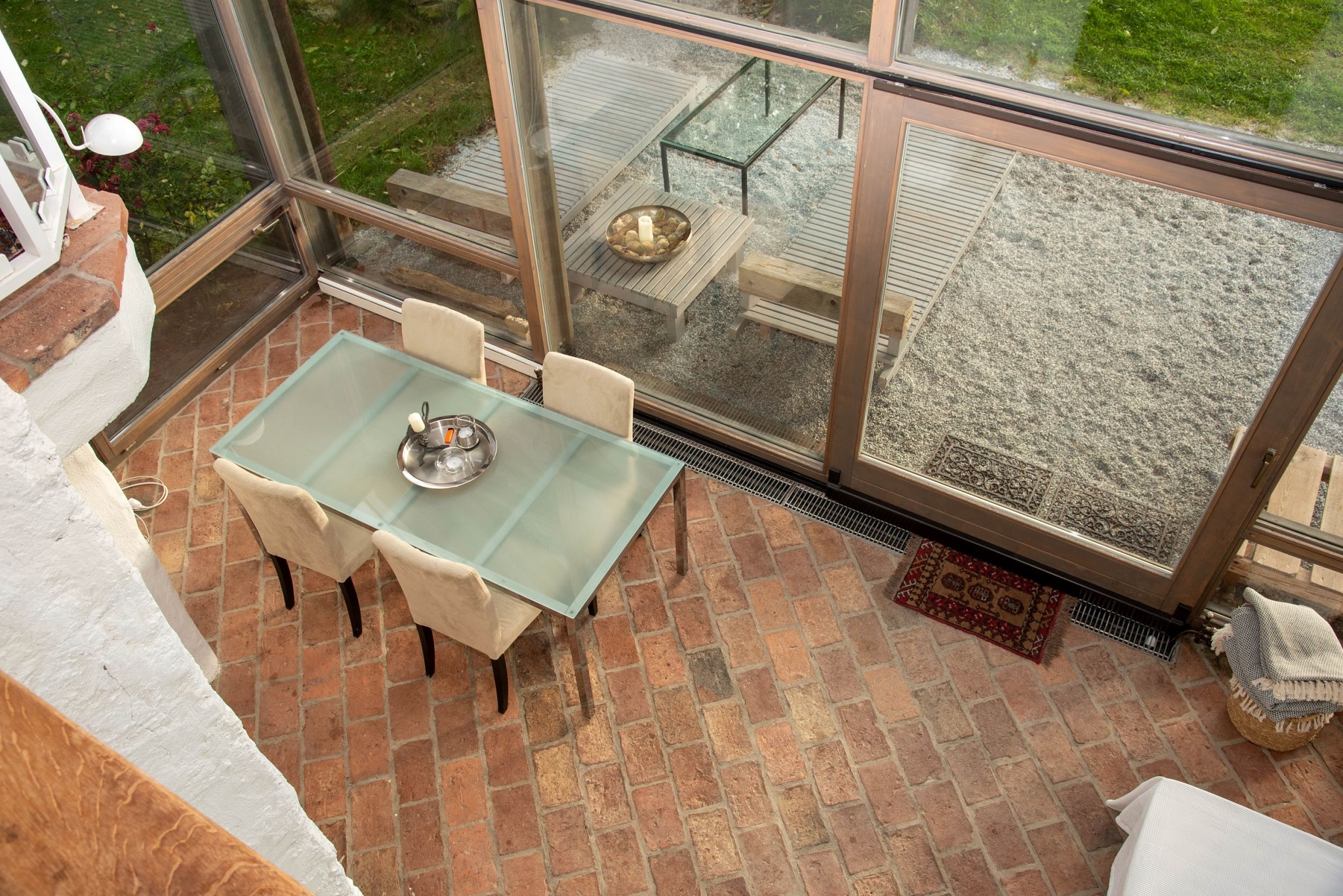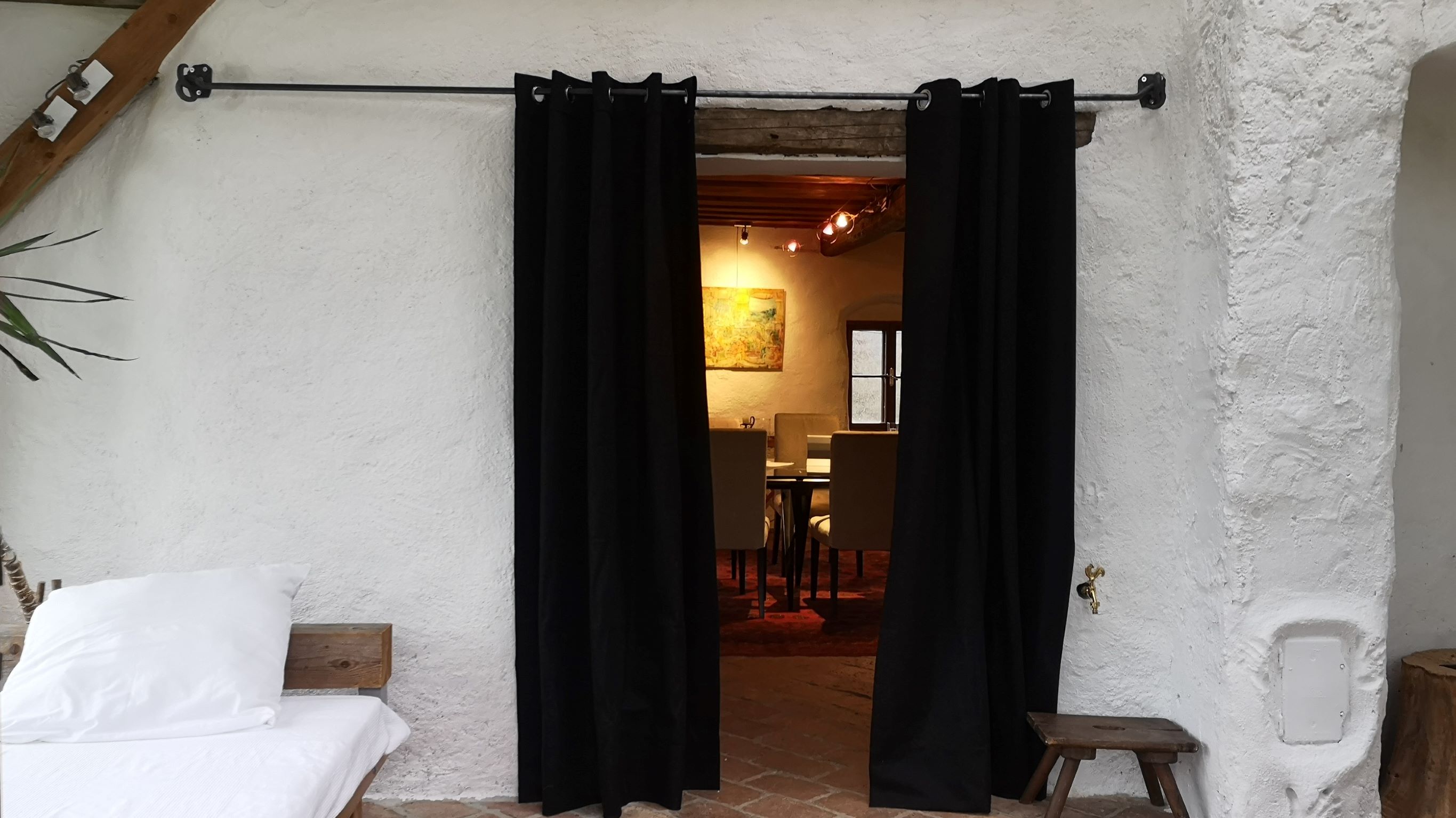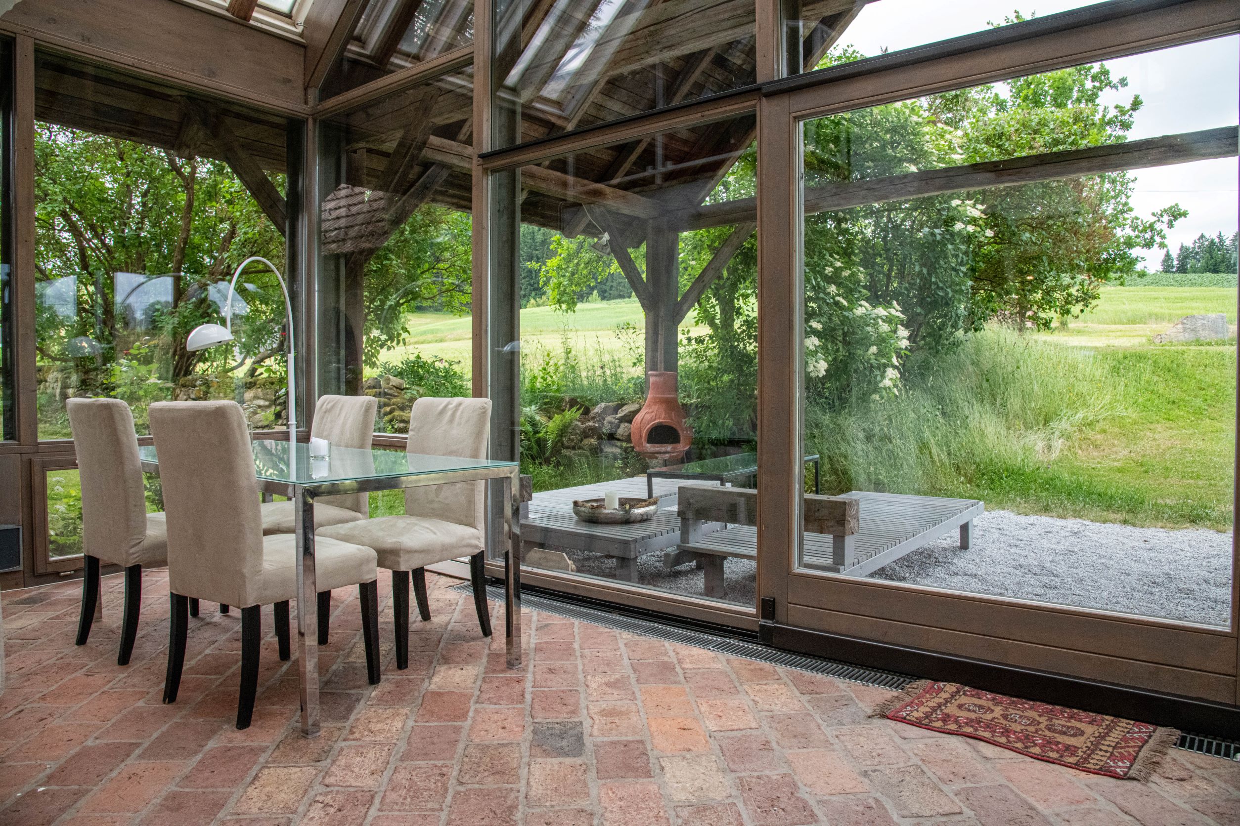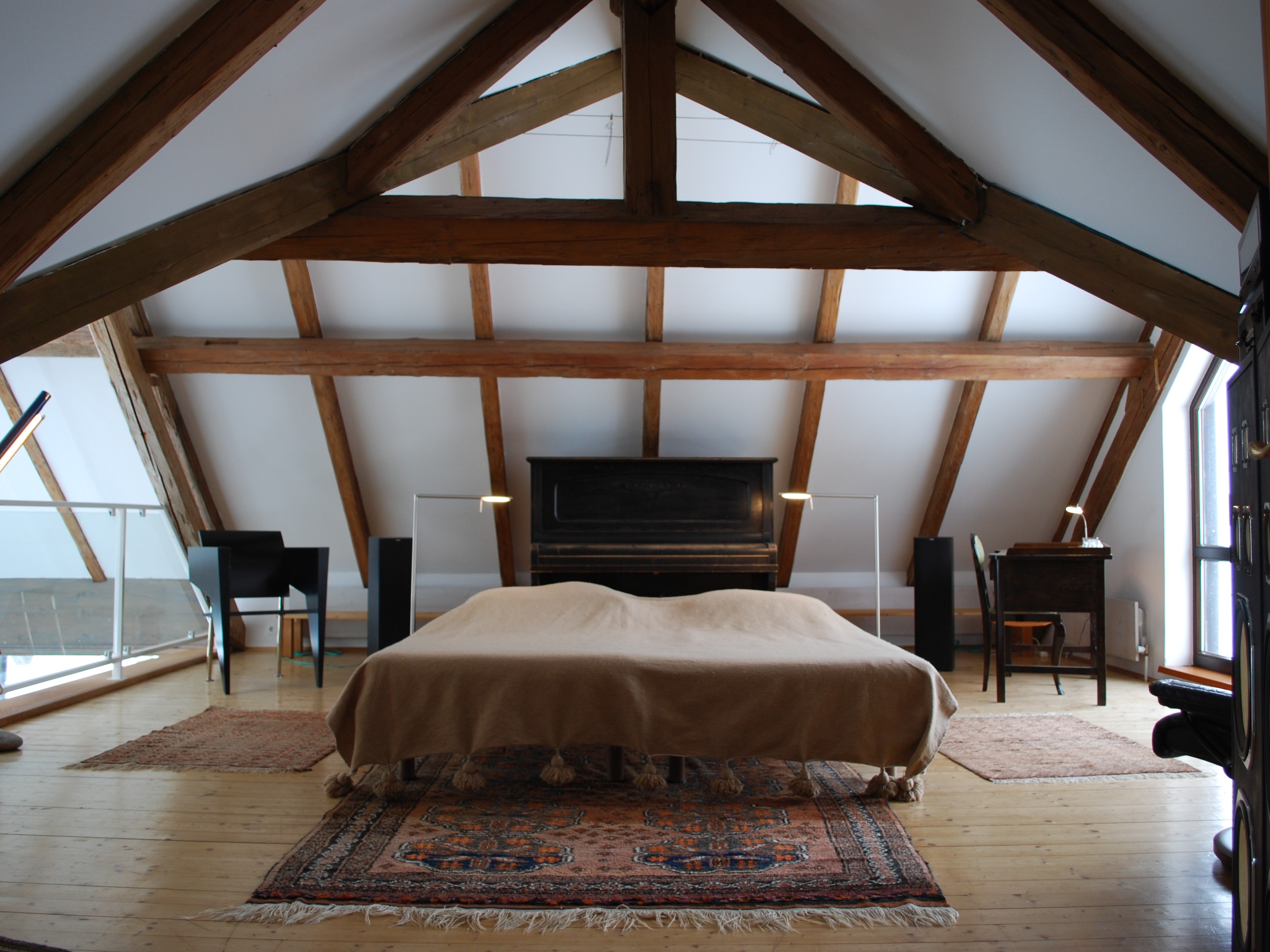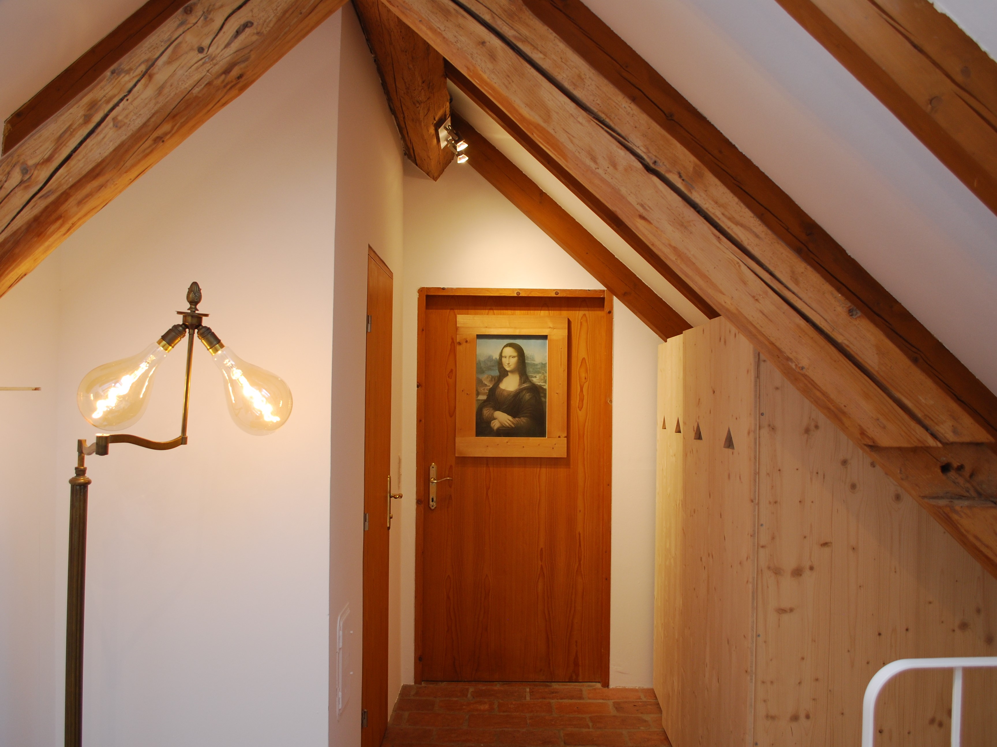 Beim Ausbau des Hofes im Waldviertel wurde das Dach zur Gänze entfernt und mit alten gehackten Balken neu aufgebaut und isoliert. Über eine Wendeltreppe gelangt man auf eine Brücke im Obergeschoss, die zwei große Räume miteinander verbindet. Der Dachausbau beherbergt außerdem ein WC und einen begehbaren Schrank. Der Wintergarten ist über den zwei- geschossigen Luftraum mit dem westlichen Schlafraum verbunden und gibt vom Bett freien Blick auf Wiesen und Wälder Richtung Norden und Süden.