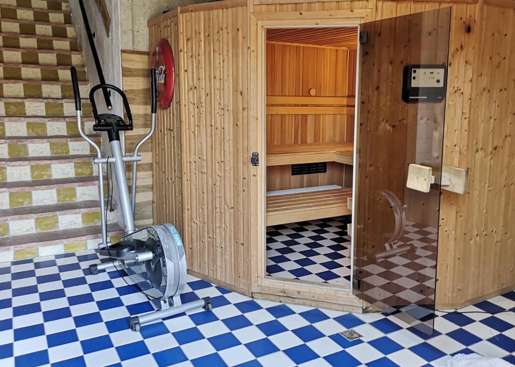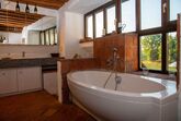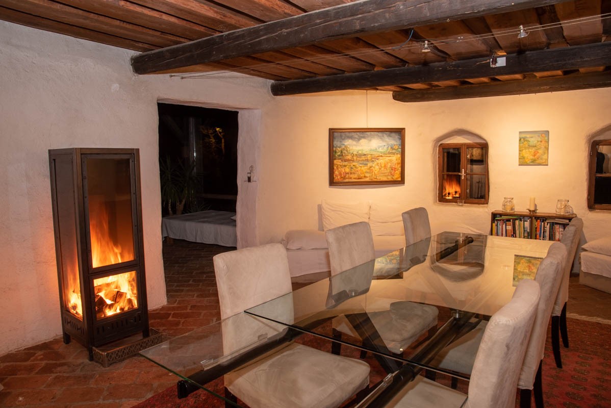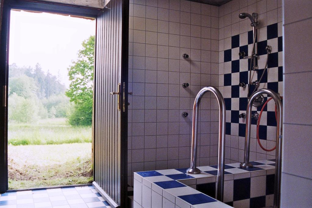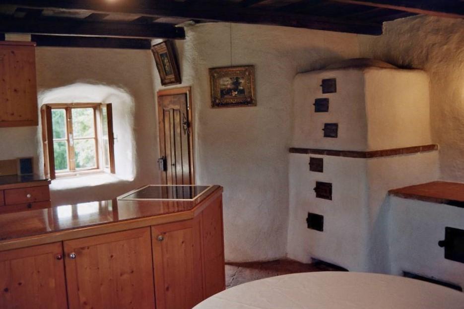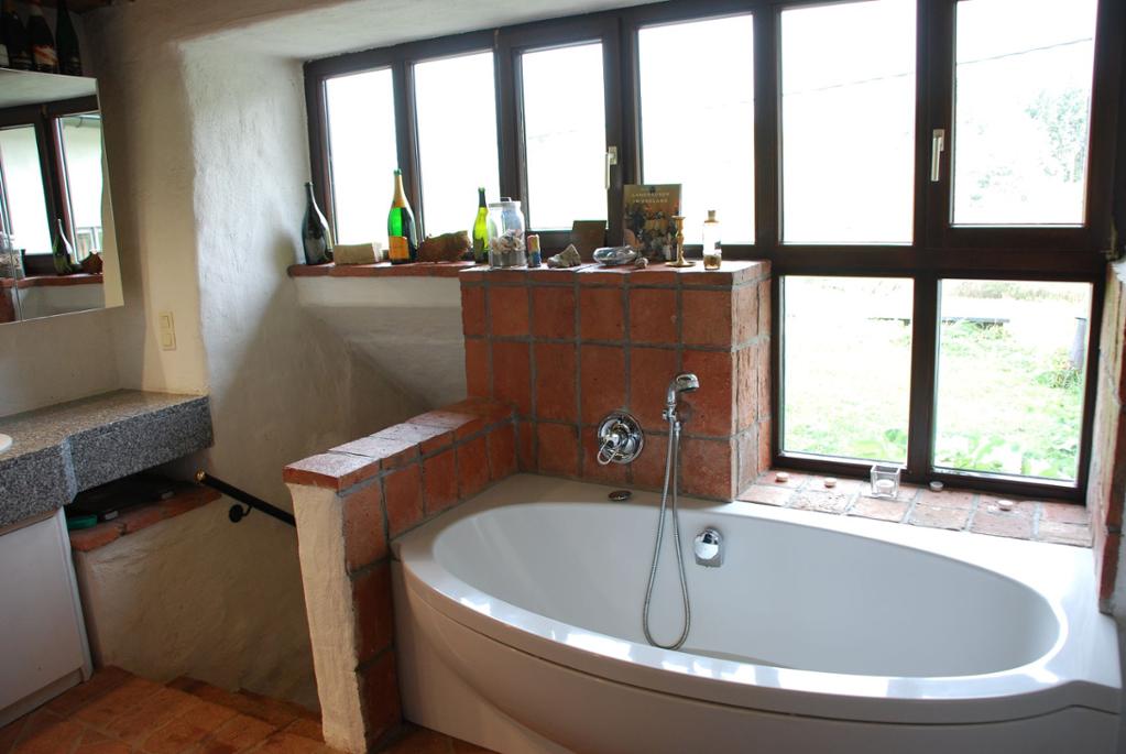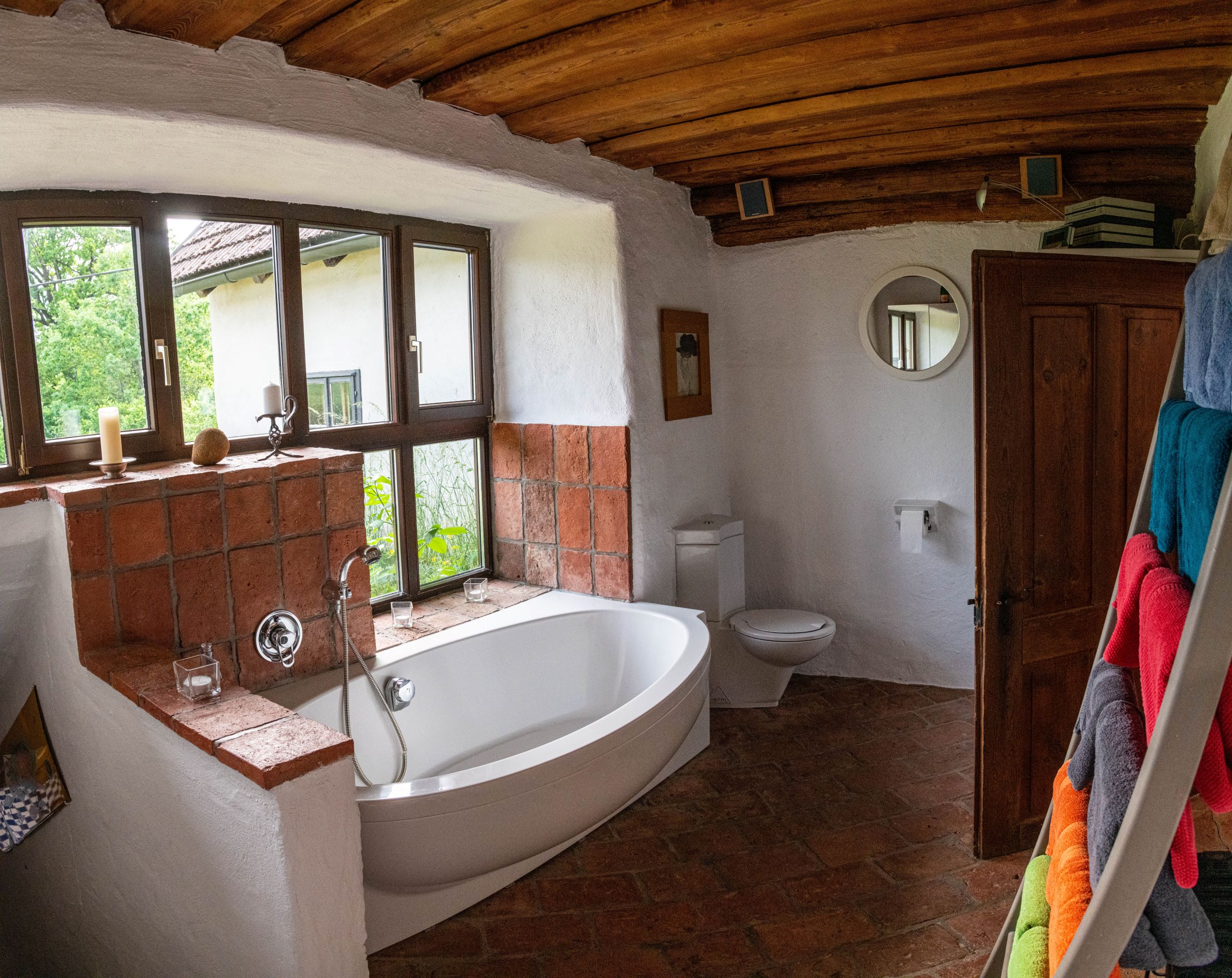 Auch aus der von Ferdinand Porsche entworfenen Badewanne kann der Blick vom Himmel über Wiesen und Wälder schweifen. Vom Badezimmer geht man über Stiegen in den Saunakeller mit Dusche, Tauchbecken und direktem Ausgang ins Freie. Der Technikraum mit Gastherme, Wasserkessel für die beiden Brunnen und Herberge für Waschmaschine und Wäsche-trockner befindet sich ebenfalls in diesem Bereich des Hauses. Das Erdgeschoss wird über eine Fußbodenheizung und zwei Holzöfen beheizt. Von der Küche geht man über alte handbehauene Granitstufen in den alten Weinkeller, der ein paar tausend Flaschen Wein aufnehmen kann.