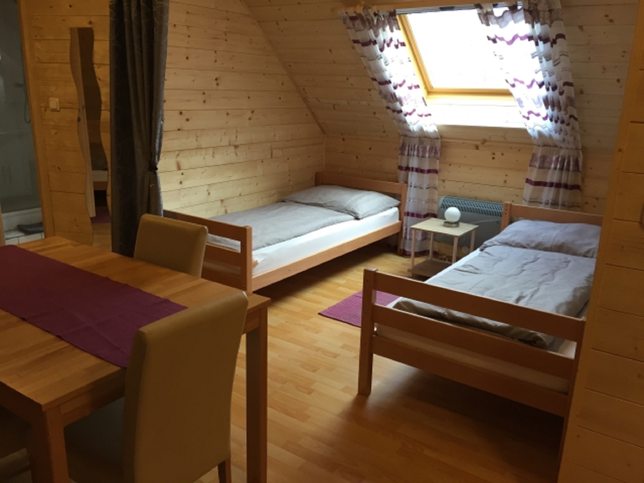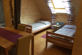 Unser voll eingerichtetes Familienzimmer ist ca. 30 qm groß und bietet Platz für bis zu 4 Personen. Das Zimmer befindet sich im Obergeschoss des Nebenhauses und verfügt über ein Schlafzimmer sowie 2 getrennte Betten im Wohnbereich. Das Schlafzimmer ist ausgestattet mit einem Doppelbett. Bettwäsche und Handtücher sind vorhanden.. Die Küchenzeile ist ausgestattet mit einem Kühlschrank,Teekocher sowie einer Kochplatte. Geschirr sowie Tisch- und Küchenwäsche ist vorhanden. Im Wohn-Essbereich gibt es einen Esstisch und einen Fernseher. Das Badezimmer verfügt über ein Waschbecken sowie Dusche und WC. Das Fenster im Badezimmer kann geöffnet werden.Zu diesen Zimmer gibt es auch eine Terasse. Ein Parkplatz steht kostenfrei zur Verfügung, auch Wlan kann kostenfrei genutzt werden. Das Zimmer ist ein Nichtraucherzimmer.