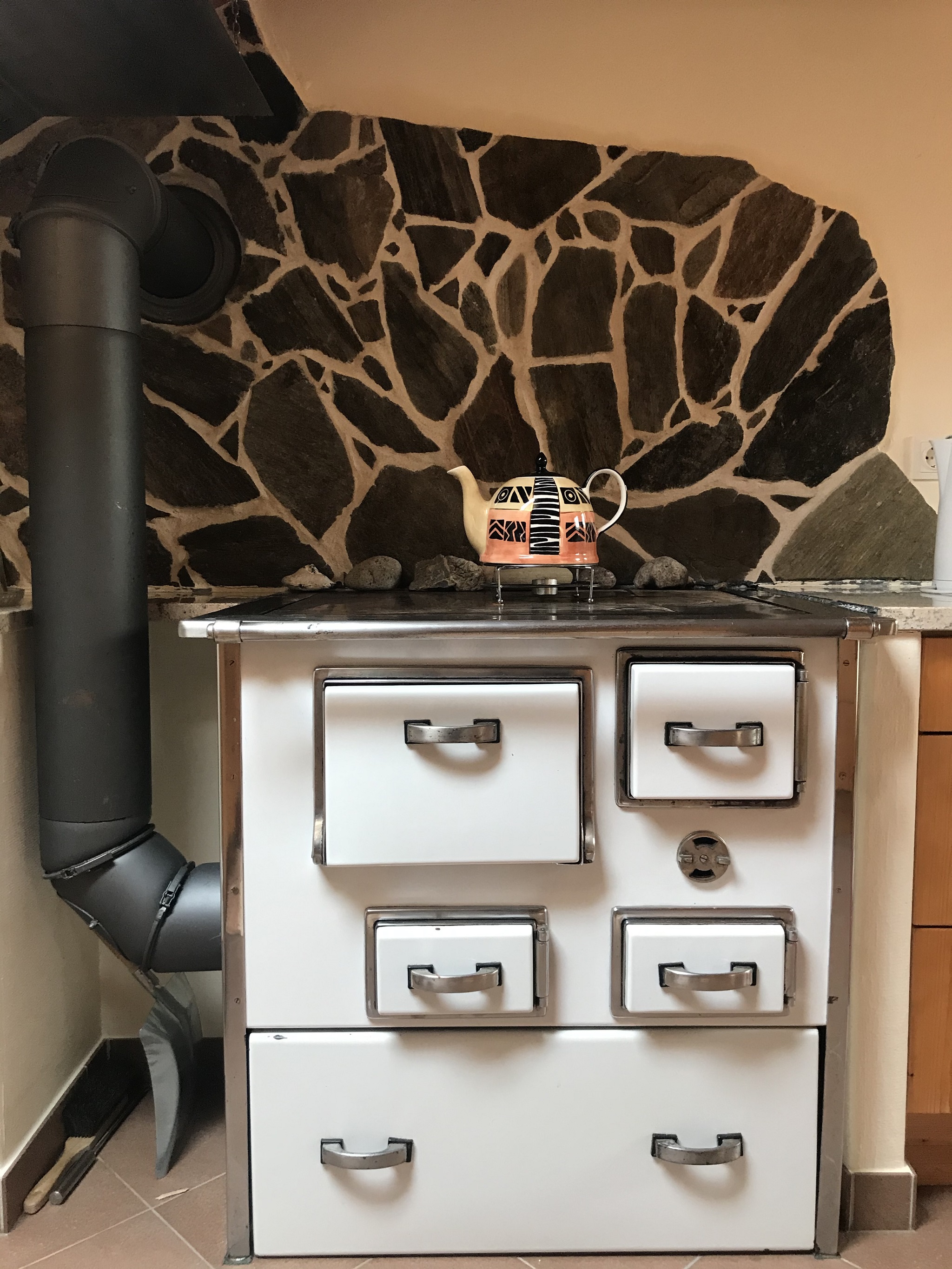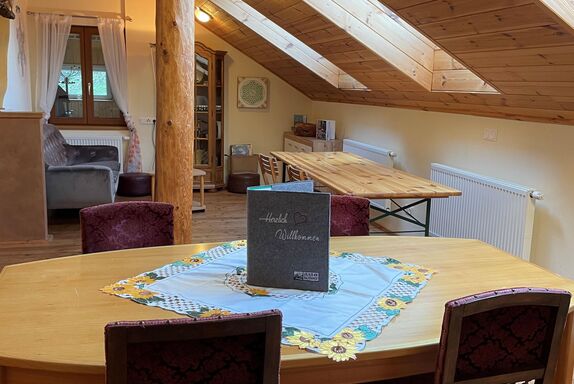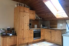 Ein großer Esstisch bietet Platz für schöne gemeinsame Mahlzeiten. Die Küche bietet mit Kühlschrank, Geschirrspüler, Elektroherd und Spüle, zudem mit allem nötigen Geschirr ausgestattet, alle Möglichkeiten zur Selbstversorgung. Zusätzlich ist in der Küche ein Küchenherd, der mit Holz zu befeuern ist. Auf diesem kann, wie in alten Zeiten, gekocht werden. Die Ferienwohnung verfügt über ein modernes Zentralheizungssystem.