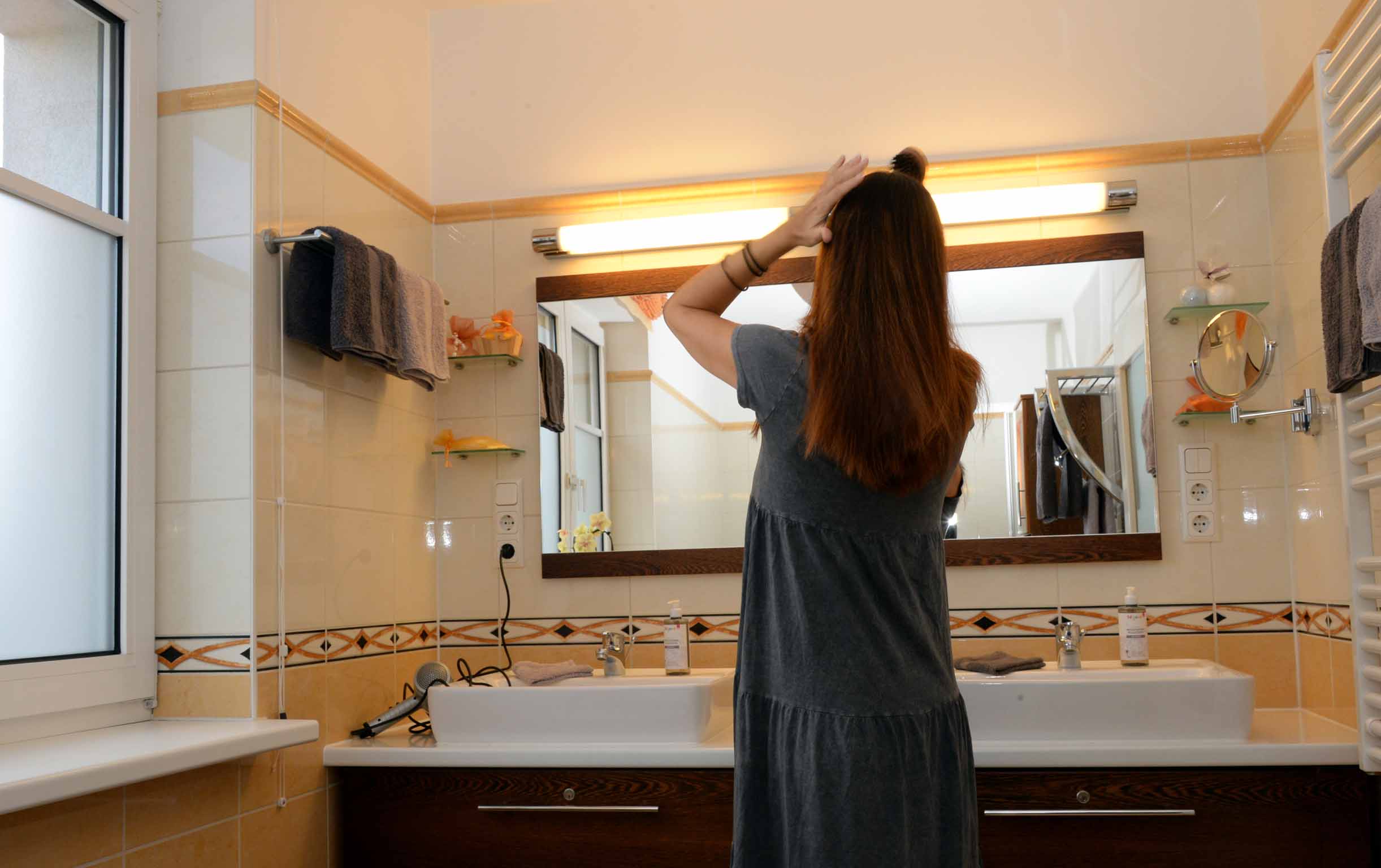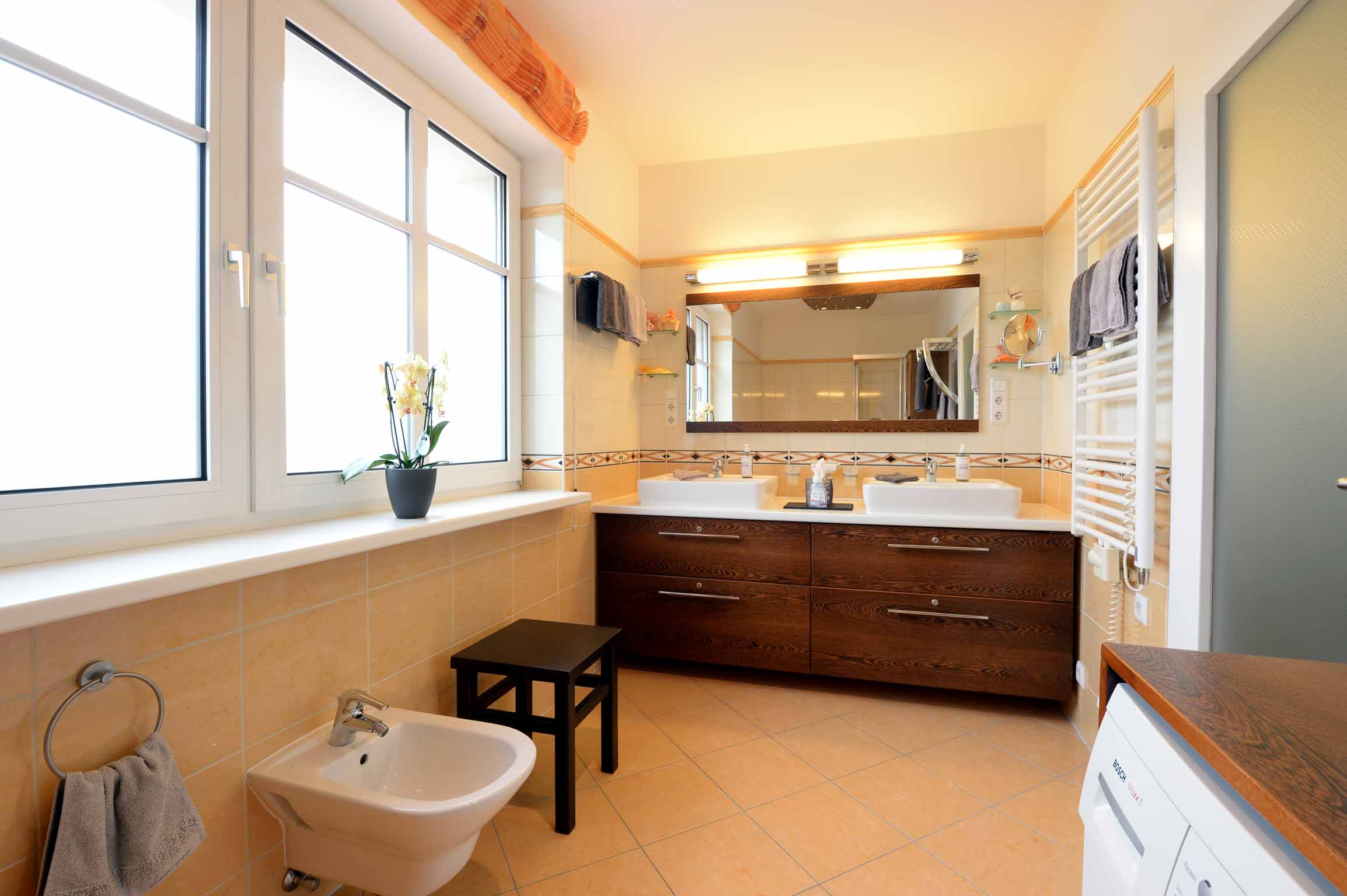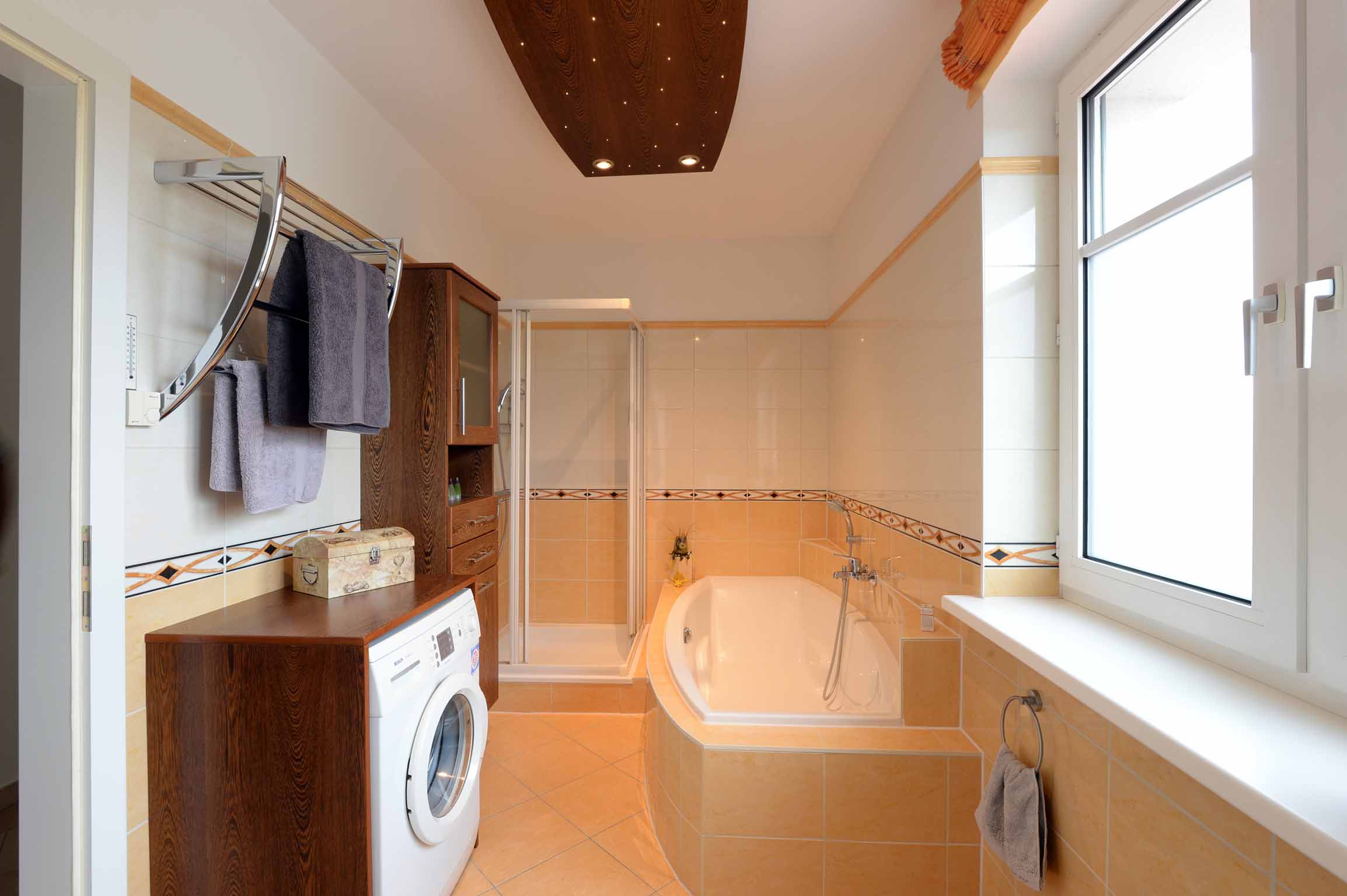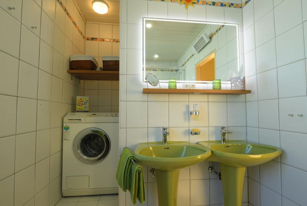 Handtücher, Duschtücher, Duschgel, Haarföhn sowie Waschmaschine und Waschmittel im Badezimmer.