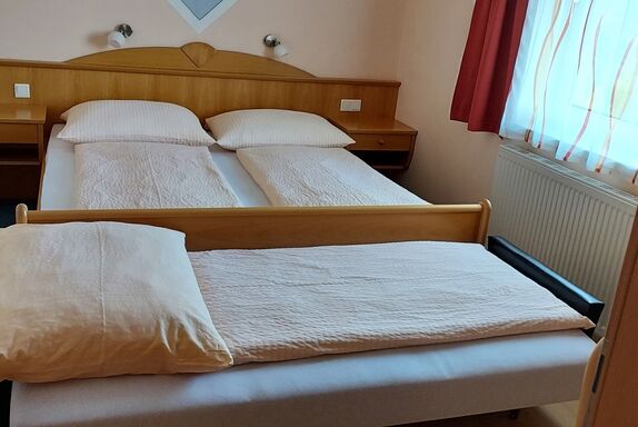 Das helle und geräumige Dreibettzimmer mit 20qm bietet einen traumhaften Blick auf die Berge. Es verfügt über ein Doppelbett und ein Einzelbett. Ein Kleiderschrank und TV befinden sich ebenfalls im Zimmer. Das Badezimmer mit Dusche oder Badewanne, WC und Fön rundet das Gesamtbild ab. Auf dem Balkon können Sie entspannte Abende verbringen. Haustiere sind gestattet. Möglicherweise fallen Gebühren an. Das WLAN und den Parkplatz vor dem Haus können Sie kostenfrei nutzen.