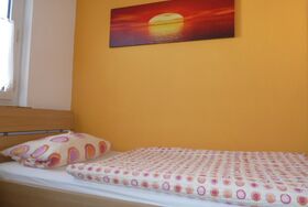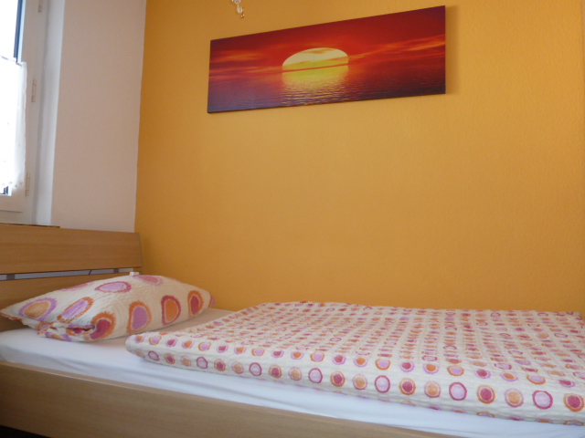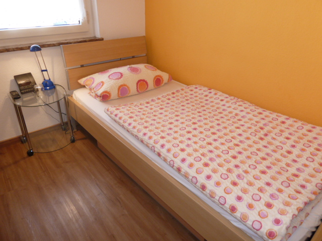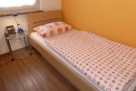 Das Einzelzimmer ist ca. 10qm groß. Es ist ausgestattet mit einem Bett 1m x 2m, Schrank, Fernseher, ein Tischchen mit Stuhl und Wasserkocher. Das Badezimmer und das WC befinden sich auf der selben Etage und wird max. von 2 Personen mitbenutzt. Im Zimmer und im gesamten Haus darf nicht geraucht werden.