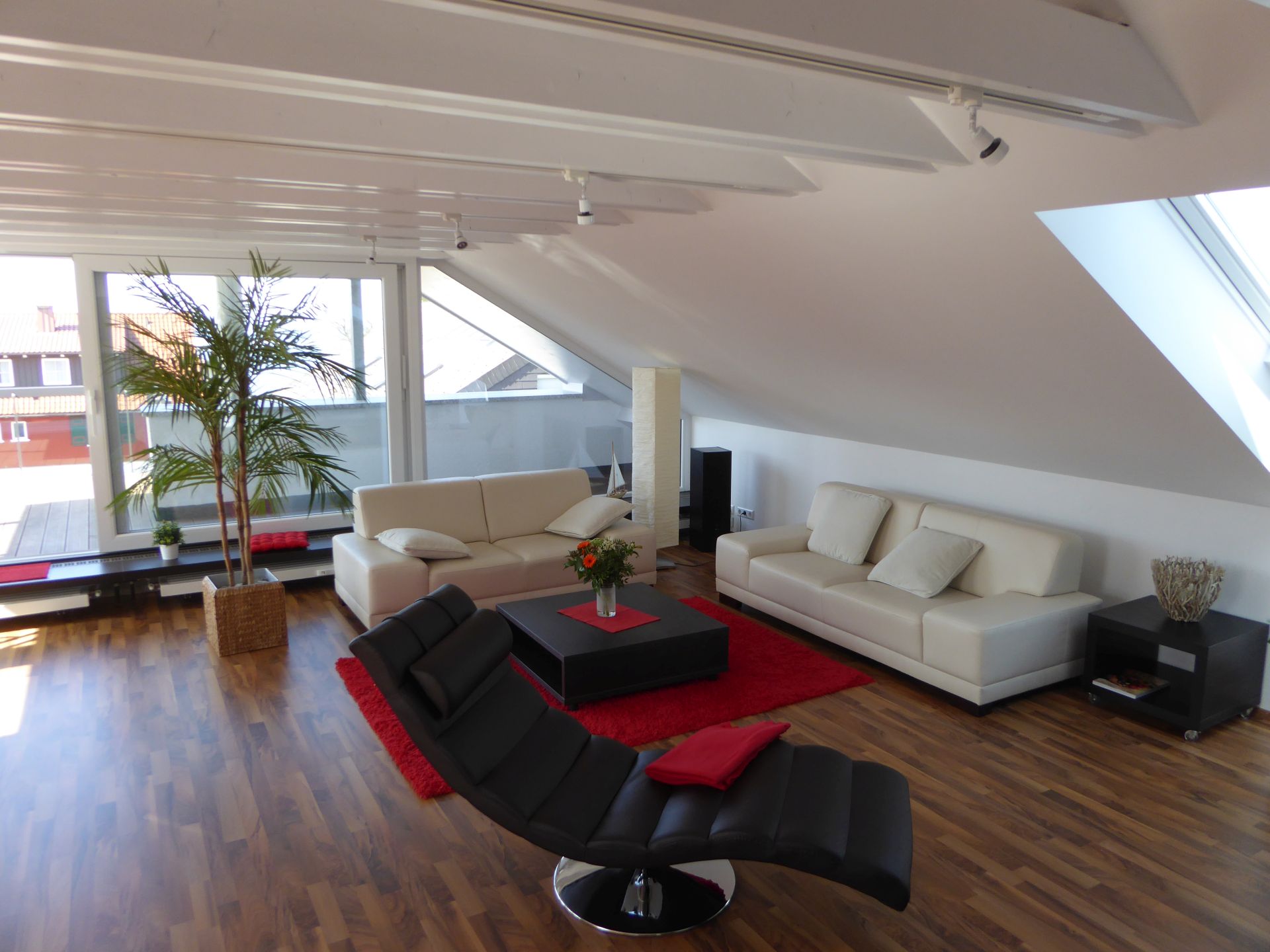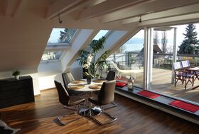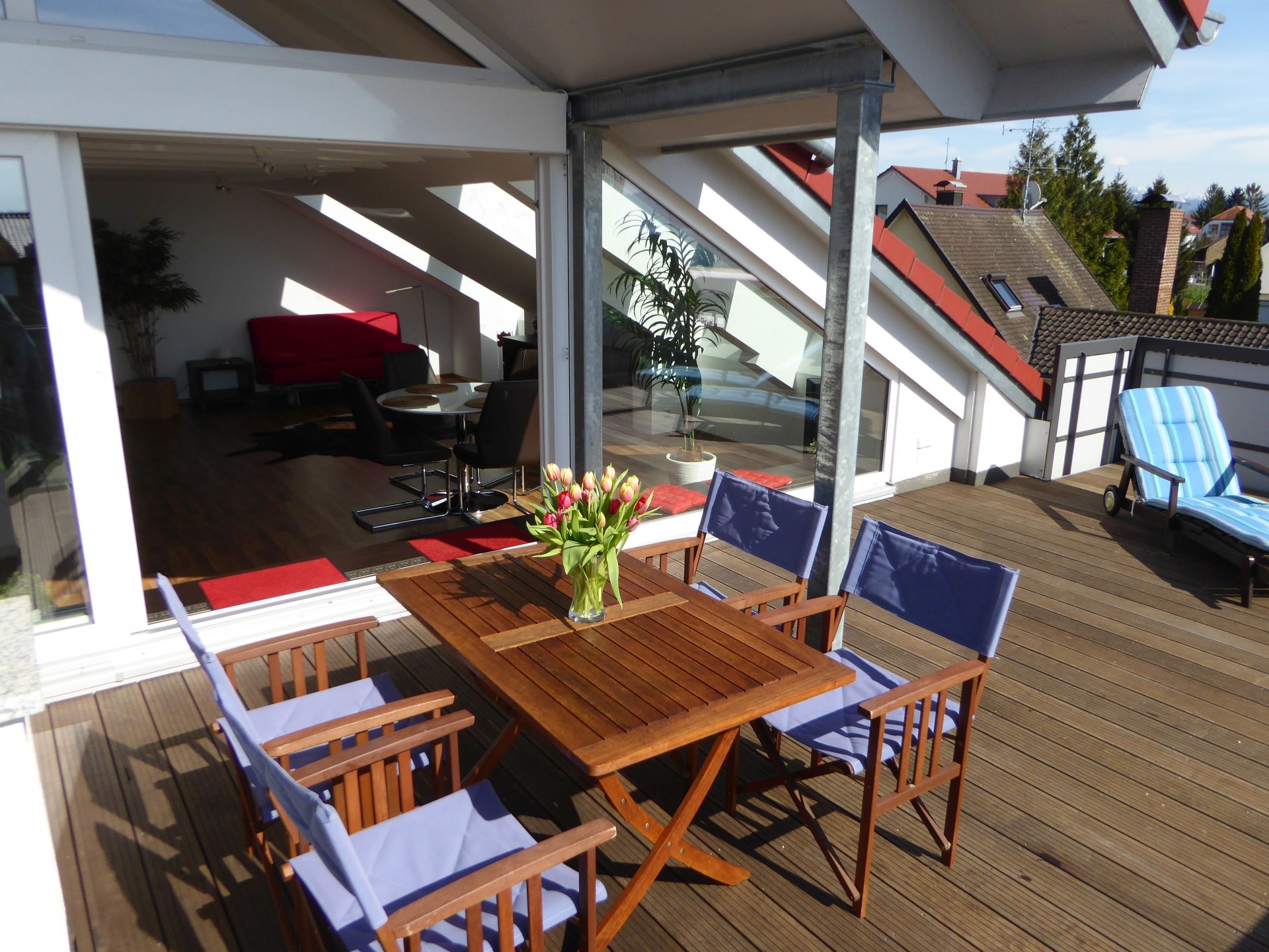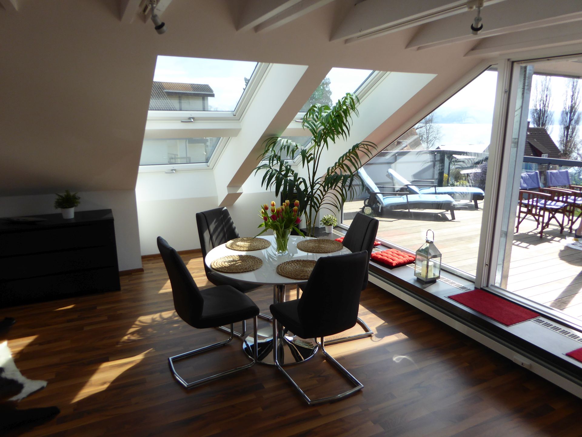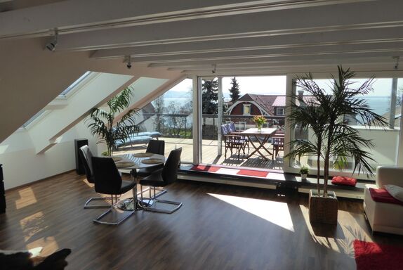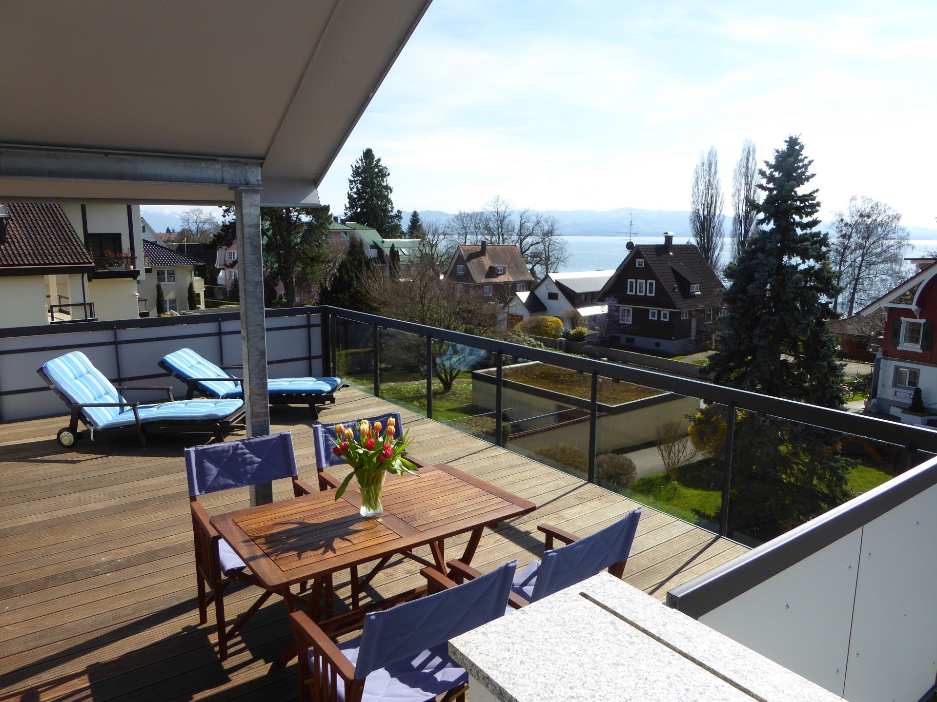 Die Ferienwohnung ist ca.110qm groß und bietet Platz für bis zu vier Personen. Sie liegt in der zweiten Etage eines 5-Familienhauses und nimmt das komplette Dachgeschoss ein. Die Wohnung zeichnet sich besonders durch einen traumhaften Blick auf den Bodensee bis hin zu den Schweizer Alpen vom komplett zum See verglasten Wohnzimmer und der ca. 30qm großen Dachterrasse aus. Das großzügige und lichtdurchflutete Wohnzimmer hat ca. 50qm und ist modern eingerichtet. Sie finden dort eine gemütliche Couchgarnitur, Esstisch mit vier Stühlen am Fenster, eine Doppelschlafcouch (160x200) und einen Relax- und Fernsehsessel. Ein 46Zoll Flachbildfernseher gehört ebenso zur Ausstattung wie eine Stereoanlage mit CD Player. Das Schlafzimmer ist ausgestattet mit einem Doppelbett (180x200), einem großzügigen Einbauschrank und einem Kosmetiktisch mit großem Spiegel. Im hellen Wohlfühlbad mit Eckbadewanne, separater Vollglas-Duschkabine, Waschtisch und WC fühlen Sie sich mit Sicherheit Wohl! In der separaten Küche finden Sie neben einem Backofen und einem Ceran Kochfeld den Kühlschrank mit Gefrierfach, eine Geschirrspülmaschine, eine Mikrowelle, eine Kaffeemaschine, einen Toaster und einen Wasserkocher. Im Flur befindet sich eine großzügige Garderobe.