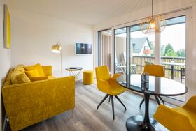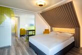 Im gemütlichen Schlafzimmer mit eigenem Balkon finden Sie ein komfortables Boxspringbett (160x200) sowie adäquate Staumöglichkeiten. Besondere und nachhaltige Materialien verschönern Ihren Schlaf und lassen Sie geborgen fühlen.