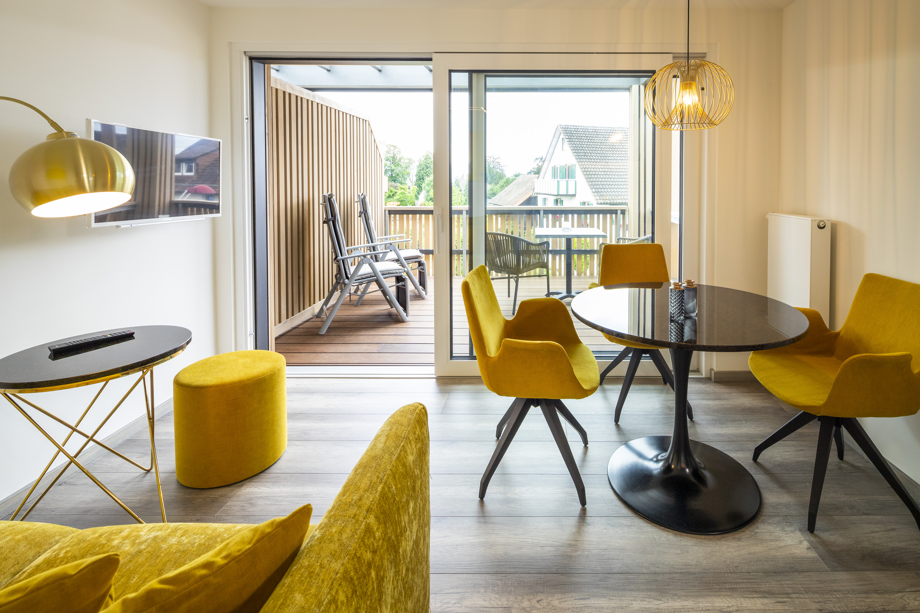 Auch im Wohn- und Essbereich haben wir sehr viel Wert auf klare Linien und Farbgebung als auch auf hochwertige und ökologische Materialien gelegt. Esstisch und Couchtisch sind z.B. aus recycelten Glasflaschen. Ein gemütliches Sofa lädt zum lesen der Urlaubslektüre ein.