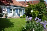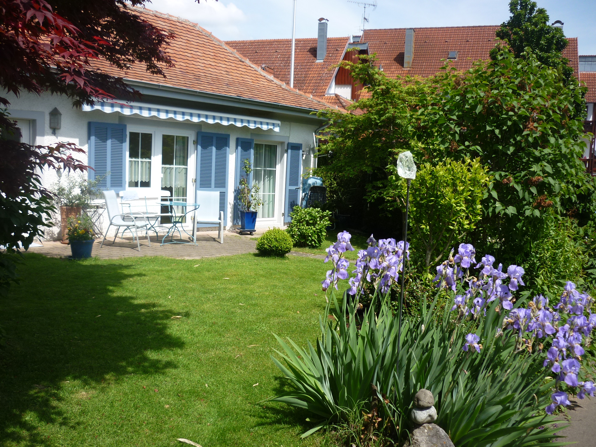 Im 1 OG, schöne Wohnküche mit Balkon, Schlafzimmer mit Doppelbett, Wohnzimmer mit sep. Schlafgelegenheit. Liegestühle und Sitzgelegenheit im großen Garten mit Pergola,