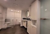 • Badezimmer mit großer begehbarer Regen-Dusche und Handbrause, Waschtisch und Handtuchtrockner