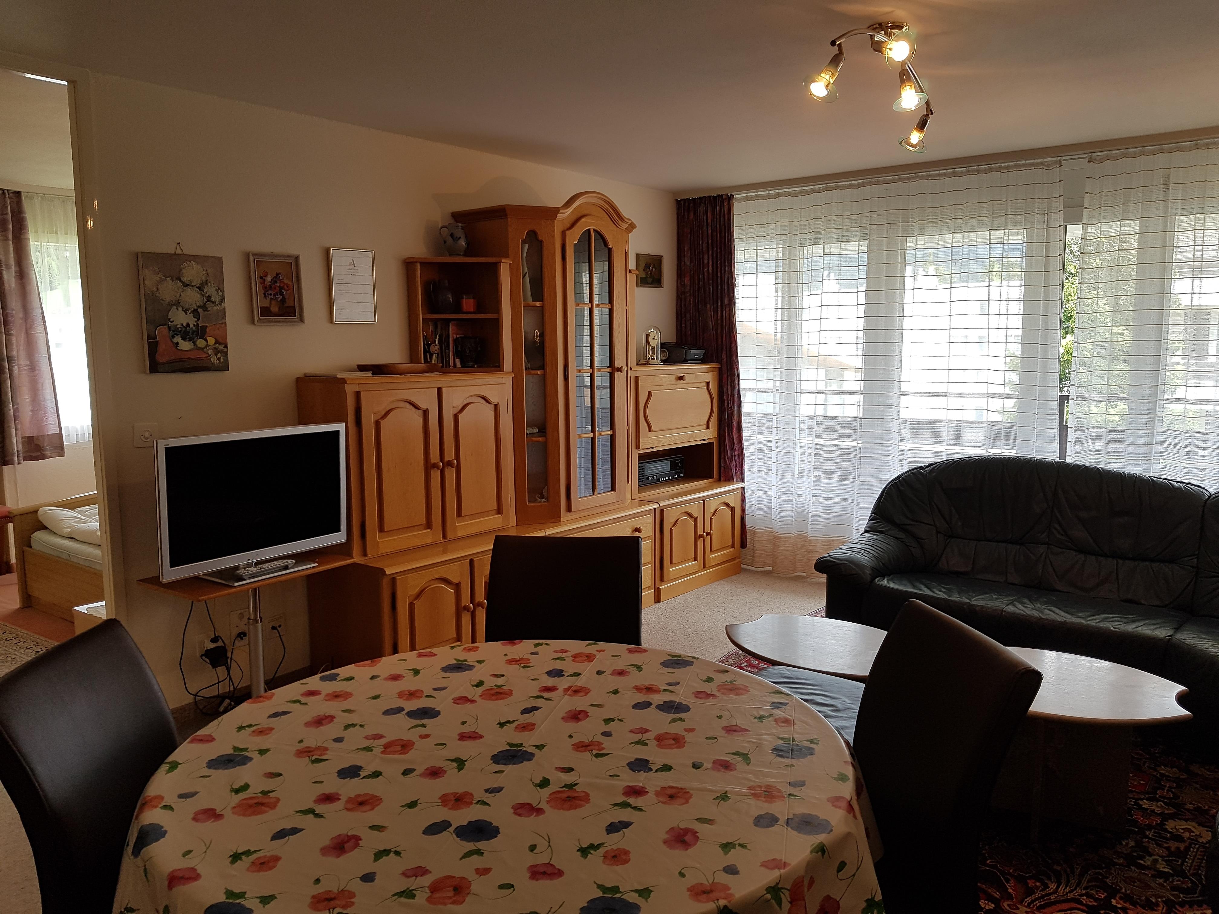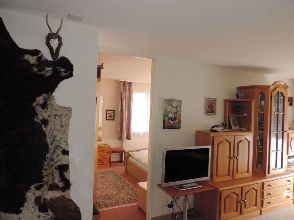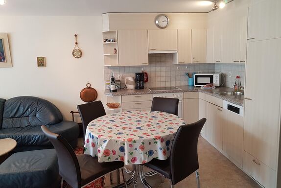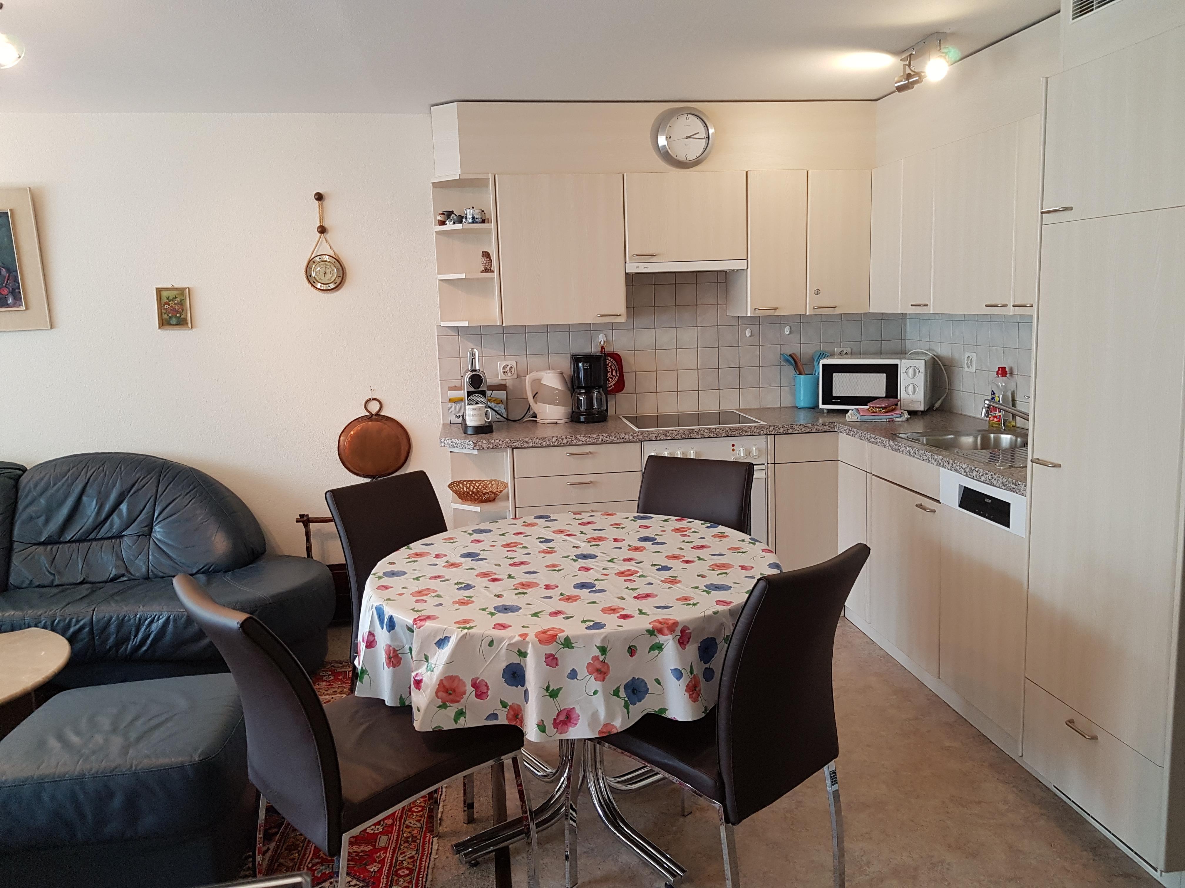 4. Stock, Wohn-/Esszimmer mit Radio, TV, Südbalkon, Küche mit Geschirrspüler und Backofen, zwei Doppelzimmer (1x plus 1 Notbett), Bad/Lavabo, WC/Lavabo, Gratis-W-Lan, Waschmaschine/Tumbler, Lift, Skiraum, Garagenplatz Nr. 53.