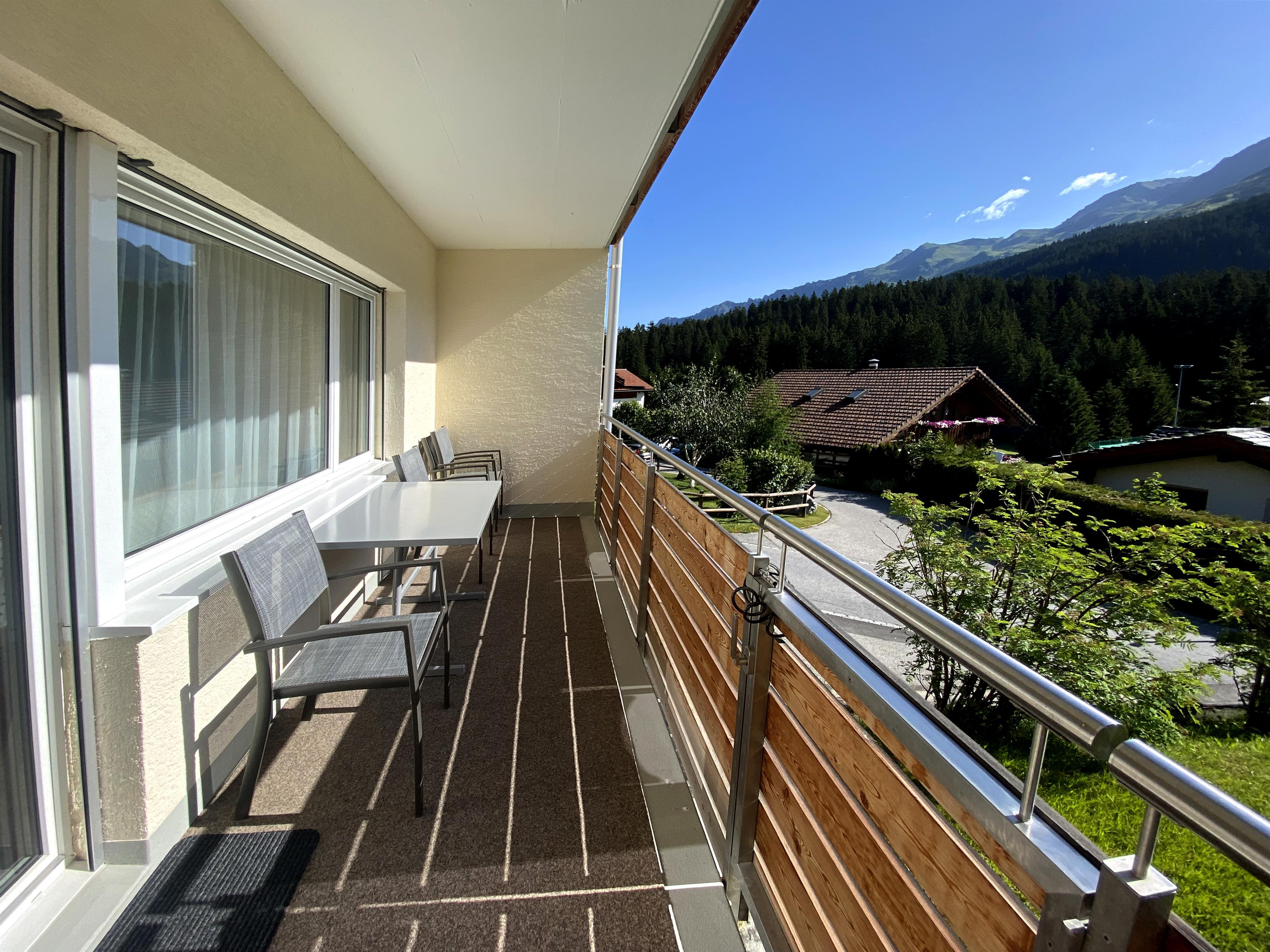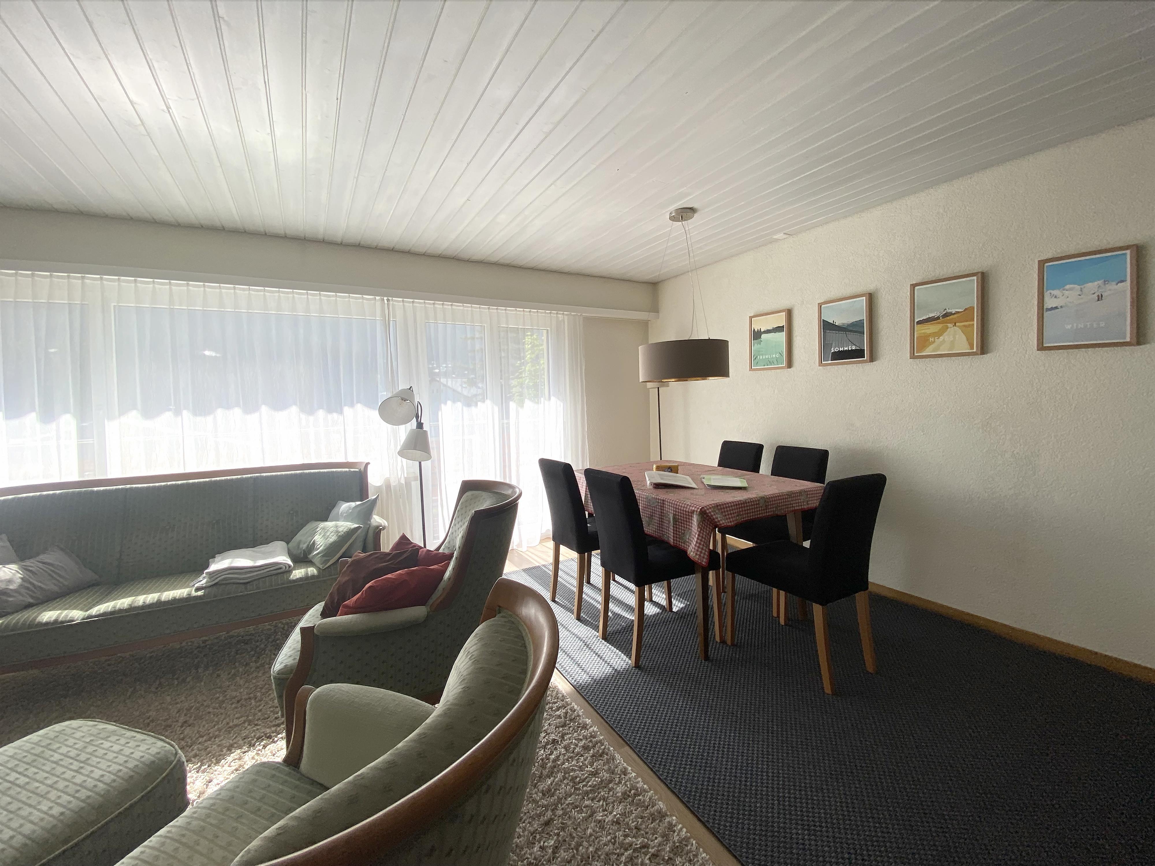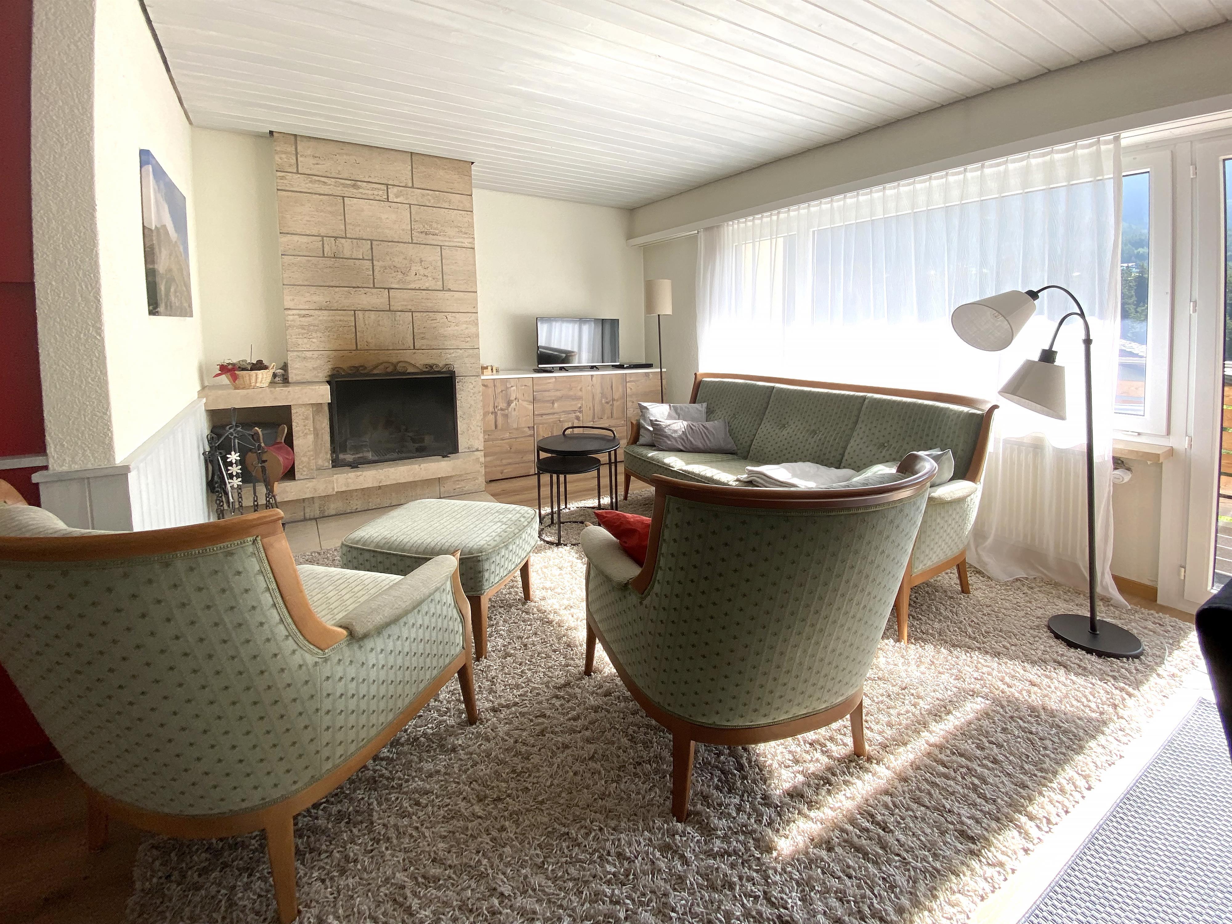 Gut möbilierte, geräumige Wohnung mit separater Küche, Cheminée, TV, DVD, Radio-CD, ein Doppelschlafzimmer, ein Dreibettzimmer und ein Sofabett im Wohnzimmer, Bad/WC + separates WC. Ost- und südwest Balkone. 75 m2. Volles Bergpanorama auf der Ostseite. Ski-/Wanderschuhraum, eigenes Skifach.