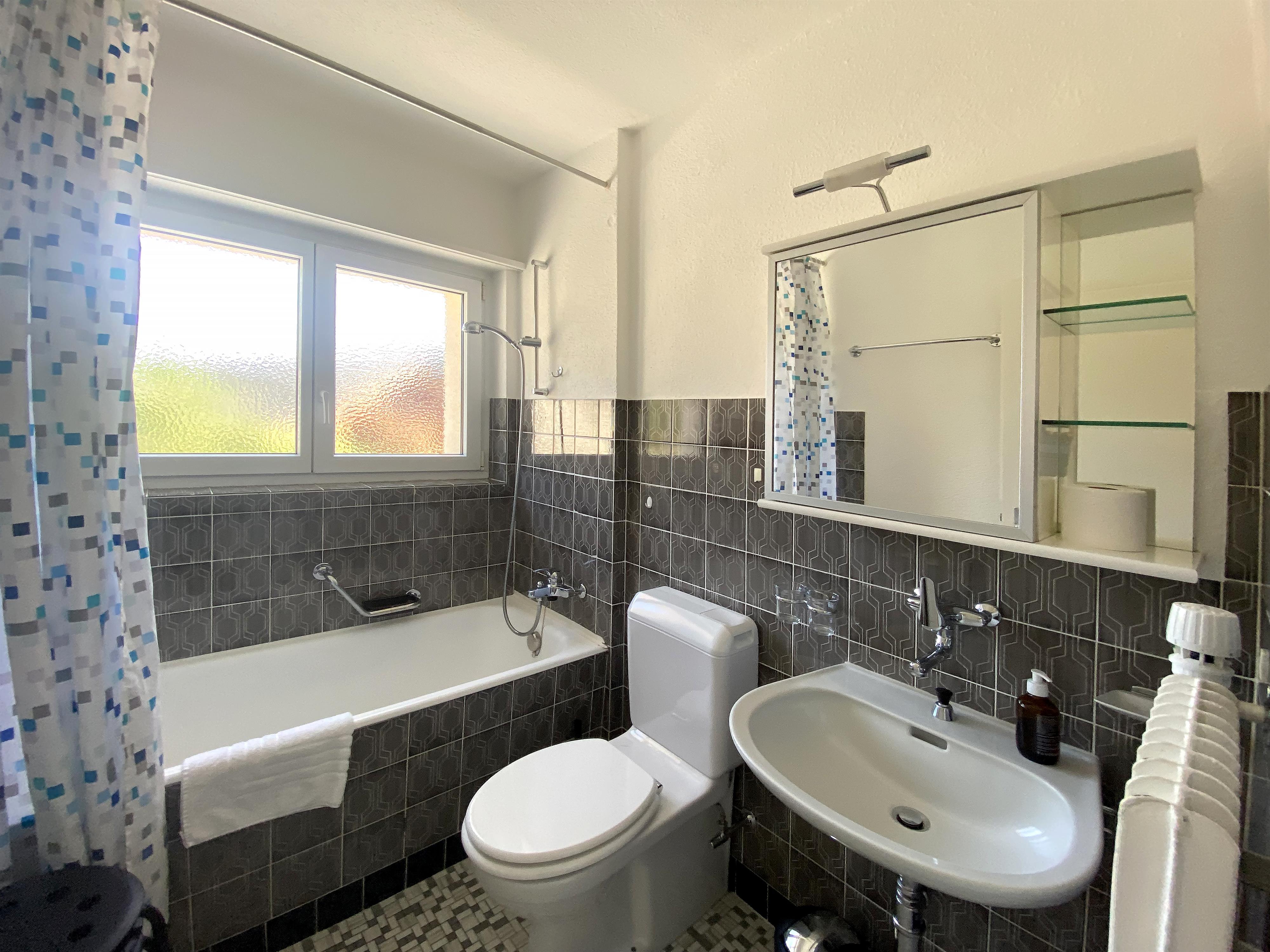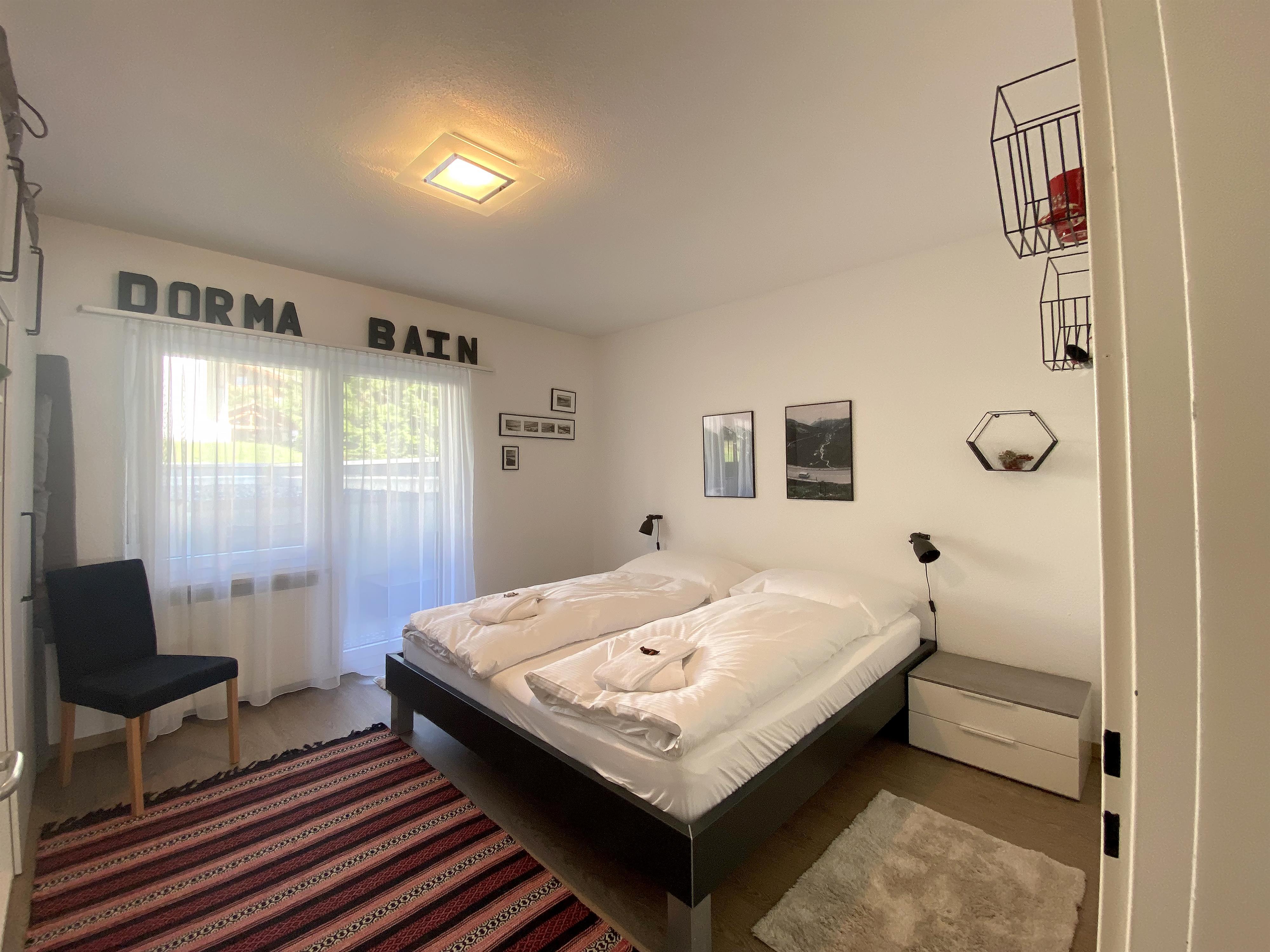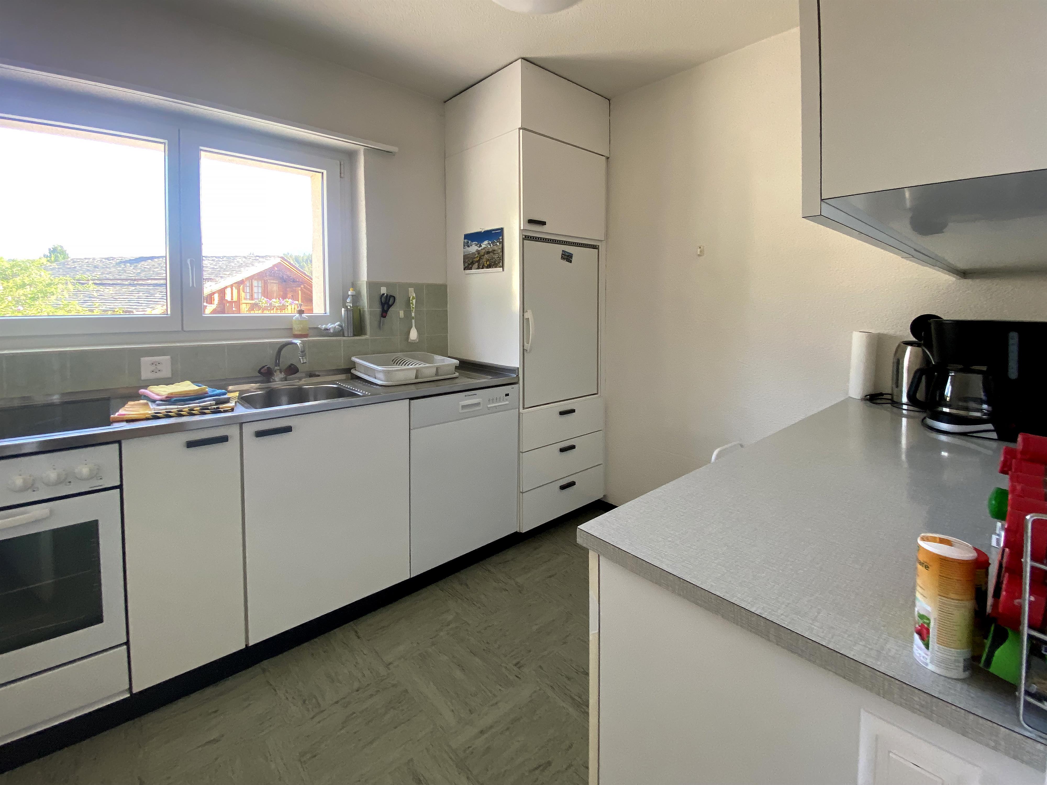 Gut möbilierte, geräumige Wohnung mit separater Küche, Cheminée, TV, DVD, Radio-CD, ein Doppelschlafzimmer, ein Dreibettzimmer und ein Sofabett im Wohnzimmer, Bad/WC + separates WC. Ost- und südwest Balkone. 75 m2. Volles Bergpanorama auf der Ostseite. Ski-/Wanderschuhraum, eigenes Skifach.