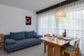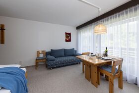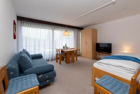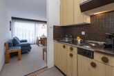 1-Zimmer-Wohnung (3. Etage), Wohnschlafzimmer mit 2 Betten, SAT-TV, Radio u. Direktwahltelefon, Kochnische (ohne Backofen), Bad/WC, möbilierter Ostbalkon.