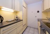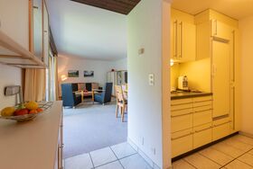 2-Zimmer-Wohnung (3. Etage), Doppelschlafzimmer, Wohnzimmer mit 2 Schlafgelegenheiten (Sofabett), SAT-TV, Radio u. Direktwahltelefon, halboffene Küche, Bad/WC, möbilierter Südbalkon.