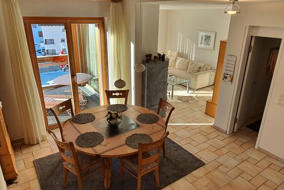 Im unteren Geschoss erwartet Sie ein lichtdurchflutetes, grosszügiges Wohnzimmer mit Zugang zur sonnigen Südwest-Terrasse – perfekt zum Entspannen im Sommer wie im Winter. Die moderne, offene Küche ist mit einem hochwertigen Kaffeevollautomaten ausgestattet. Im angrenzenden Essbereich finden bis zu 8 Personen bequem Platz. Ein Cheminée sorgt an kühlen Tagen für eine behagliche Atmosphäre.