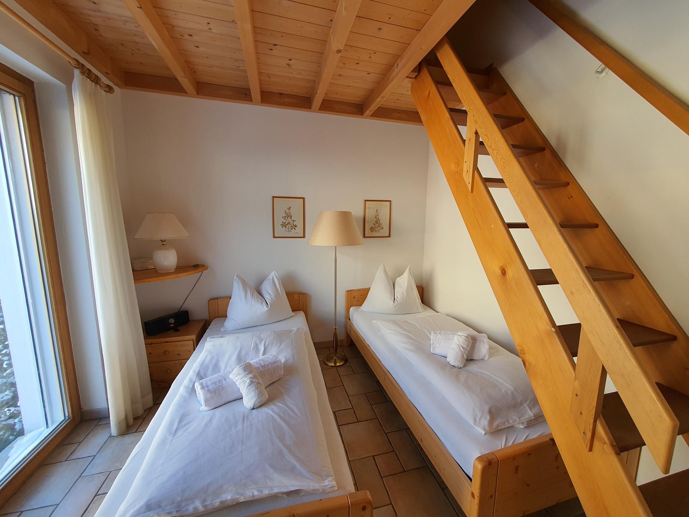 Ebenfalls auf dieser Etage befindet sich ein Schlafzimmer mit zwei Einzelbetten und offener Galerie. Auf der Galerie liegt das Maisonette-Schlafzimmer mit zwei weiteren Einzelbetten – ideal für Kinder oder Jugendliche. Zudem steht ein separates Gästebad mit WC zur Verfügung.