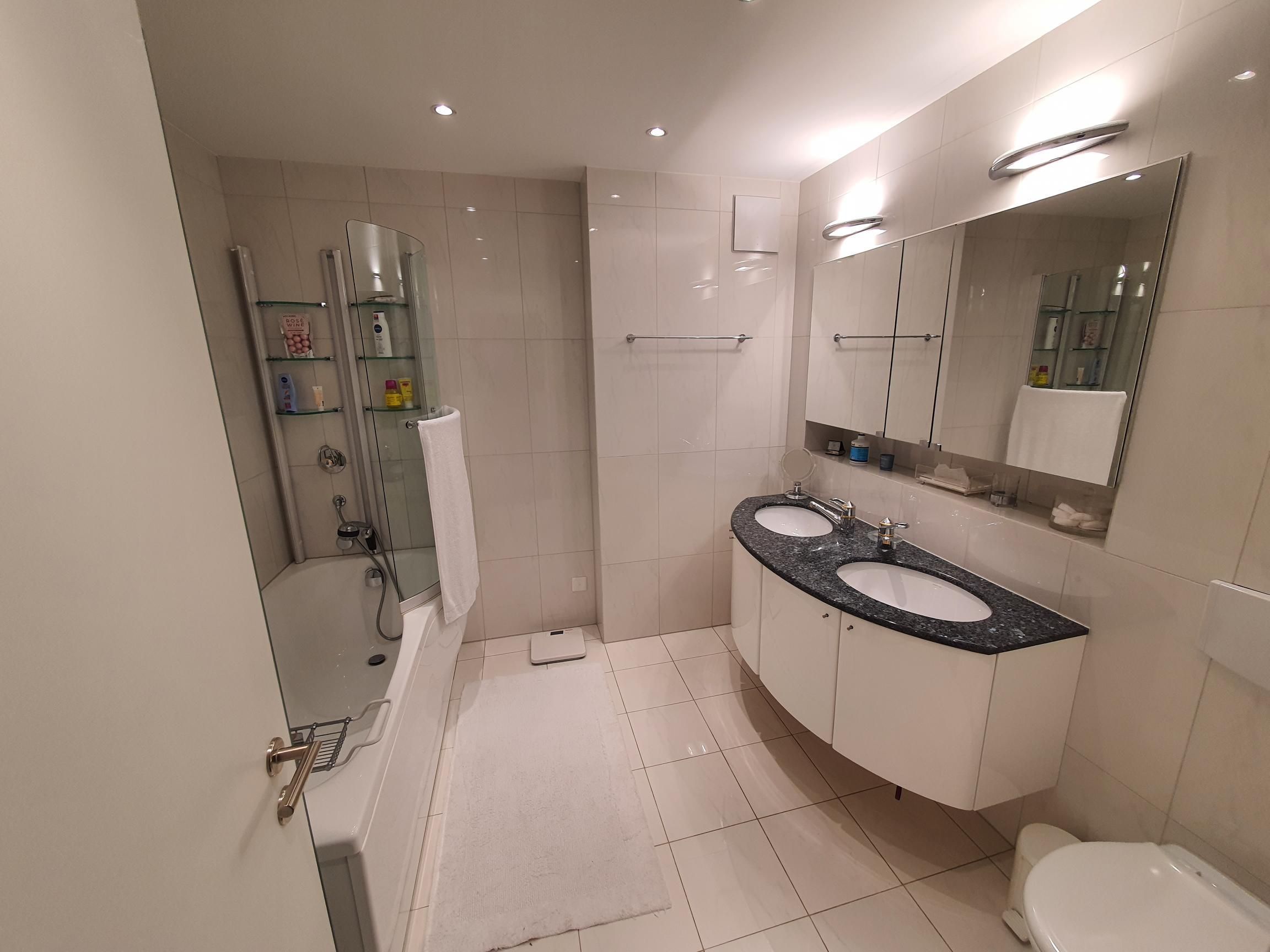 Im oberen Stockwerk befinden sich zwei grosszügige Schlafzimmer mit Doppelbetten sowie ein Badezimmer mit Badewanne, WC und einem integrierten Waschturm.
