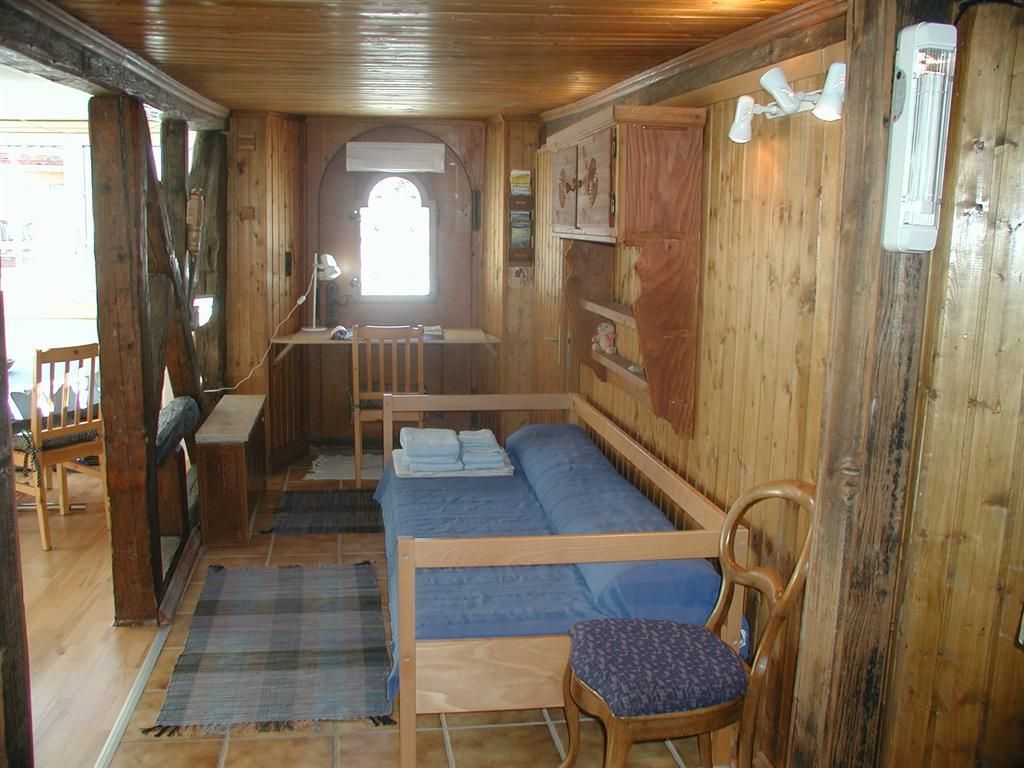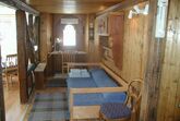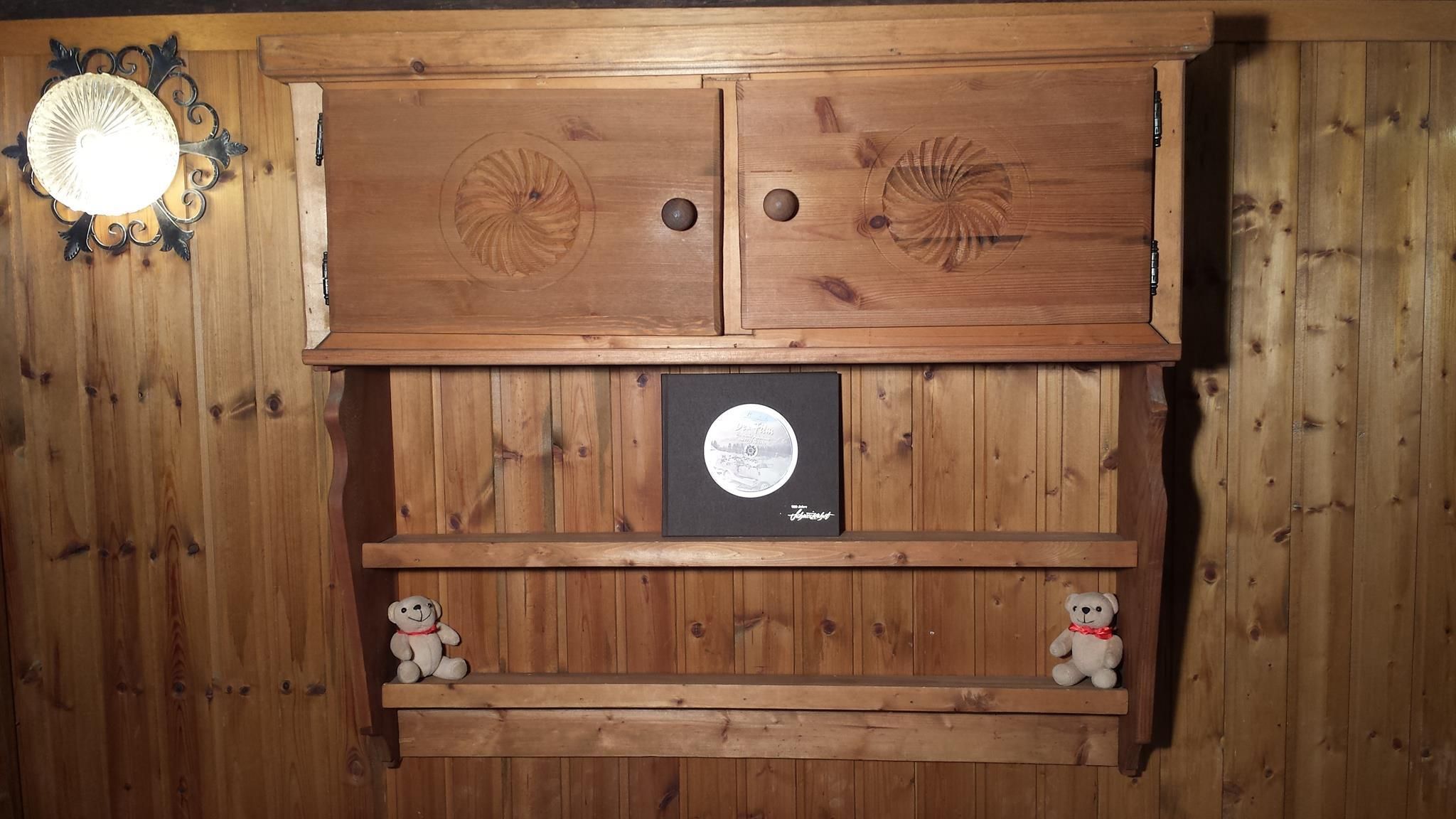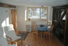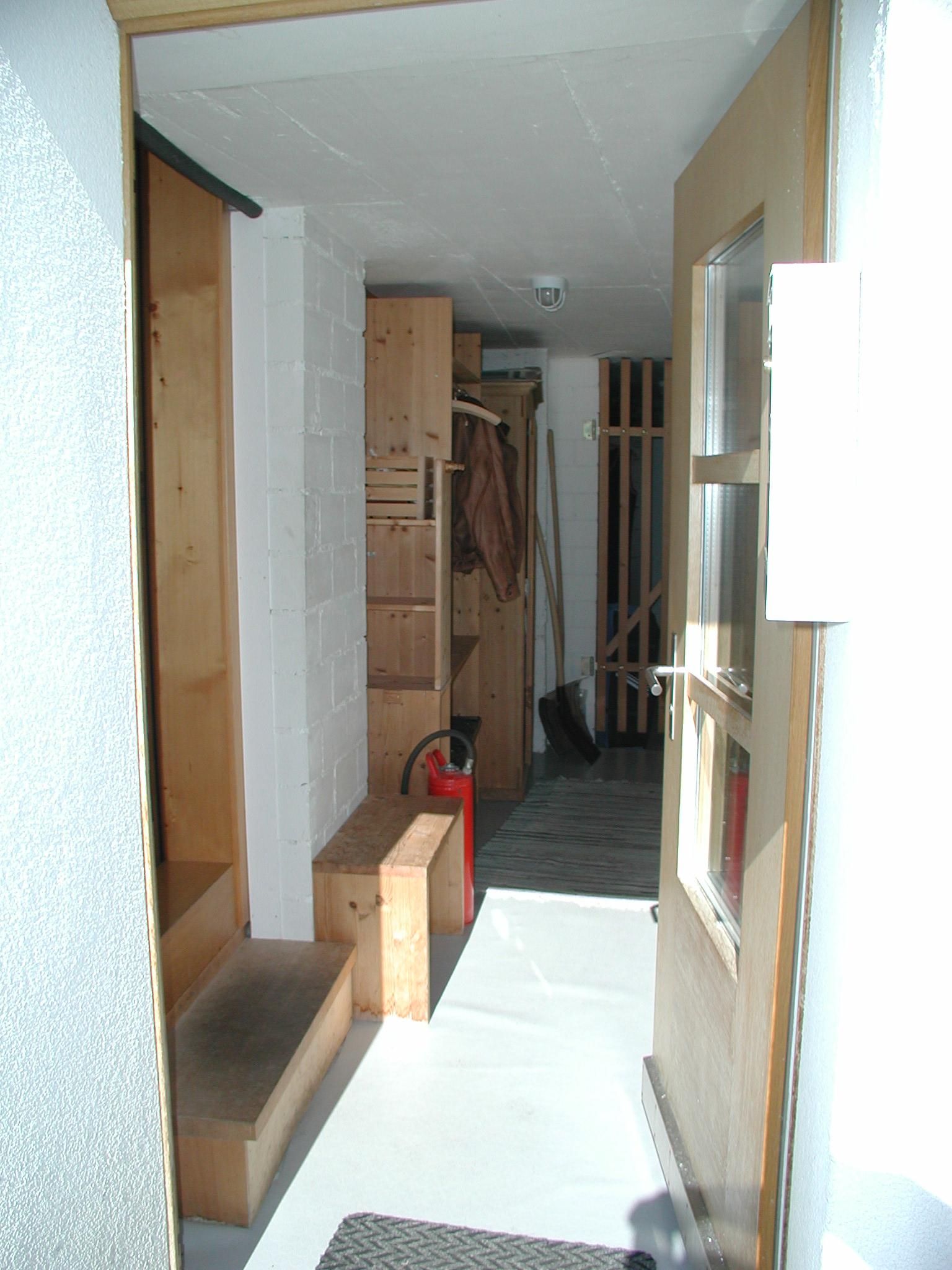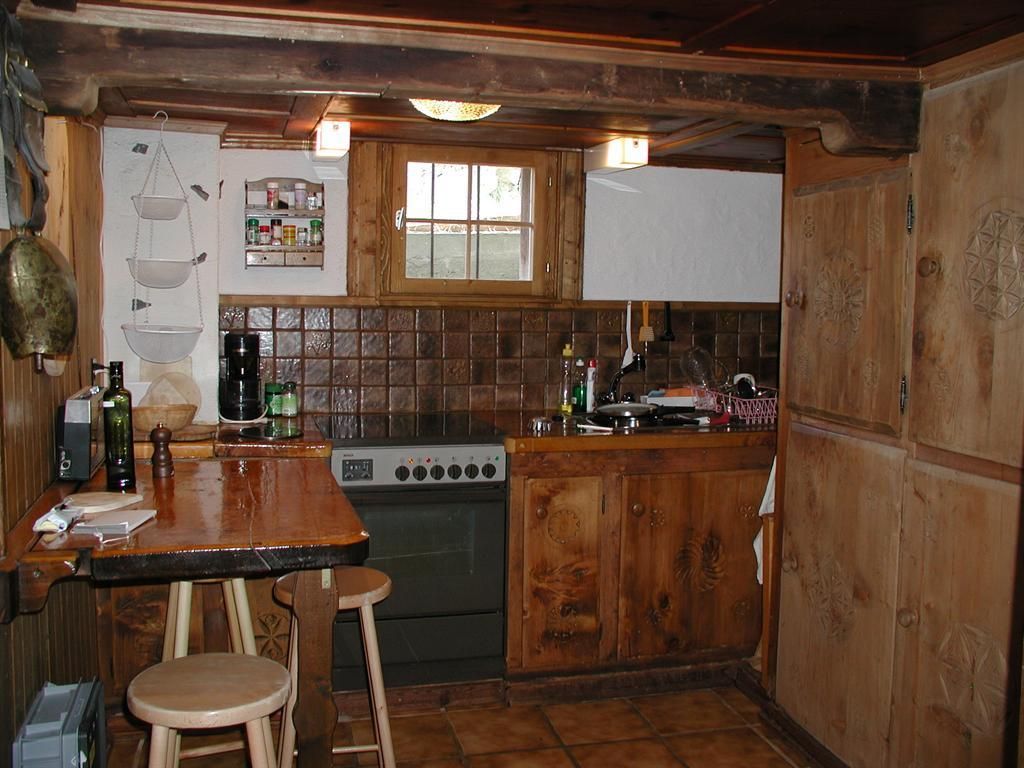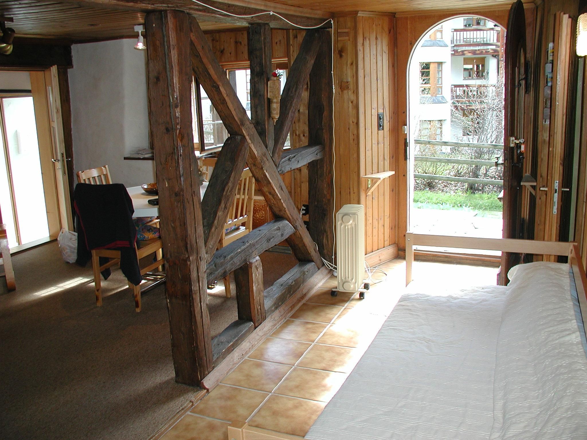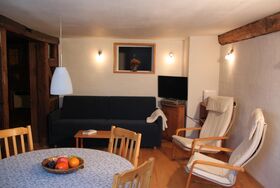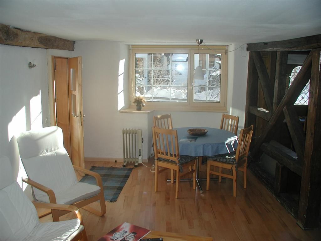 Eingangskorridor mit Garderobe, Schuhablage und Schrank, in über 200-jährigem Walserhaus. Wohn/Esszimmer. Kleines Schlafzimmer mit franz. Bett (160cm) und Waschbecken. Kleines Schlafzimmer mit 2 Betten und Fenster nur zum Wohnzimmer. Badezimmer (Wanne mit Duschvorhang, WC, Waschbecken) mit Bodenheizung. Die Wohnung ist zum Teil in Holz getäfert, mit vielen Details, sehr reichhaltige Kücheneinrichtung/Geschirr. Geschirrspüler, Mikrowelle, Glaskeramikherd, Nespressomaschine, Waschmaschine. Einige tiefe Balken mit geringer Stehhöhe (zirka 175). WLAN, Swisscom-TV.