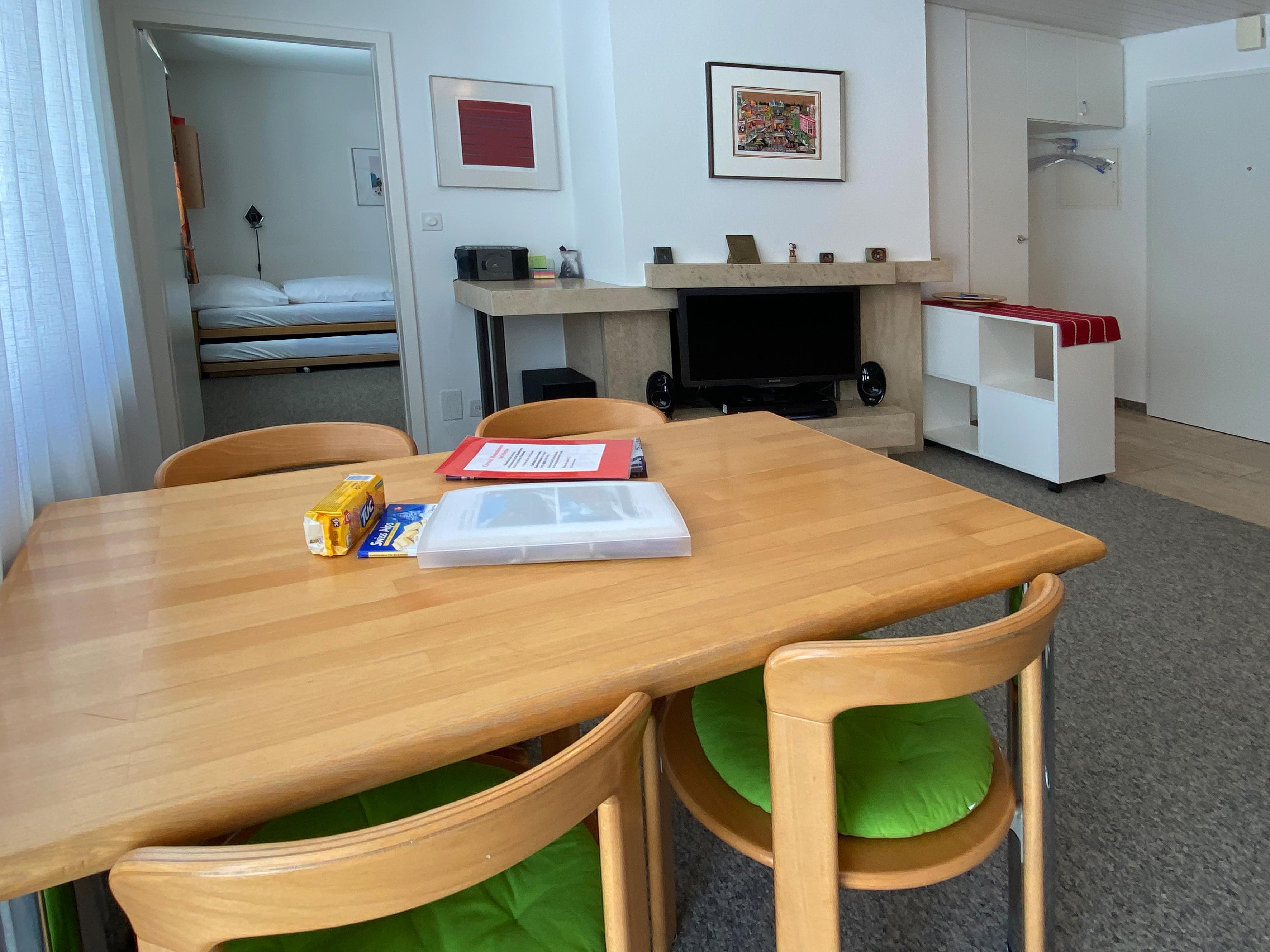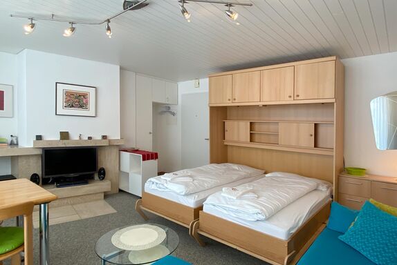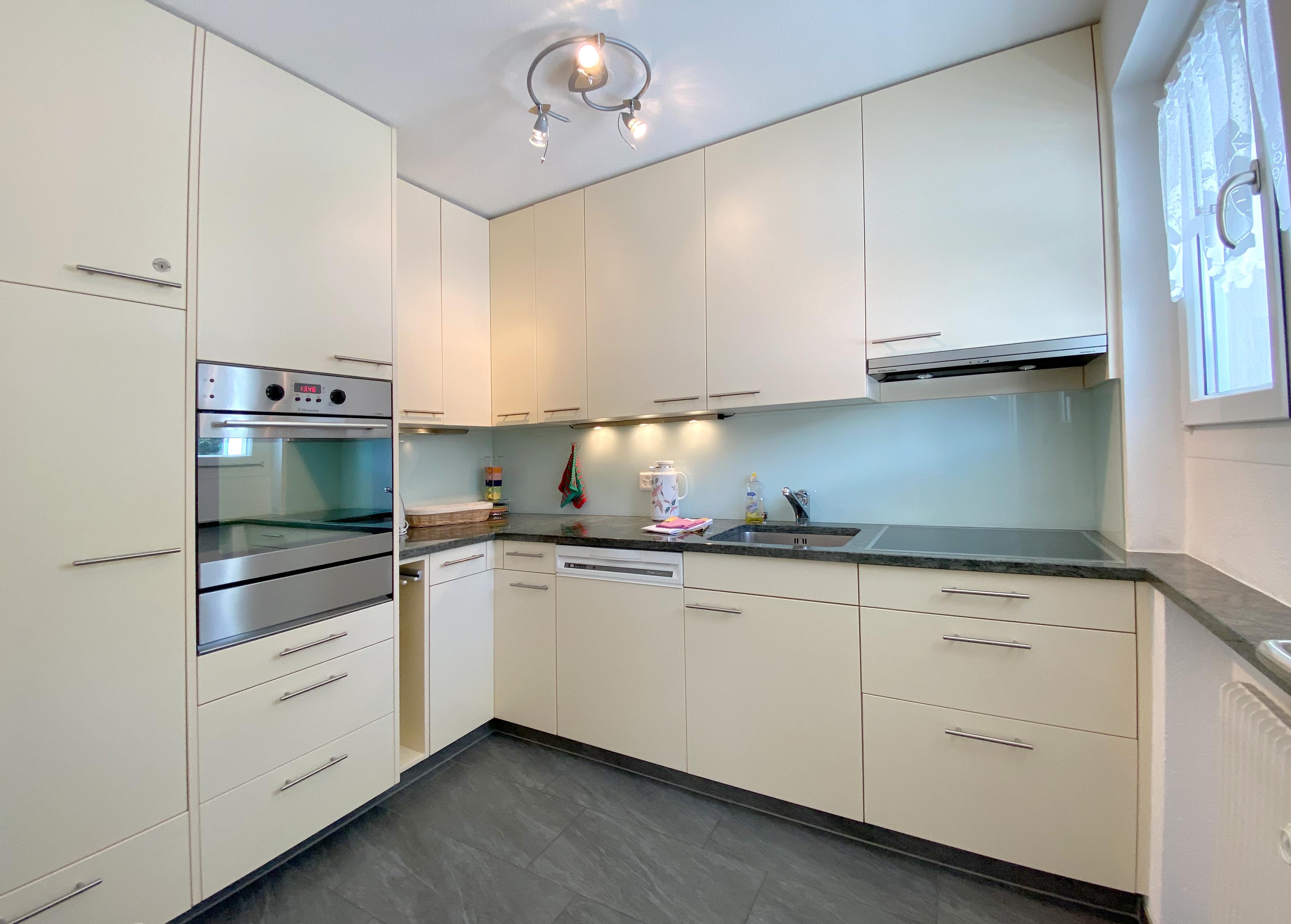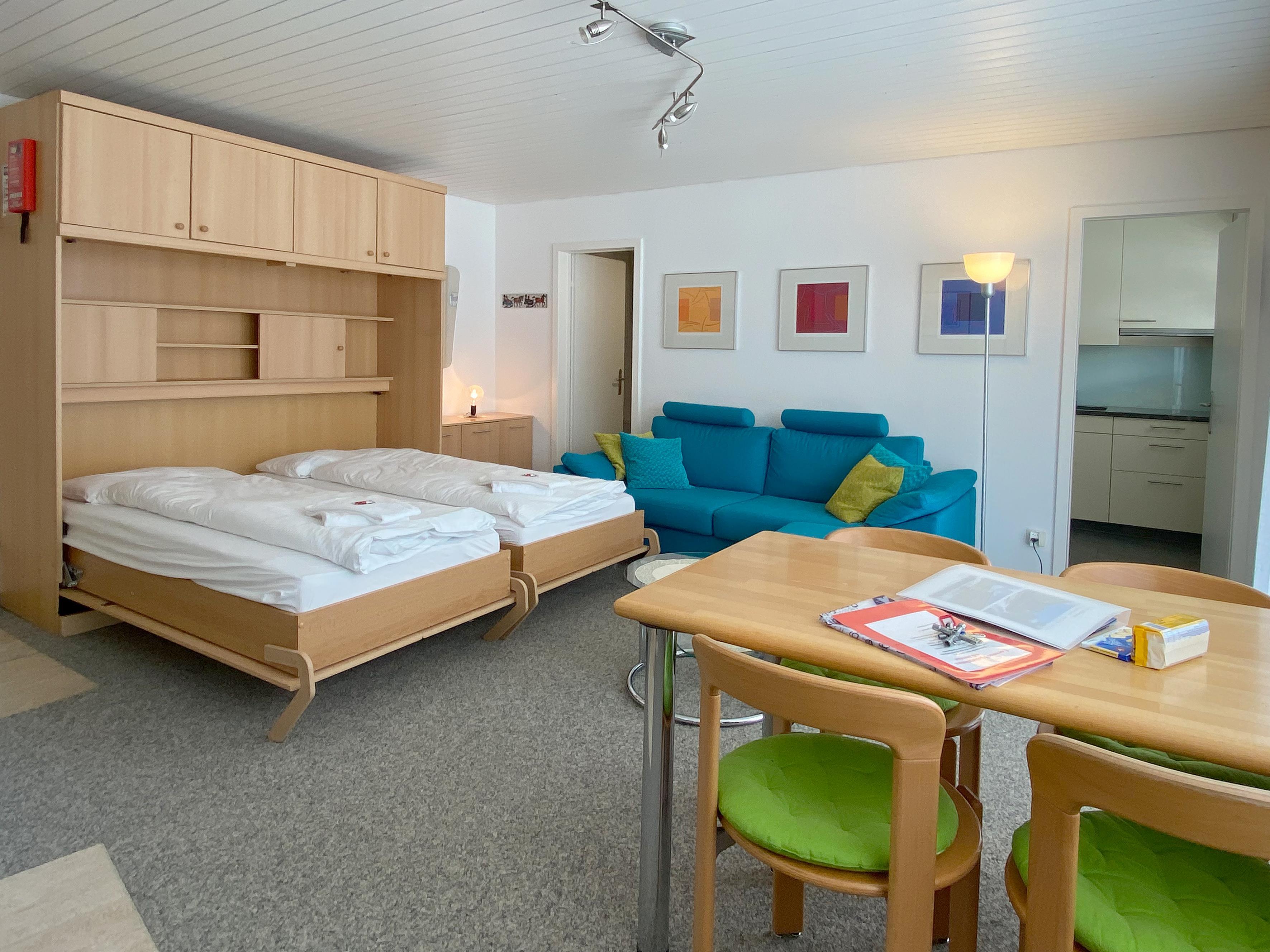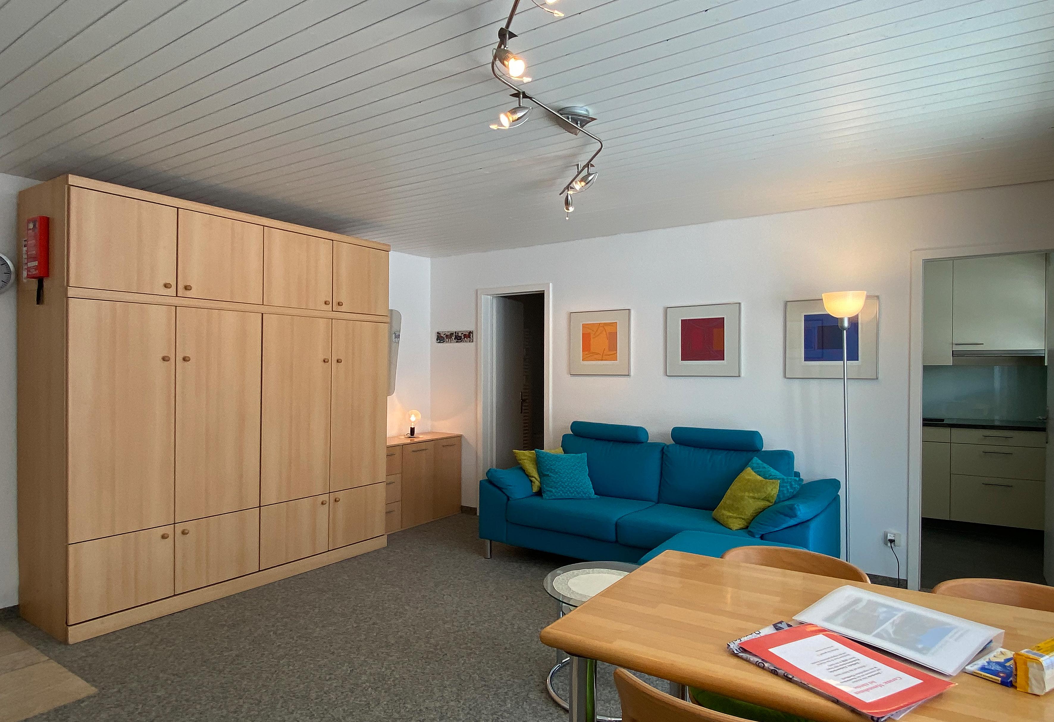 2,5-Zimmer Wohnung mit einem Wohn-/Esszimmer, separater Küche mit Geschirrspüler und Kaffeemaschine, ein Schlafzimmer, Doppel Kleiderschrankbett im Wohnzimmer, Bad/WC.