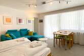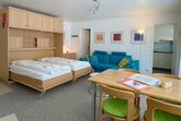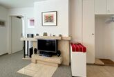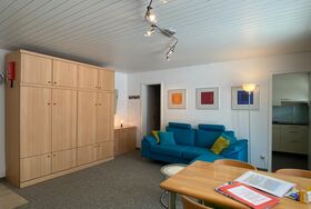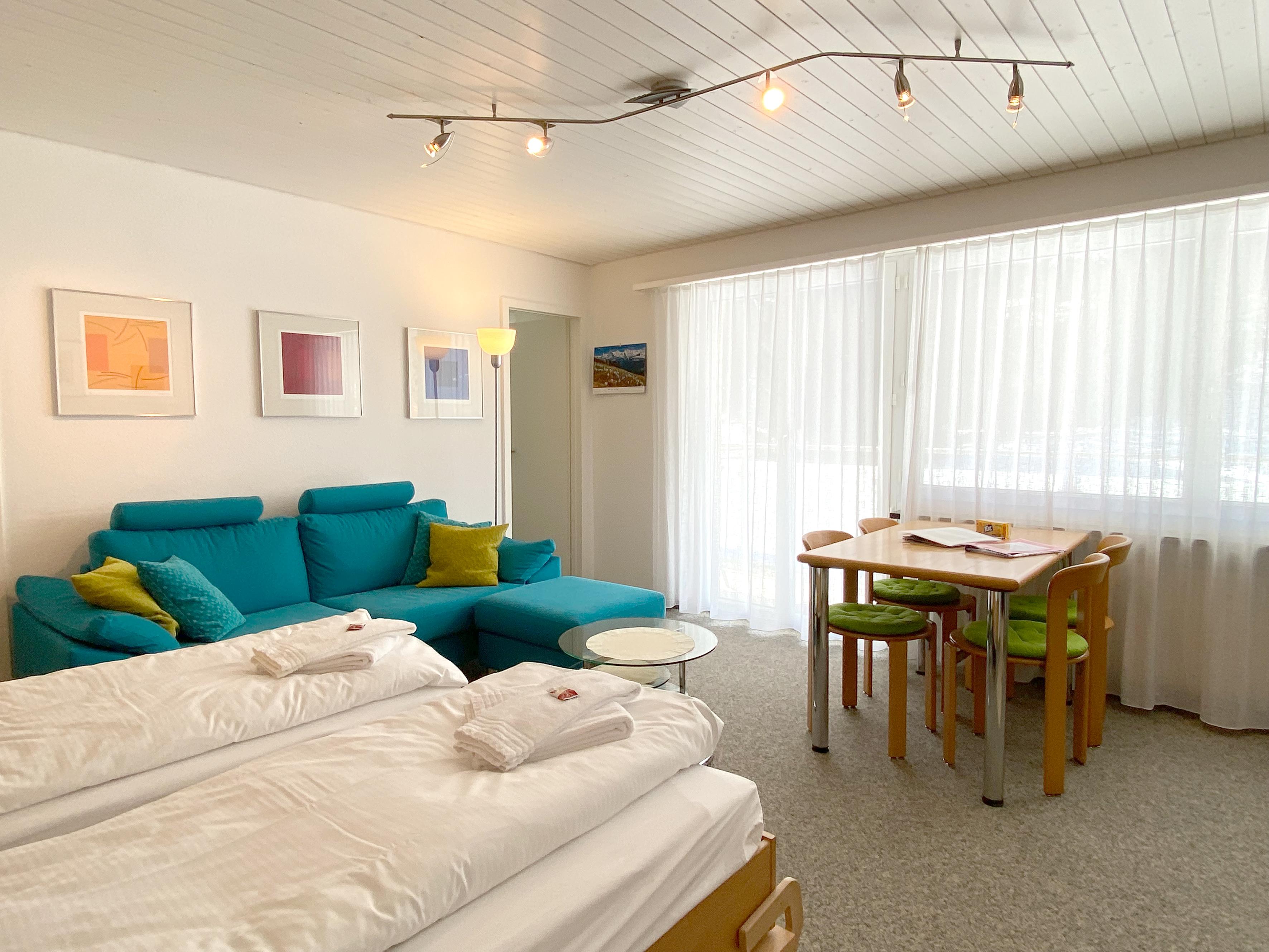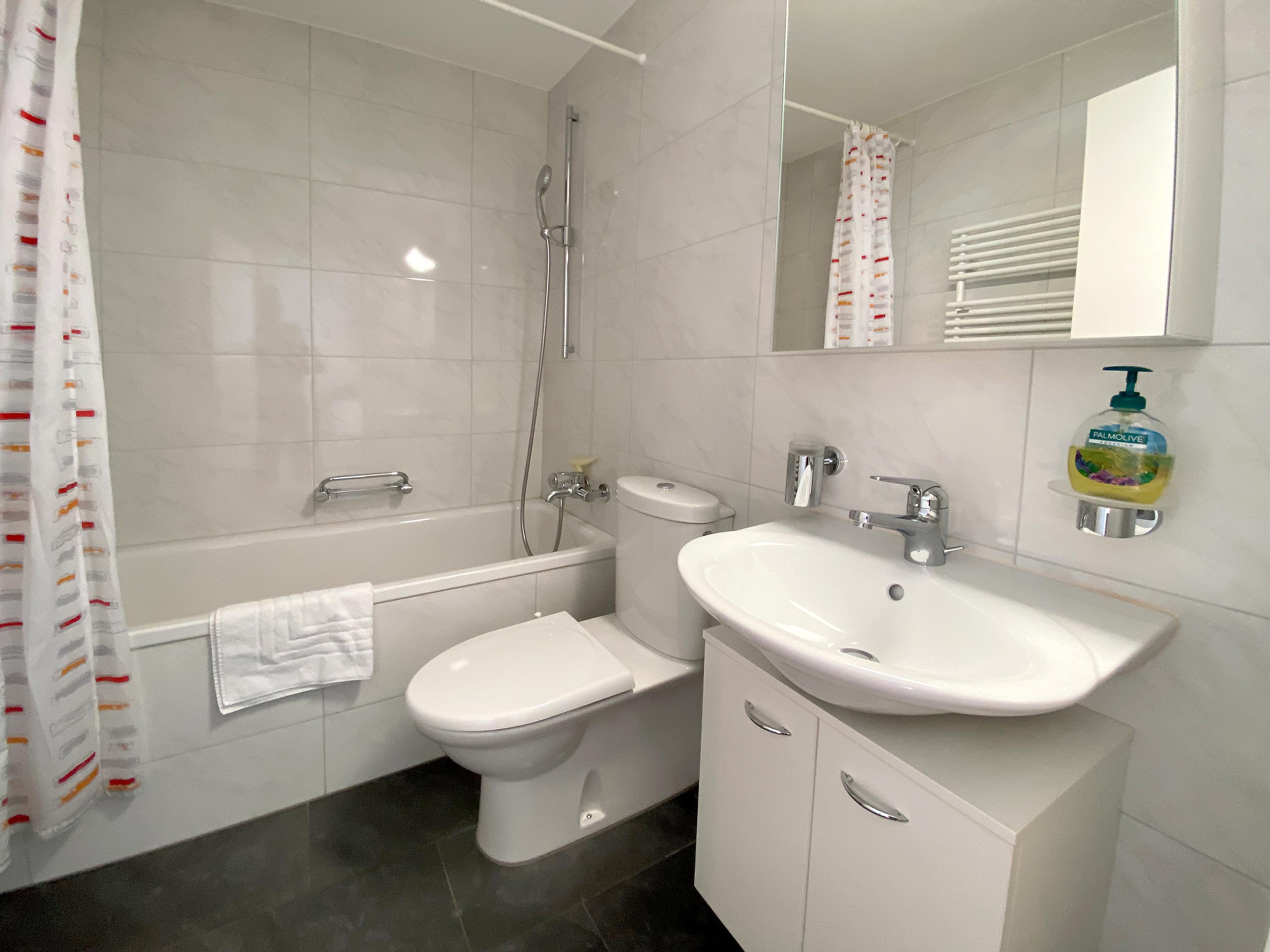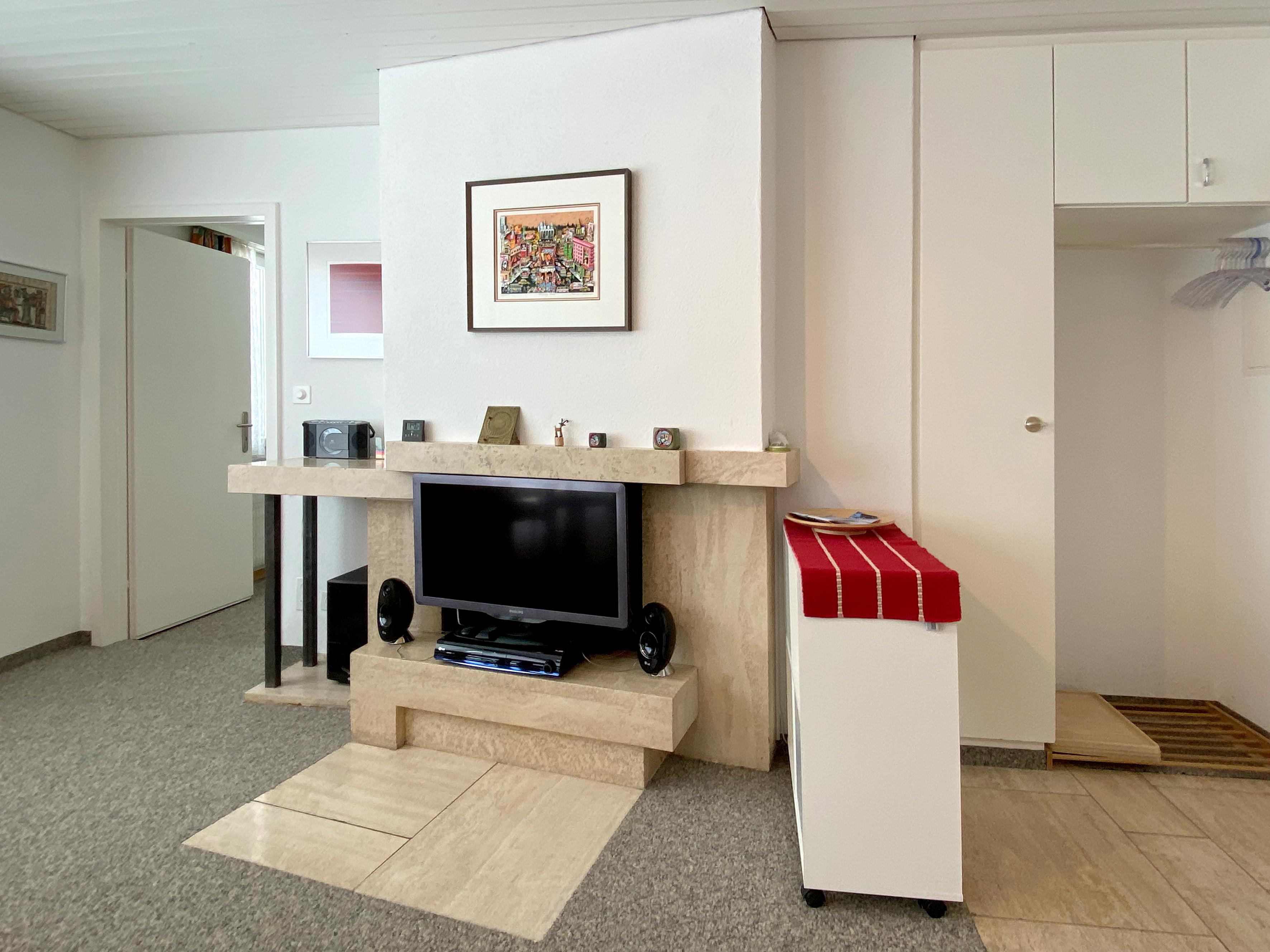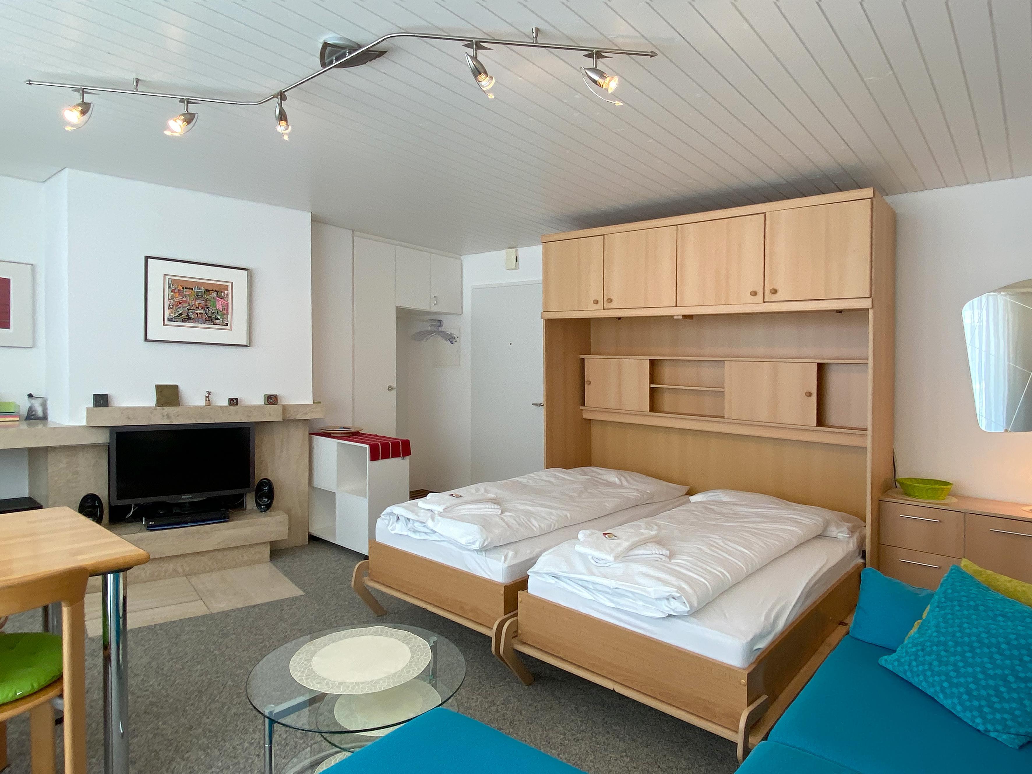 2,5-Zimmer Wohnung mit einem Wohn-/Esszimmer, separater Küche mit Geschirrspüler und Kaffeemaschine, ein Schlafzimmer, Doppel Kleiderschrankbett im Wohnzimmer, Bad/WC.