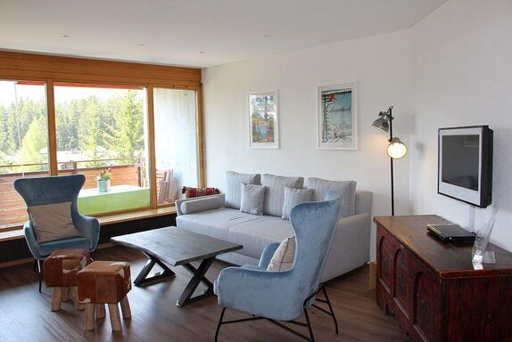 Renovierte 2- Zimmer-Wohnung (ca. 51 m²) im Hauc Curtschin. Die Wohnung verfügt über ein grosses Wohnzimmer mit integrierter Einbauküche (Geschirrspüler, Backofen, Kühlschrank). Balkon, TV und W-Lan. Ein separates Schlafzimmer mit Doppelbett und Hochbett und zwei Schlafmöglichkeiten im Wohnzimmer (Sofabett). Die Wohnung darf jedoch mit max. 4 Personen belegt werden. Dusche/WC.