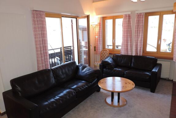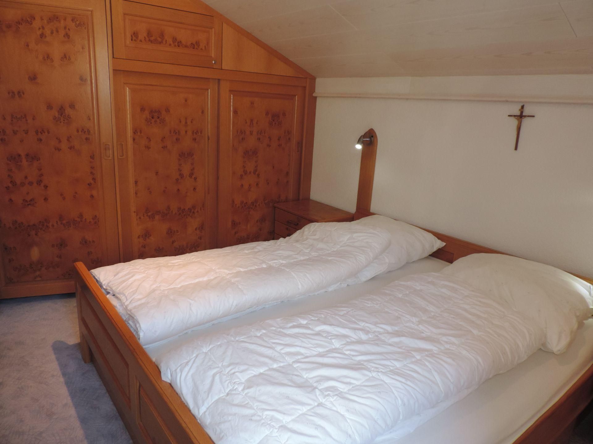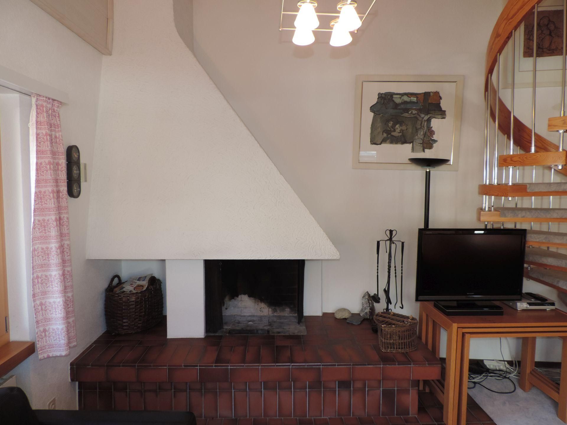 Eingang mit geschlossener Garderobe, Bad/WC/Lavabo, Küche, Esstisch mit 6 Stühlen, TV, Süd-Ostbalkon, Wendeltreppe zu oberen Schlafräumen, Schlafzimmer mit Doppelbett/Schrank