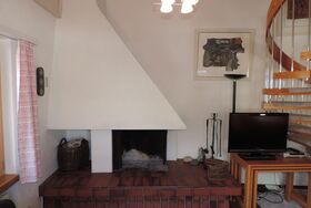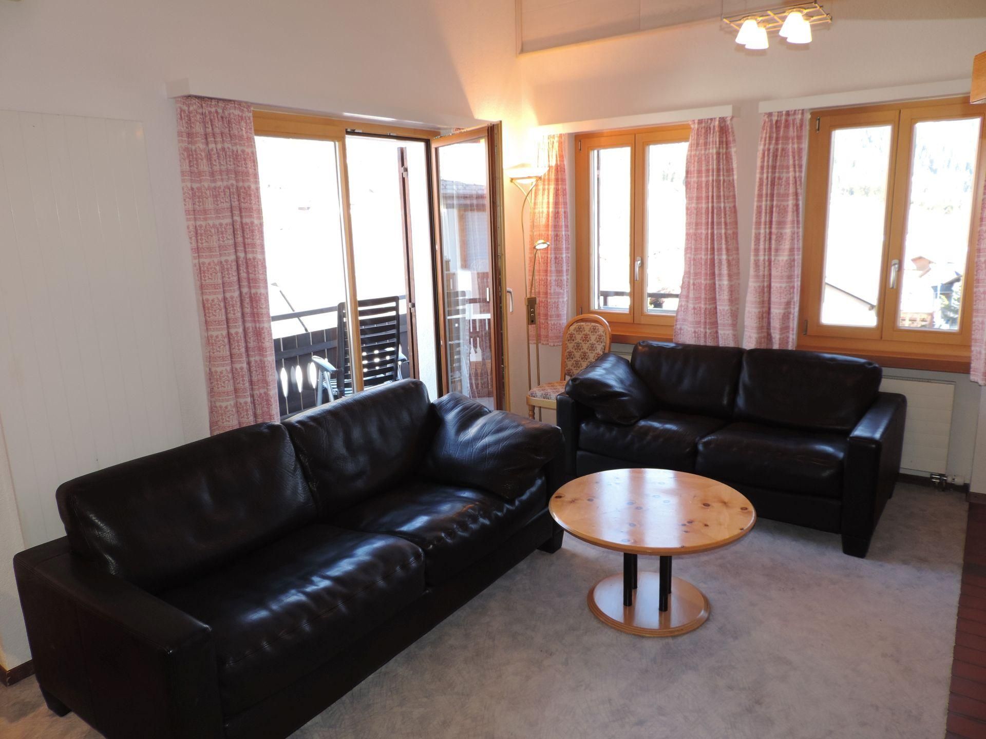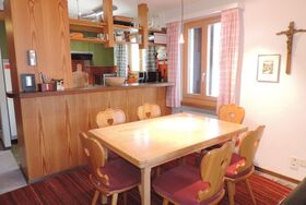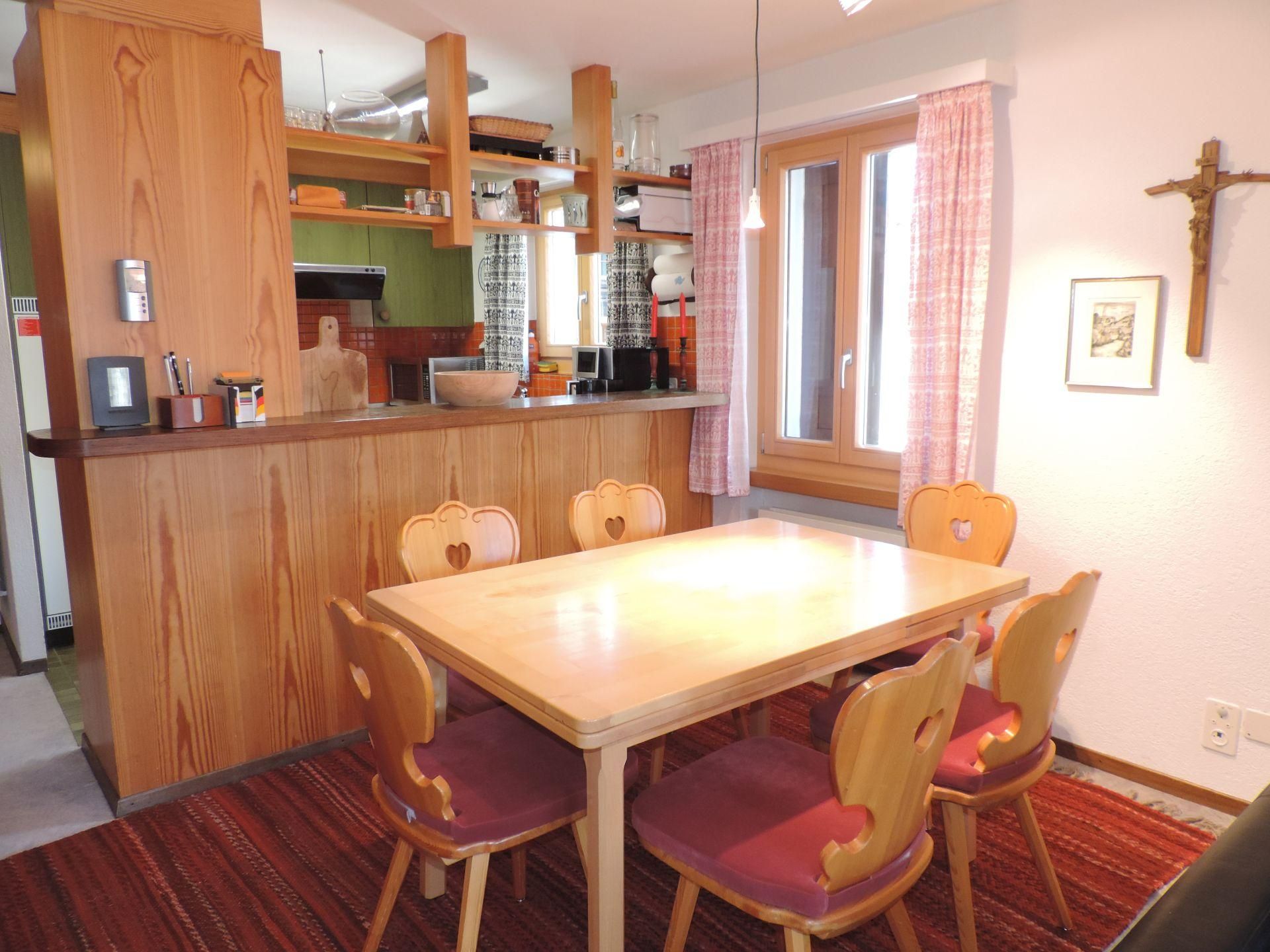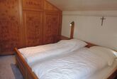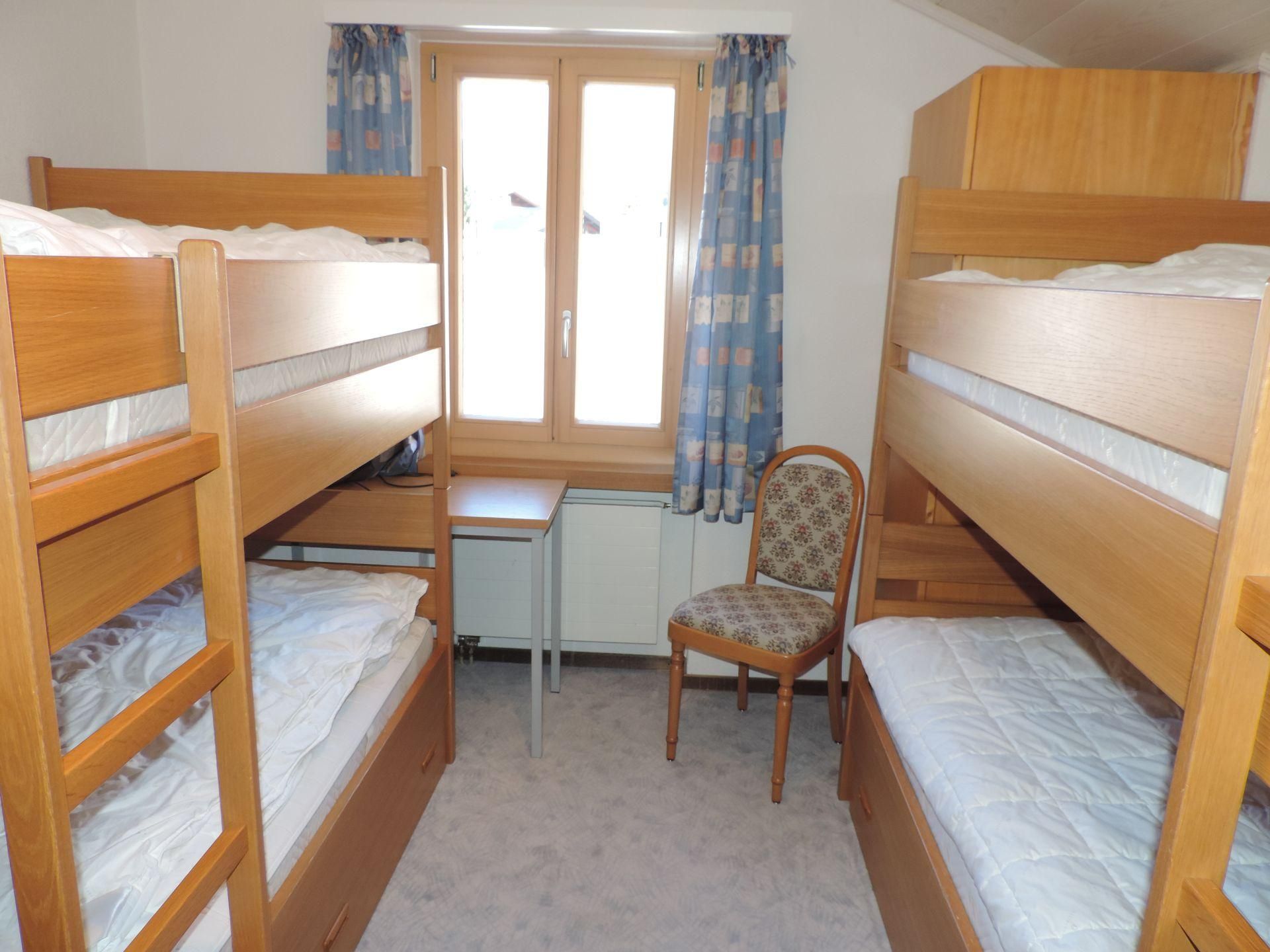 Eingang mit geschlossener Garderobe, Bad/WC/Lavabo, Küche, Esstisch mit 6 Stühlen, TV, Süd-Ostbalkon, Wendeltreppe zu oberen Schlafräumen, Schlafzimmer mit Doppelbett/Schrank
