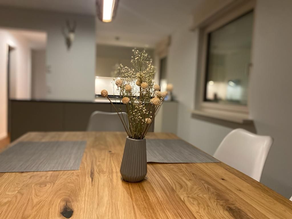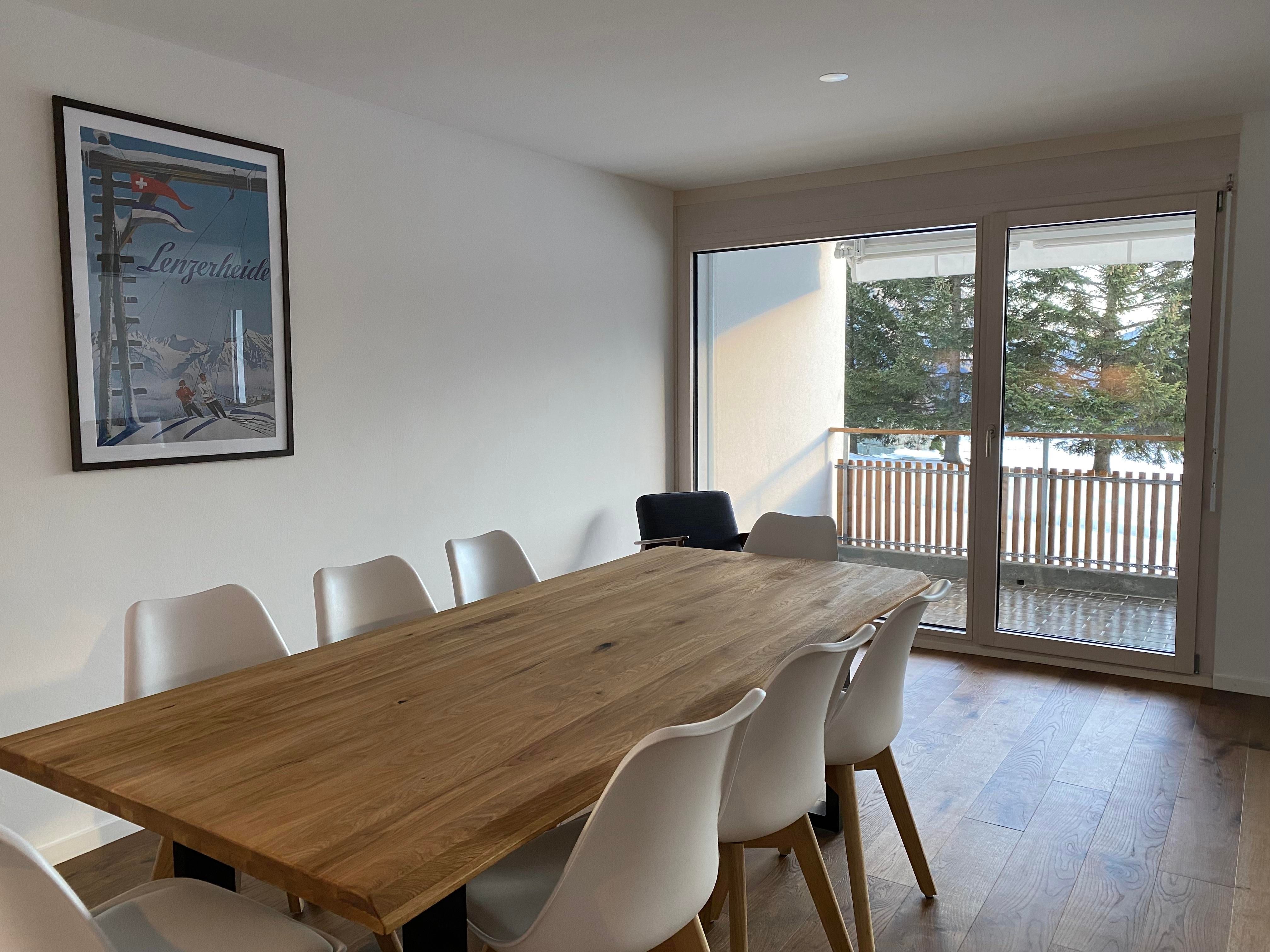 Stilvolle Küche mit modernsten Geräten (Geschirrspüler, grosser Kühlschrank, Induktionsherd mit eingebautem Dampfabzug), gemütlicher Kaminofen mit Panoramasicht, DAB-Radio, OLED-TV, WiFi, Parkplatz in der Garage, Balkon mit Bergblick. Grosszügige Küchenausstattung inklusive Kapsel-Kaffeemaschine, Racletteofen, Fondue-Set, etc. Im Haus befindet sich zudem ein Tischtenniszimmer und eine Sauna.