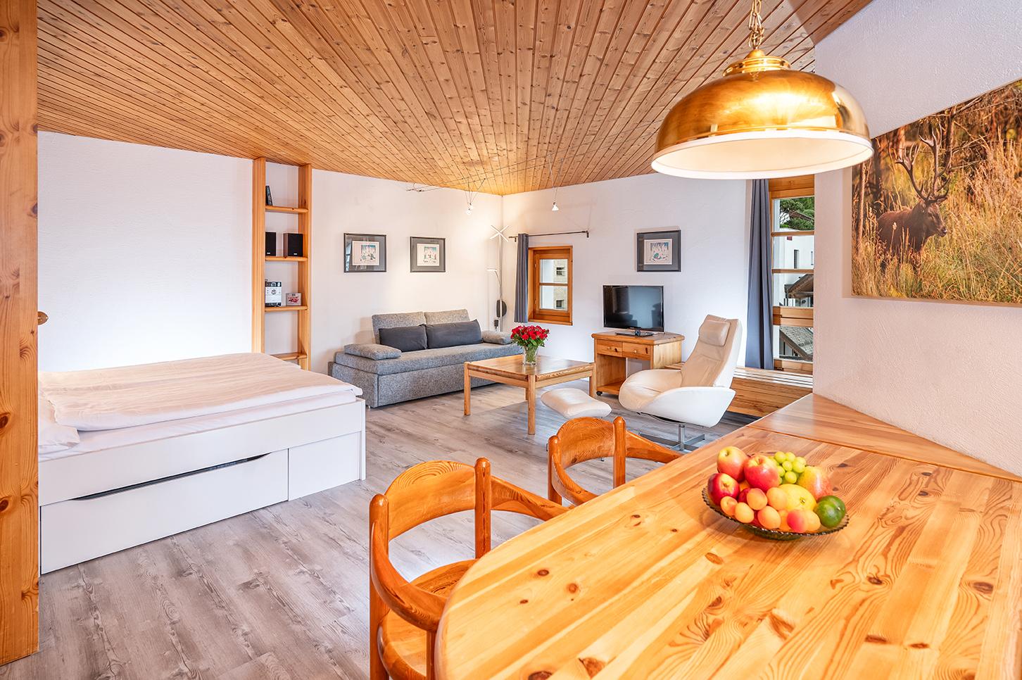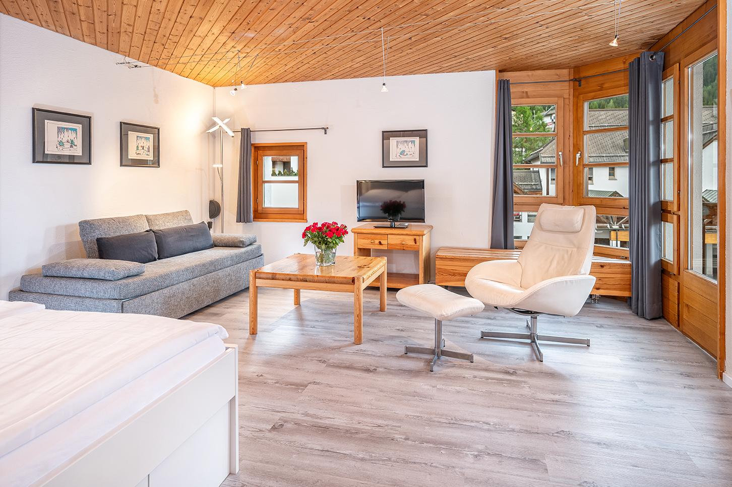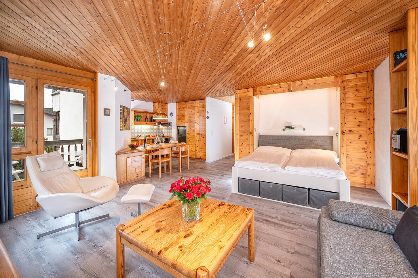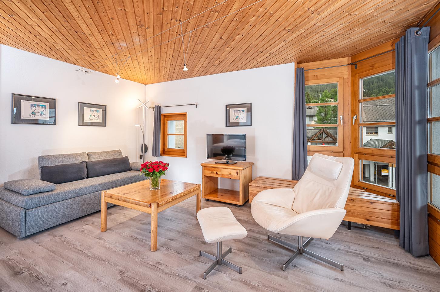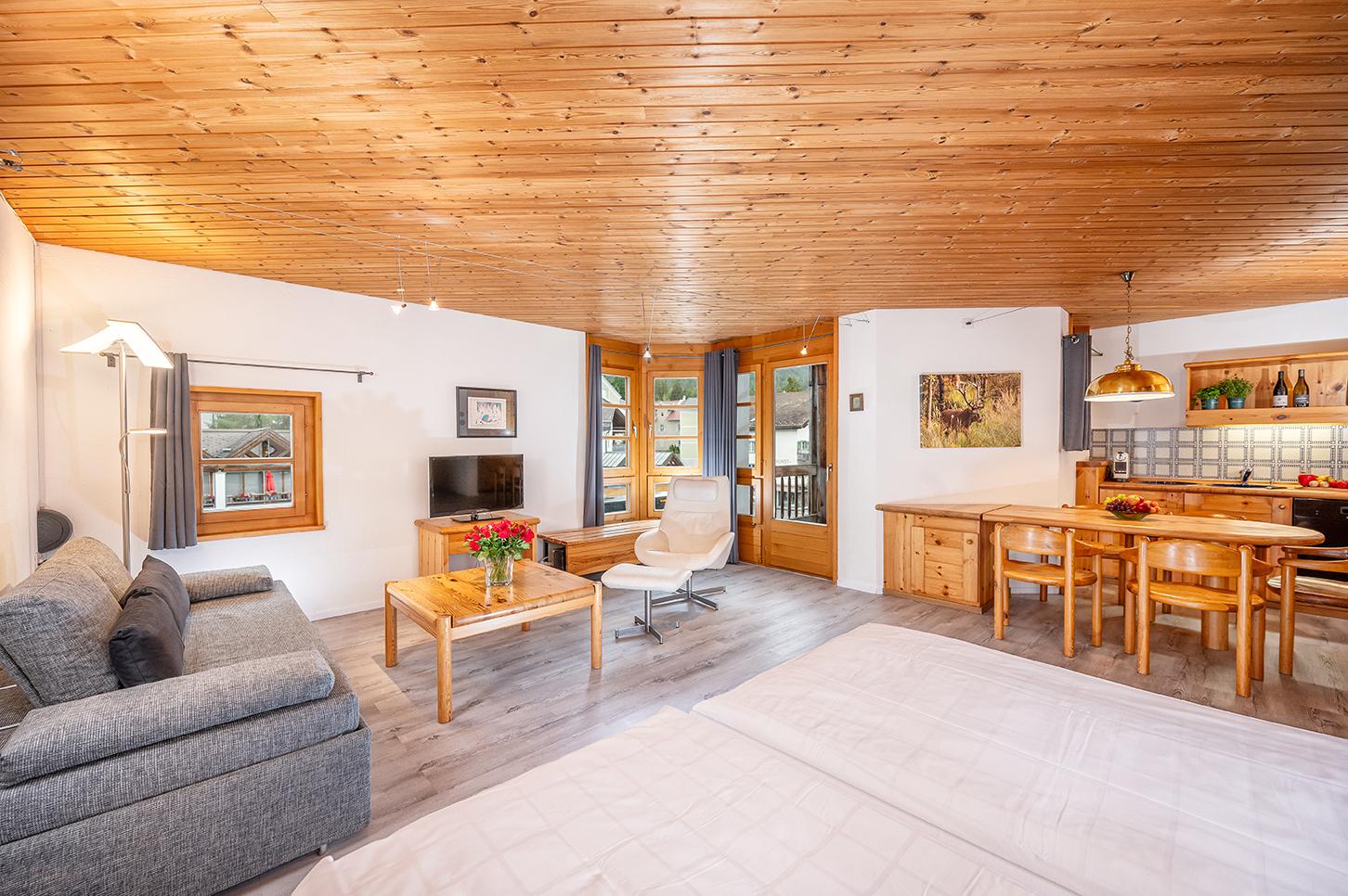 1 1/2 Zimmer Ferienwohnung im Hotel Schweizerhof, Wohnzimmer mit 2-4 Schlafgelegenheiten, ein neues Doppelbett und eine neue Schlafcouch für 2 Personen, offene Küche mit Backofen, Terrasse, Tiefgaragenplatz, Ski- und Snowboardraum, temp. Schwimmbad mit Sauna, Bio-Sauna und Dampfbad