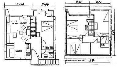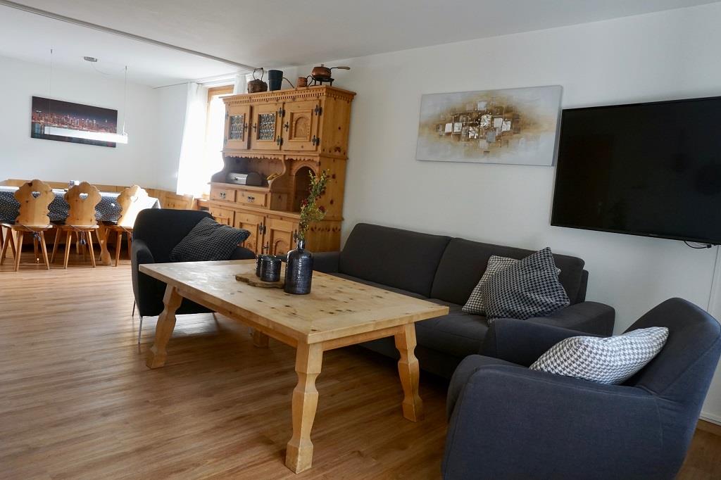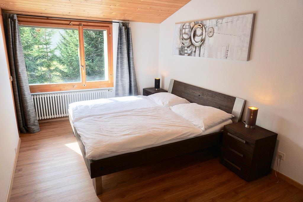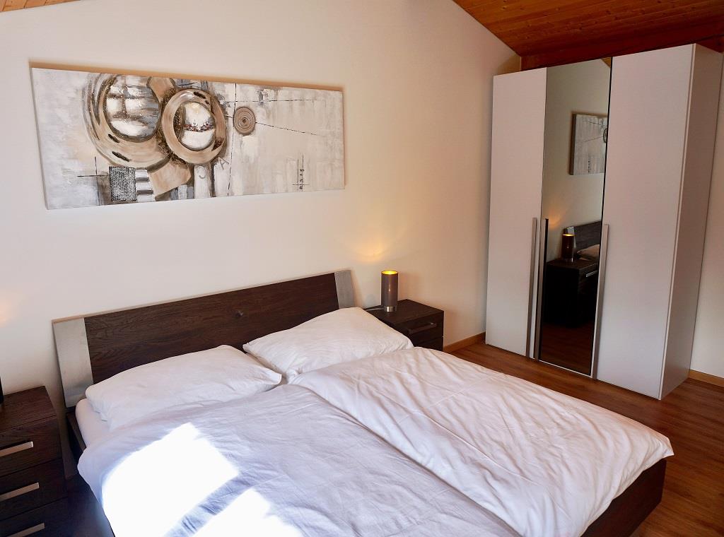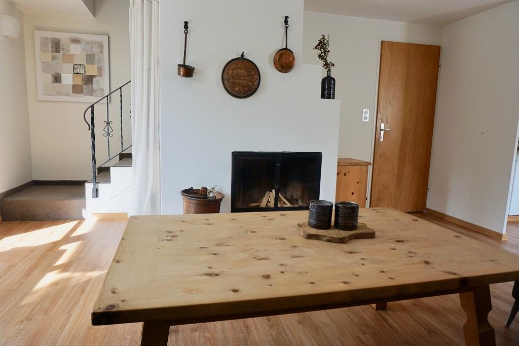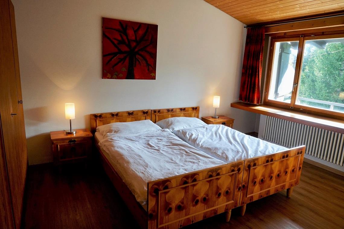 EG: gedeckter Treppenaufgang, Entrée mit Garderobe, im Wohnzimmer integrierte Küche mit 3-Platten-Elektroherd, Backofen, Geschirrspüler, Kühlschrank, diverse Einbauschränke, Essecke (Küche durch Vorhang vom Wohnzimmer abtrennbar), Wohnzimmer mit Cheminée, Smart-TV (Internetfähig)/Radio, Sitzgruppe, Ausgang zum Südsitzplatz mit anschliessender Liegewiese, Schlafzimmer mit Doppelbett (1.80 x 2.00 m), Schrank und Ausgang zum Südsitzplatz. OG: Bad/WC/Lavabo, Schlafzimmer mit zwei Einzelbetten (90 x 1.90/ 90 x 2.00 m), Schrägdach, Schlafzimmer mit Doppelbett (1.80 x 2.00 m), Schrank und Ausgang zum Südbalkon, Schlafzimmer mit Doppelbett und Schrank (1.80 x 2.00 m)