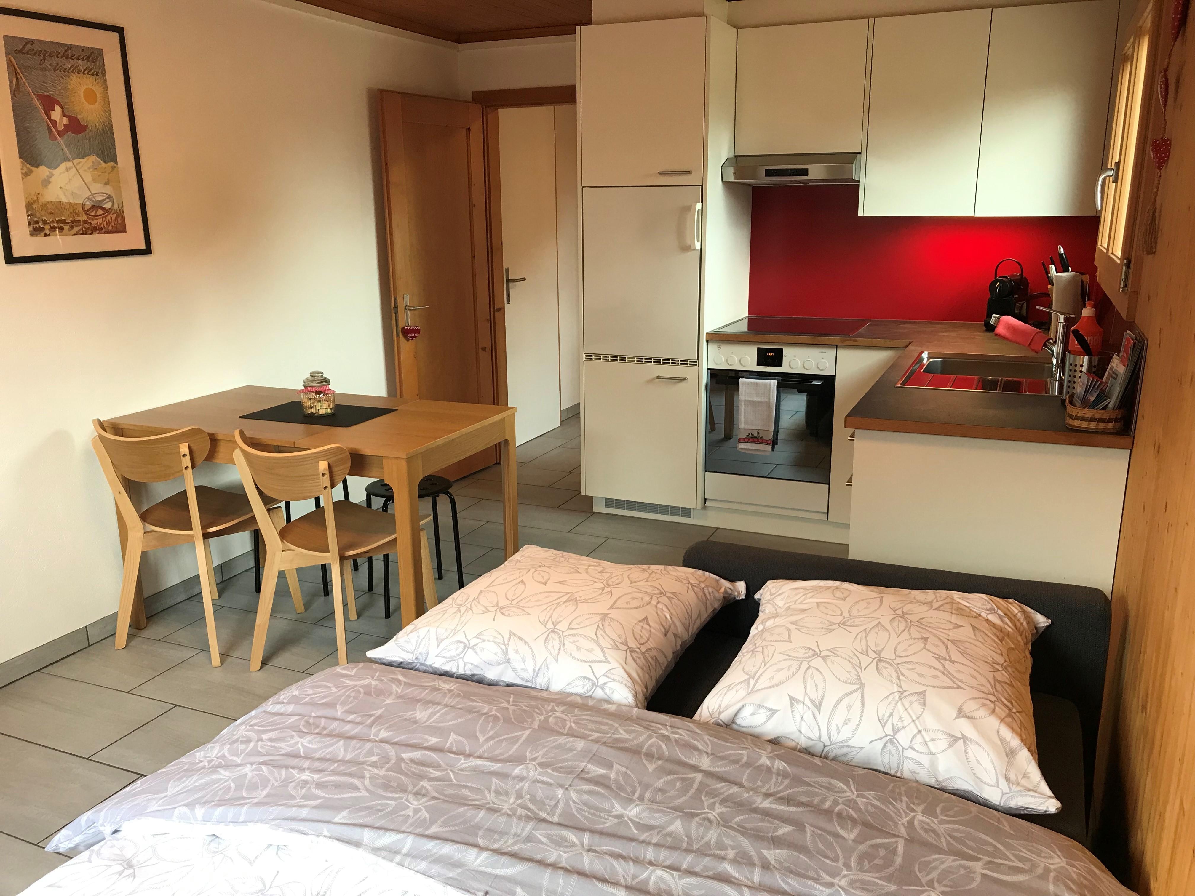 Die 2.5 Zimmer-Ferienwohnung ist an ein Einfamilienhaus angebaut und verfügt über einen separaten Hauseingang. Eine gemütliche Wohnküche, modernes frisch renoviertes Bad und ein schönes Schlafzimmer für zwei Personen lädt zu einem Aufenthalt ein. Zudem kann noch ein Doppel-Schlafsofa im Wohnraum für 2 Personen genutzt werden.