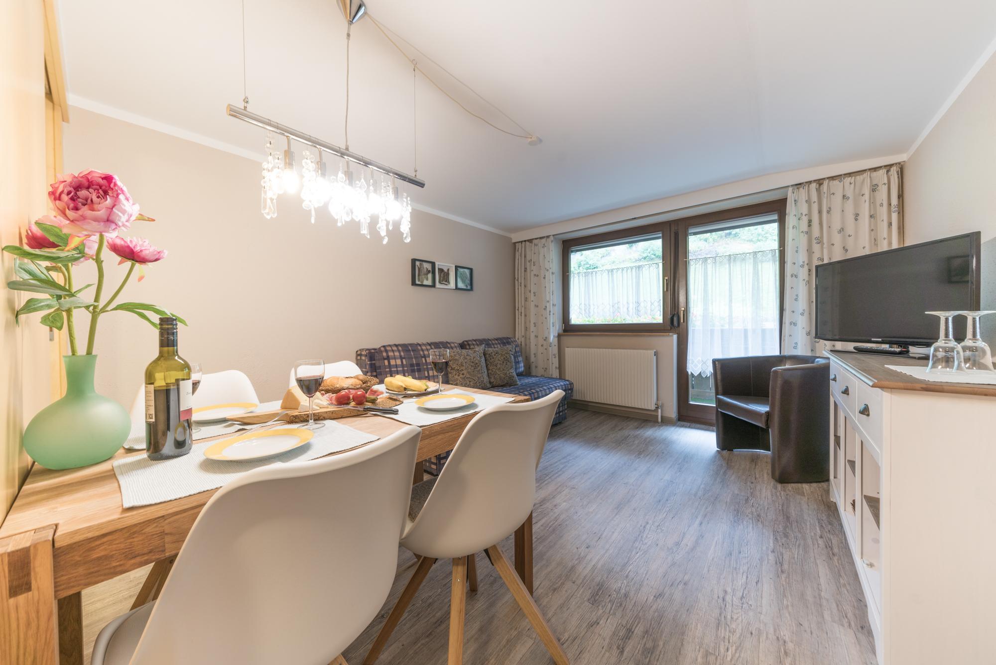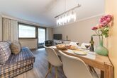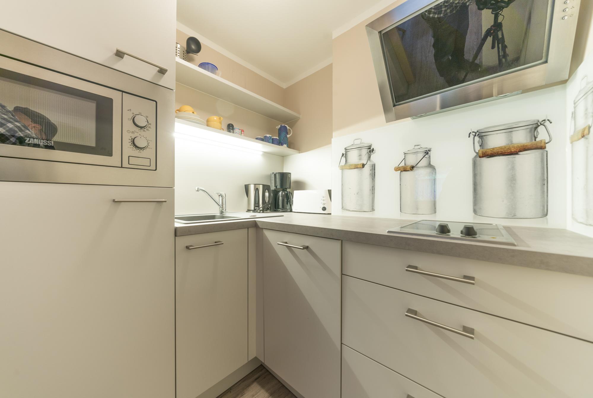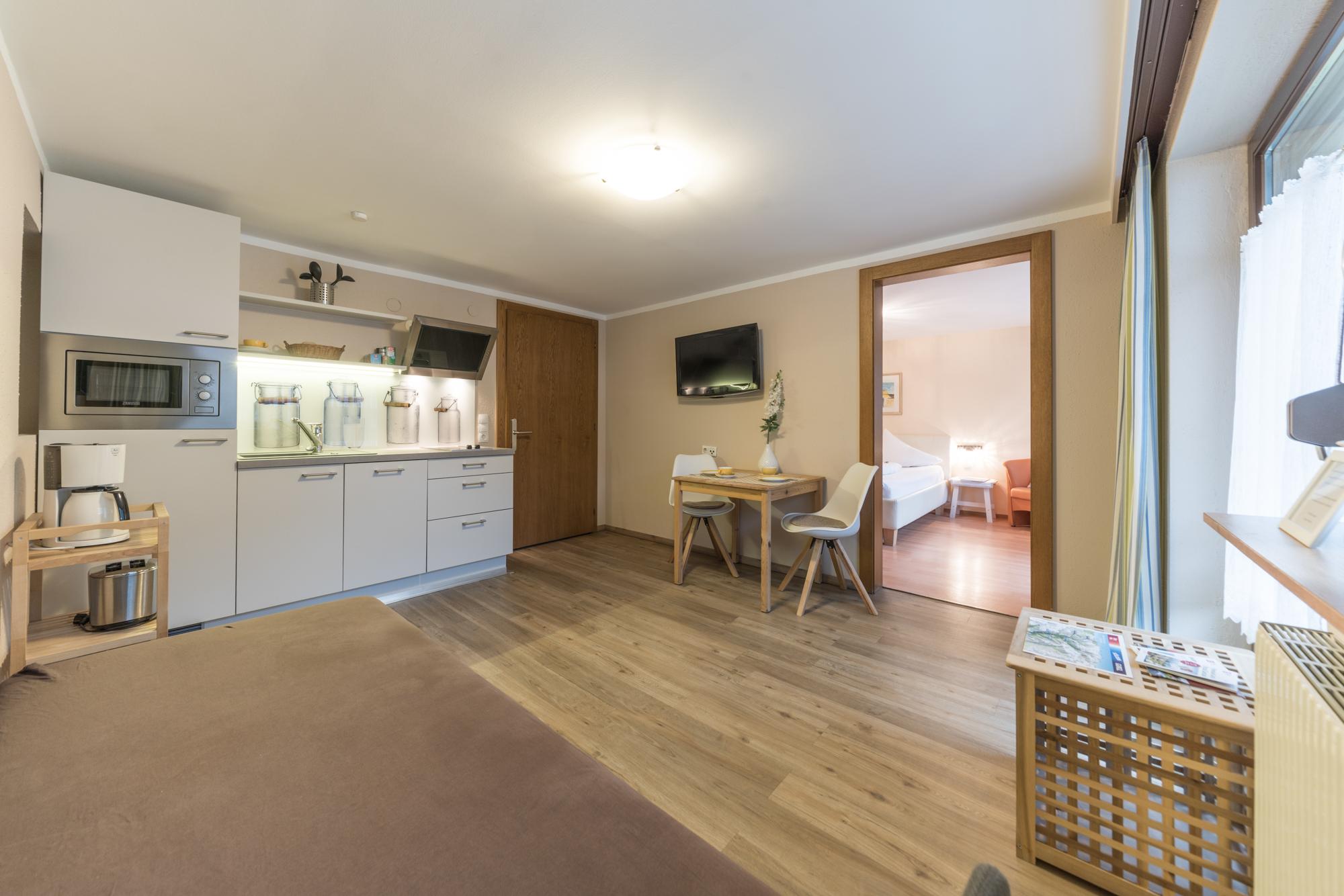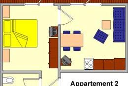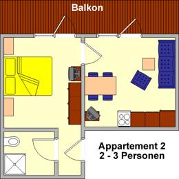 Modern ausgestattetes Zweiraumappartement (ca. 35 m²) mit einem Doppelbettzimmer, DU/WC, SAT/TV (Flachbildfernseher), Safe, sowie Wohn-Schlafraum mit Couch, SAT/TV (Flachbildfernseher). Küche mit Mikrowelle, Kühlschrank und Spülmaschine, Balkon. Bettwäsche und Handtücher werden gestellt. Frühstücksmöglichkeit gegen Aufpreis und auf Anfrage möglich.