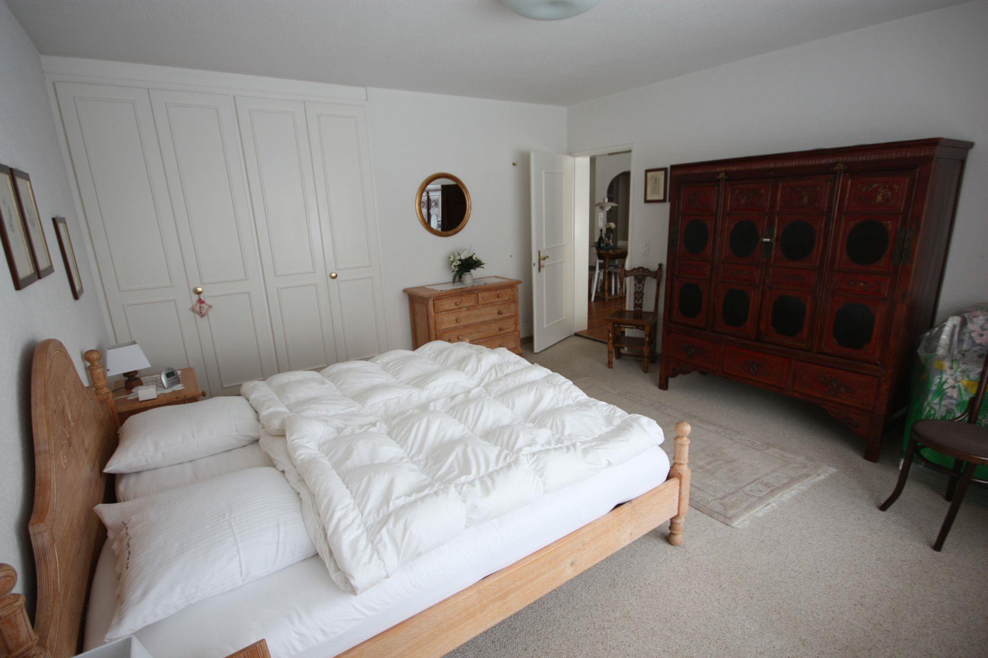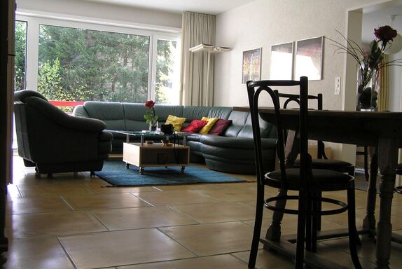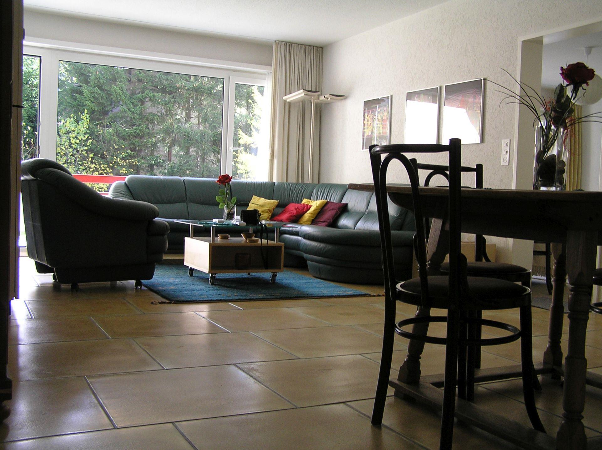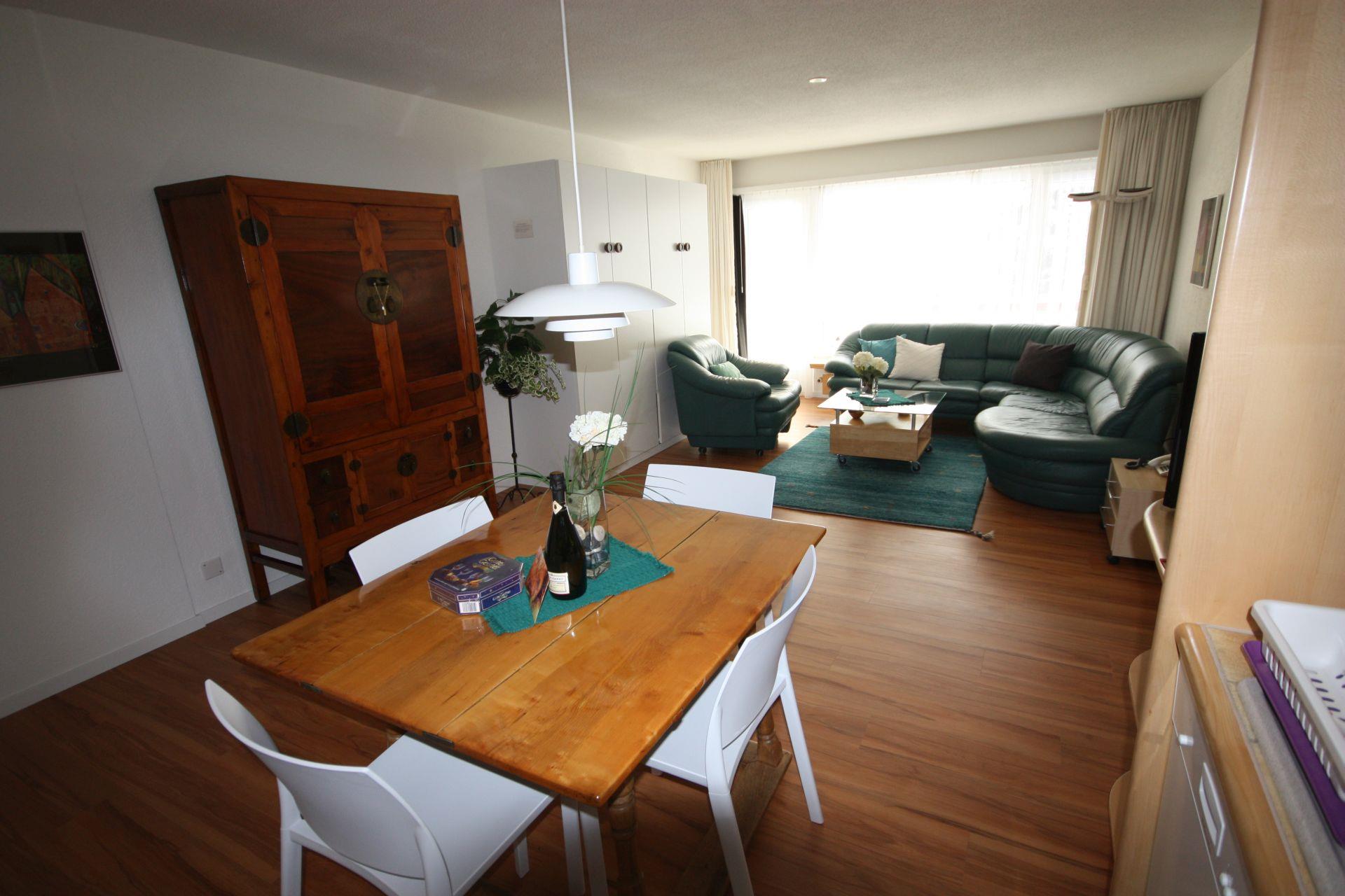 Unsere 65 m2 grosse, sonnige 2 1/2 Zimmerwohnung mit gehobener Ausstattung ist trotz zentraler Lage ruhig gelegen. Eine Haltestelle des kostenfreien Ortsbus befindet sich direkt vor dem Haus. In der Nähe vom Skischulplatz, einem Spiel- und Sportplatz und der Möglichkeit zum Tischtennis spielen. Separater Raum für Sportgeräte wie Ski und Fahrräder vorhanden. Eine Schuhtrockenheizung ist im Raum vorhanden. Ebenso können Sie im Untergeschoss im Wäscheraum die Waschmaschine und Tumbler (Trockner) verwenden. Haben Sie keine Lust zum Kochen, gibt das angegliederte Restaurant die Möglichkeit, Sie zu bedienen. Vom grossen Balkon Aussicht auf den grossen Garten und die Bergwelt.