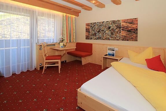 gemütlich eingerichtetes Einbettzimmer mit Dusche/WC / Haarföhn , Wireless (W-LAN) Anschluss,  Wasserkocher mit  Tee, Kabel-TV und Balkon. Genießen Sie das großzügige Frühstücksbuffet mit Ausblick auf die Ötztaler Bergwelt.