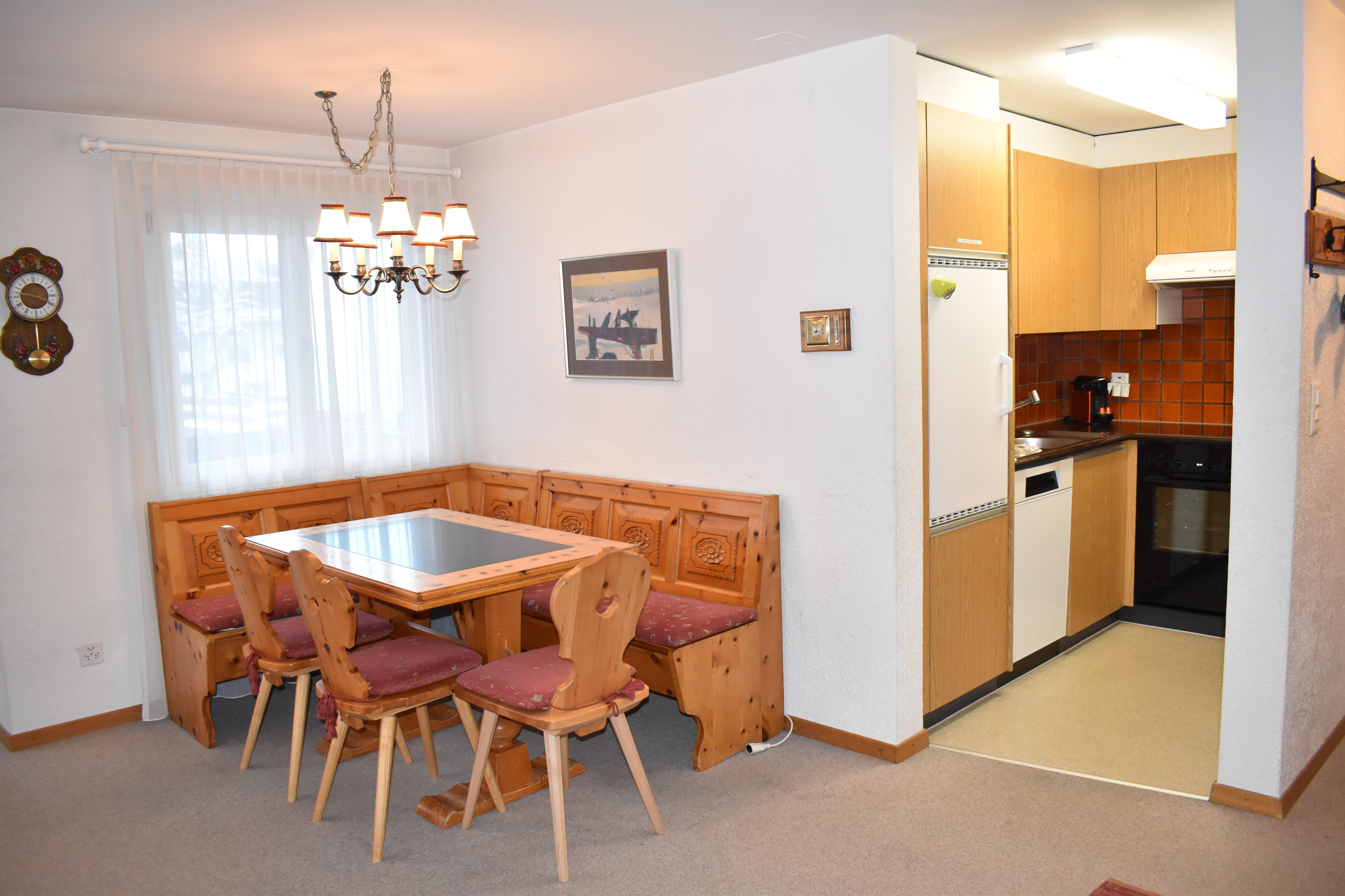 Die Küche ist im Wohnzimmer integriert, ist aber komfortabel eingerichtet. Der Sitzplatz ist nach Süden ausgerichtet. Kinderbett vorhanden. Skiraum und Garten stehen zur Mitbenützung bereit. Ein Parkplatz ist inklusive.