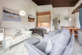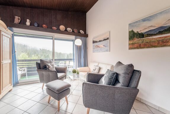 2-Zimmerwohnung (3. Etage), kleines Doppelschlafzimmer, Wohnzimmer mit Doppelwandklappbett (SAT-TV, Radio u. Direktwahltelefon, offene Küche, Bad/WC, möbilierter Ostbalkon.