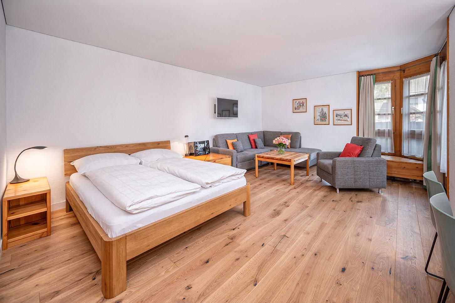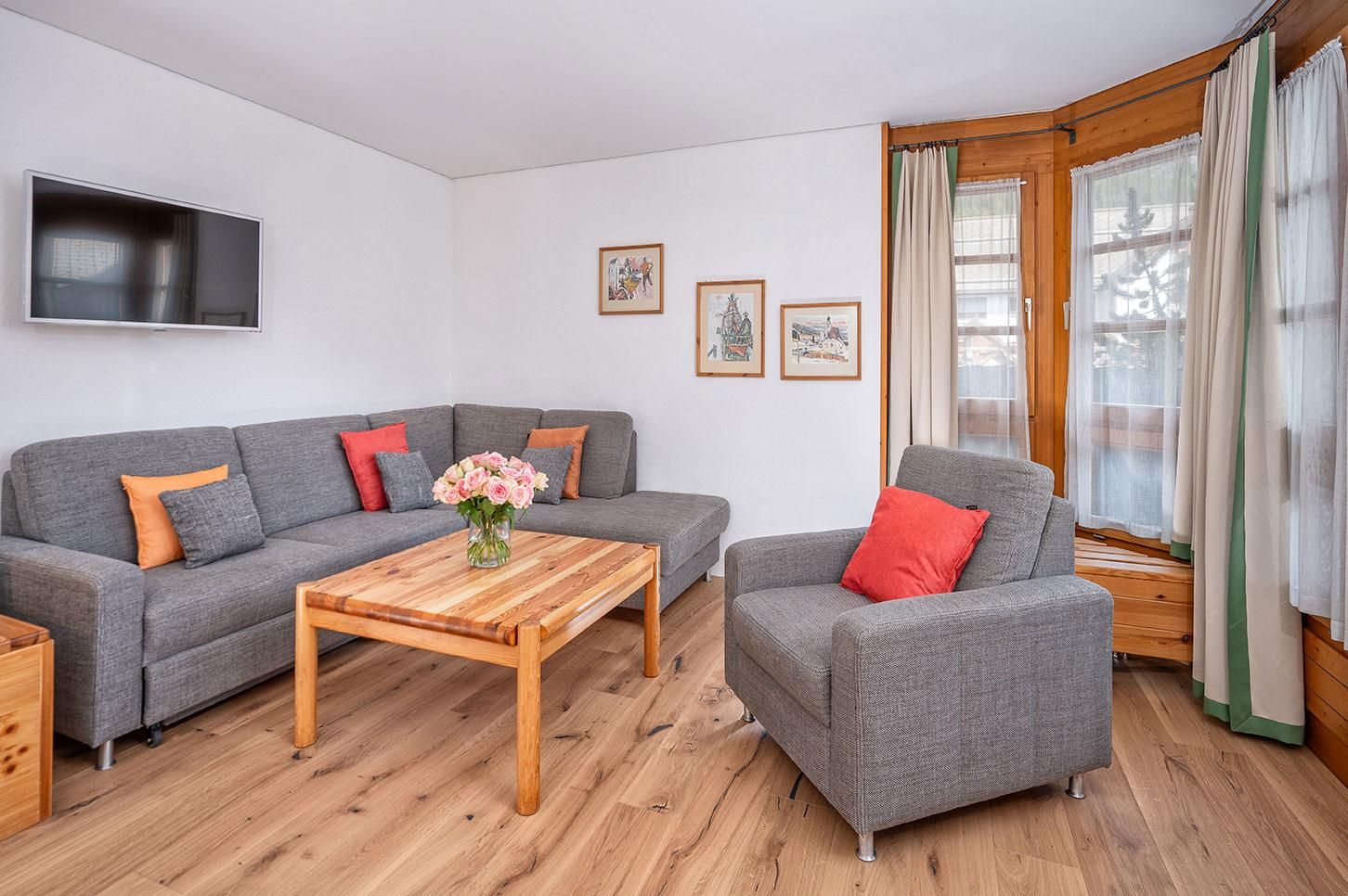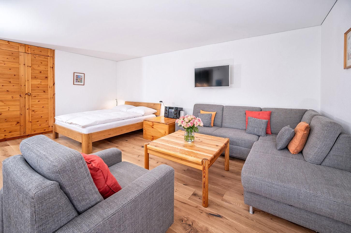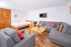 1 1/2 Zimmer Ferienwohnung im Hotel Schweizerhof, Wohnzimmer mit neuem Parkettboden verfügt über 2-4 Schlafgelegenheiten, ein Doppelbett und zwei Einzelschlafcouchen, offene Küche mit Backofen, Terrasse, Tiefgaragenplatz, Ski- und Snowboardraum, temp. Schwimmbad mit Sauna, Bio-Sauna und Dampfbad. Bitte beachten Sie, Haustiere sind in dieser Wohnung nicht erlaubt.