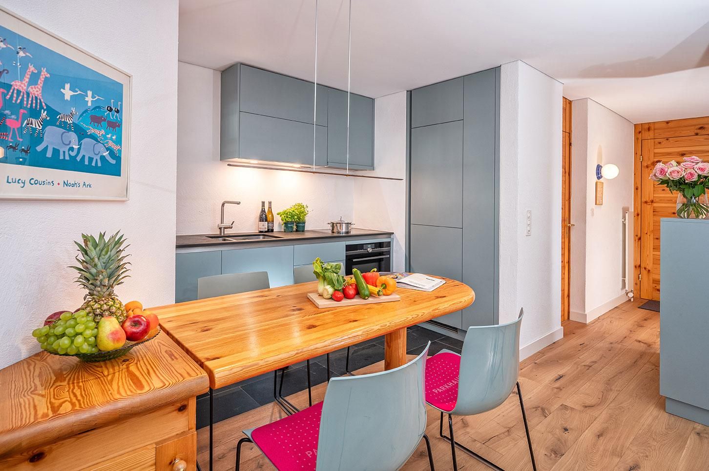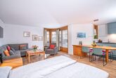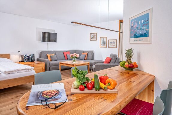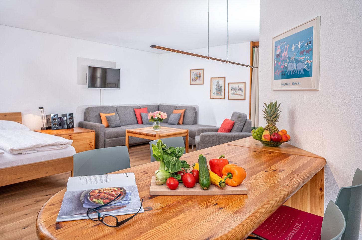 1 1/2 Zimmer Ferienwohnung im Hotel Schweizerhof, Wohnzimmer mit neuem Parkettboden verfügt über 2-4 Schlafgelegenheiten, ein Doppelbett und zwei Einzelschlafcouchen, offene Küche mit Backofen, Terrasse, Tiefgaragenplatz, Ski- und Snowboardraum, temp. Schwimmbad mit Sauna, Bio-Sauna und Dampfbad. Bitte beachten Sie, Haustiere sind in dieser Wohnung nicht erlaubt.