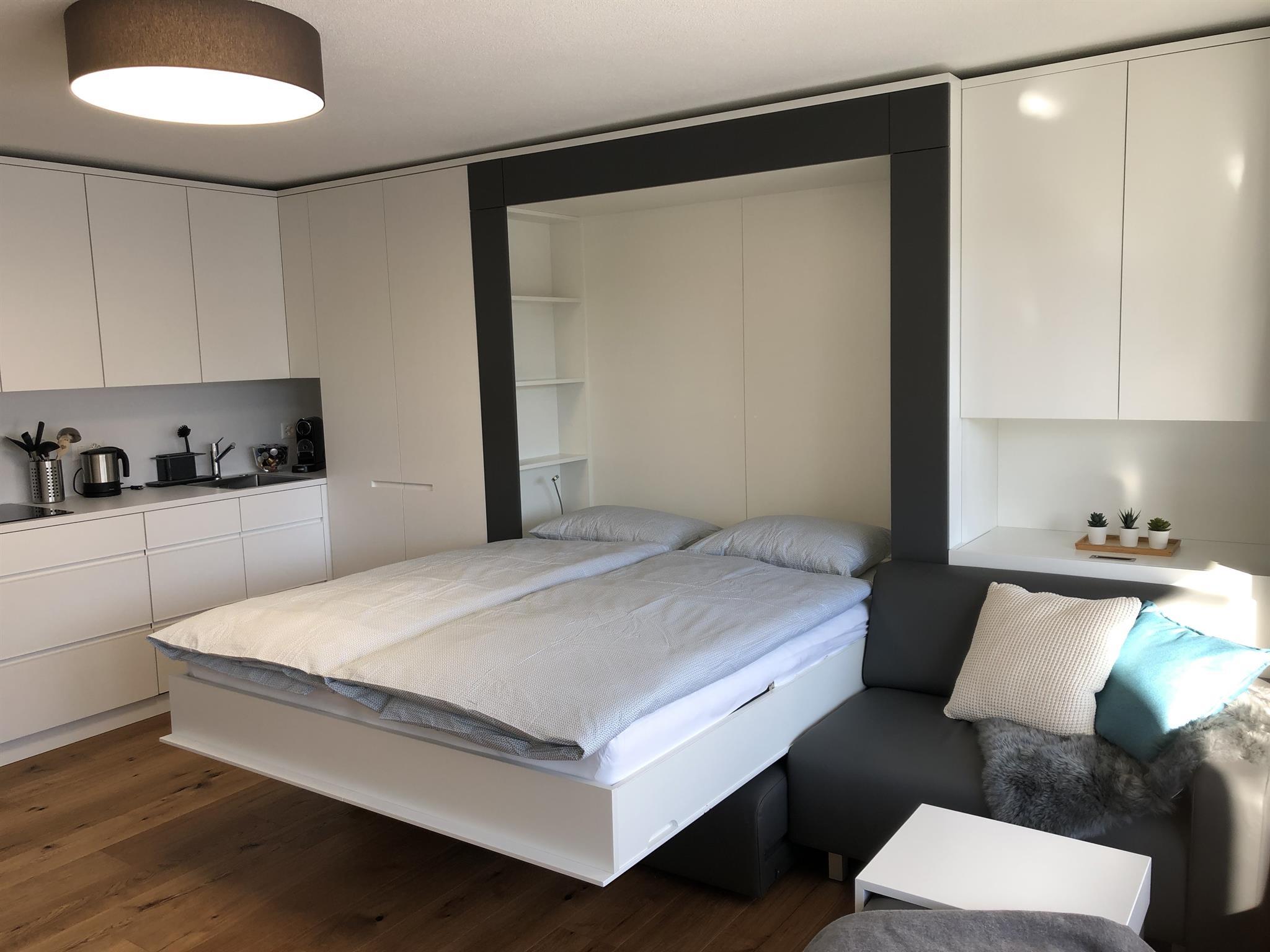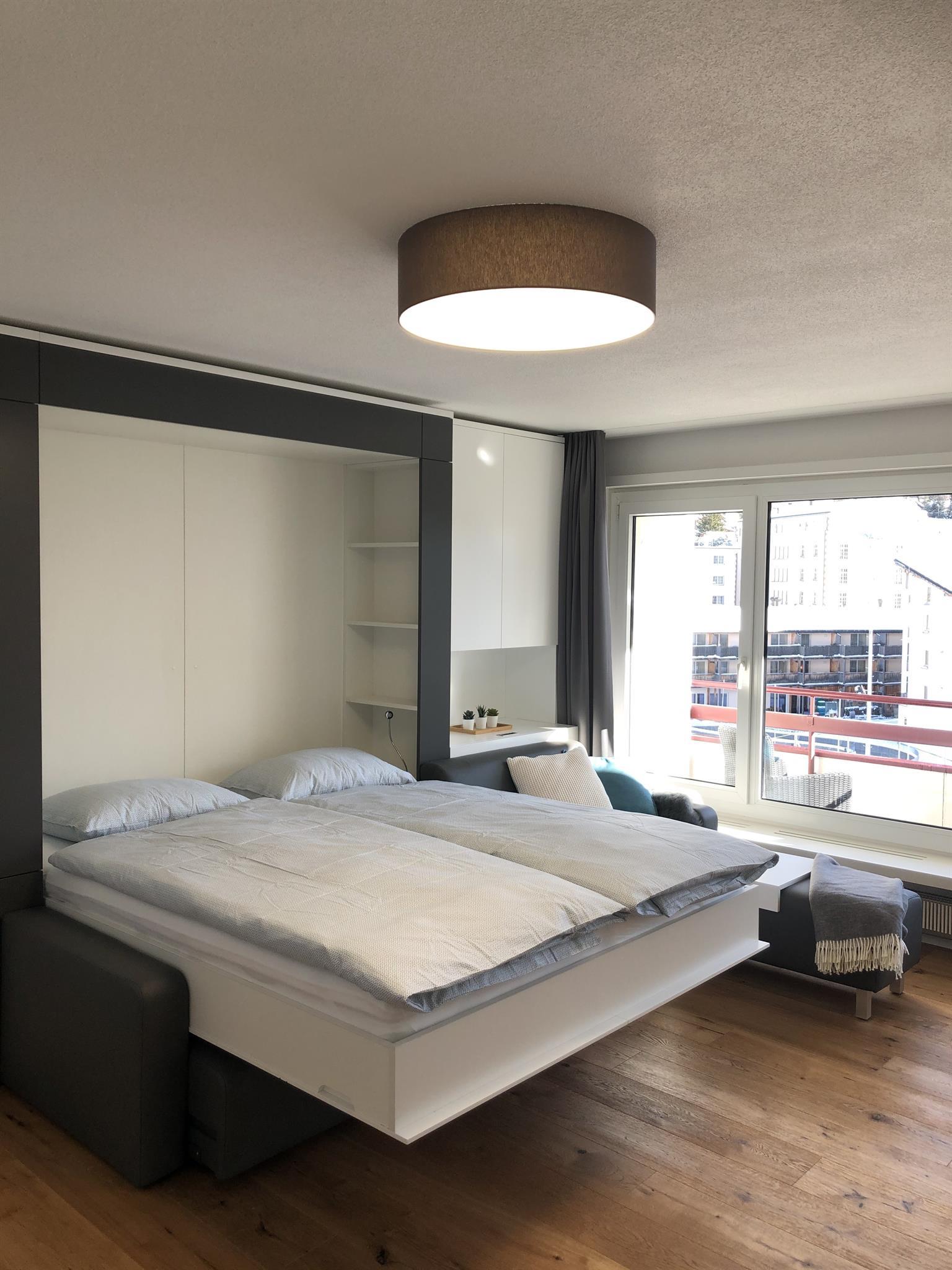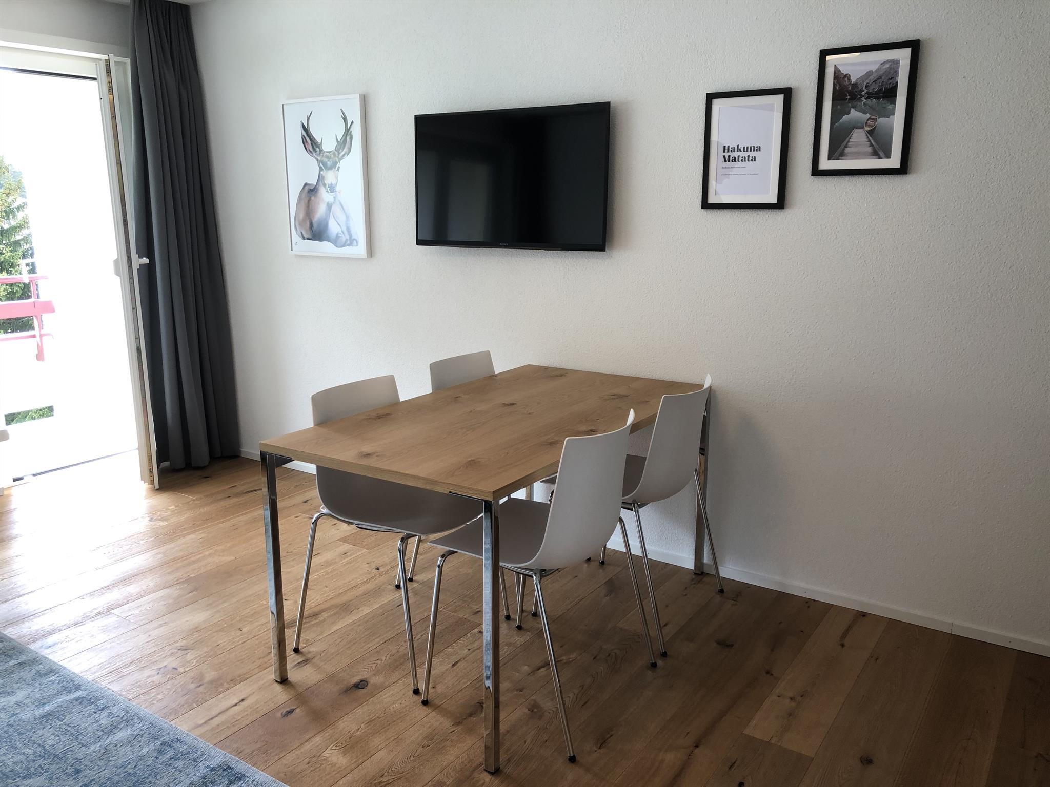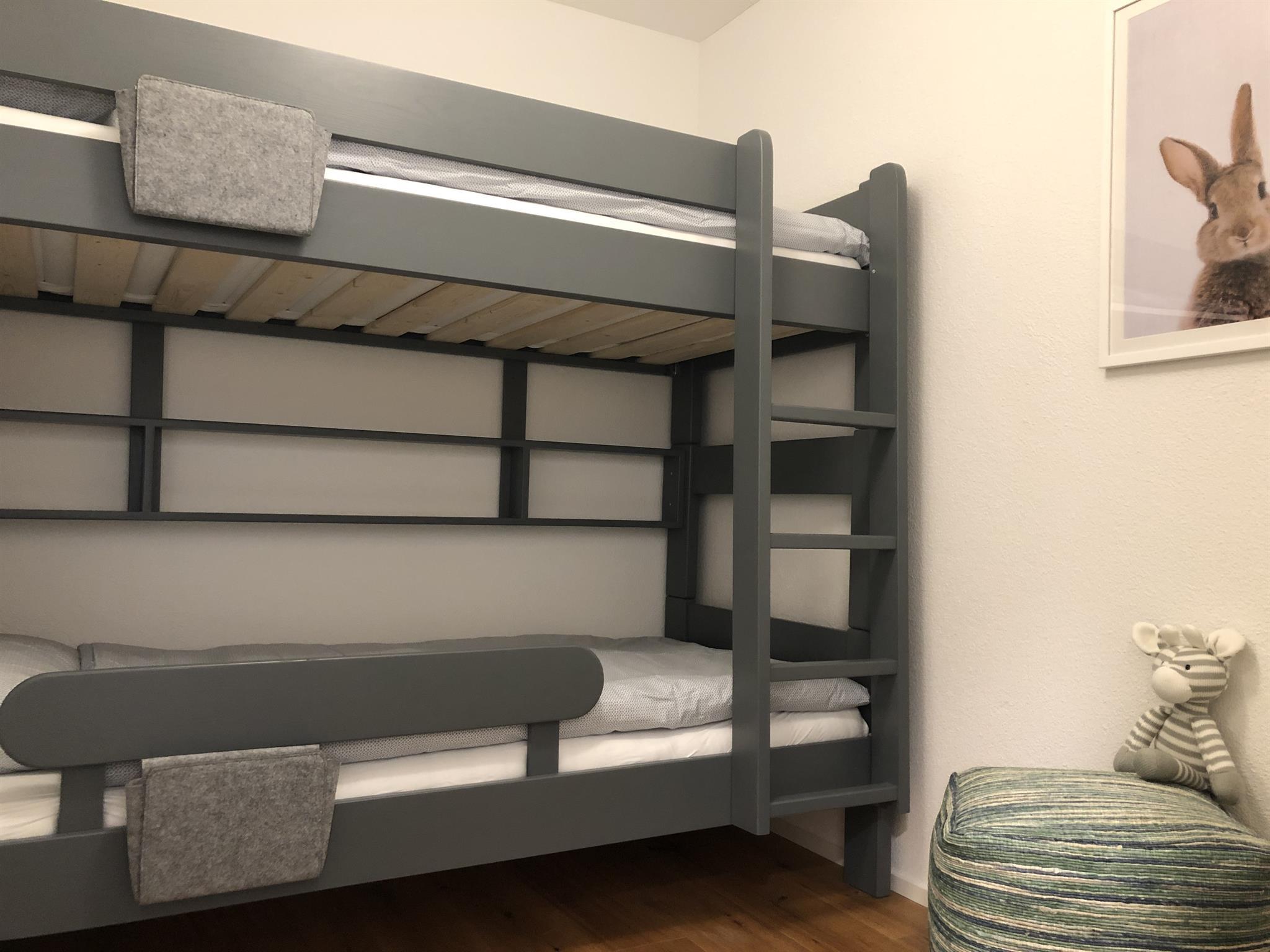 2 Zimmer-Wohnung mit Balkon, herrlicher Blick auf die Berge. Wohnzimmer mit Ledersofa, Schrank mit integriertem Klappbett (bequem mit einem Handgriff in ein Doppelbett verwandeln), gut ausgestattete Küche mit grossem Inventar, zahlreiche Einbauschränke mit viel Stauraum. Das Kinderzimmer (ohne direktes Fenster/Tür mit Milchglas-Verglasung für ein offenes Raumgefühl) ist liebevoll eingerichtet mit Etagenbett (90 x 200cm, seitlicher Rausfallschutz) und Kleiderschrank. Das Etagenbett ist nur für Kinder (jüngere und Schulkinder) geeignet. Das kleine Kinderzimmer wird durch normales Lüften über die grossen Fensterfronten automatisch belüftet. Das Badezimmer ist mit einer komfortablen Regendusche ausgestattet. Top WLAN. Hochwertiger und komfortabler Innenausbau für mehr Wohngenuss.
