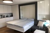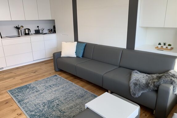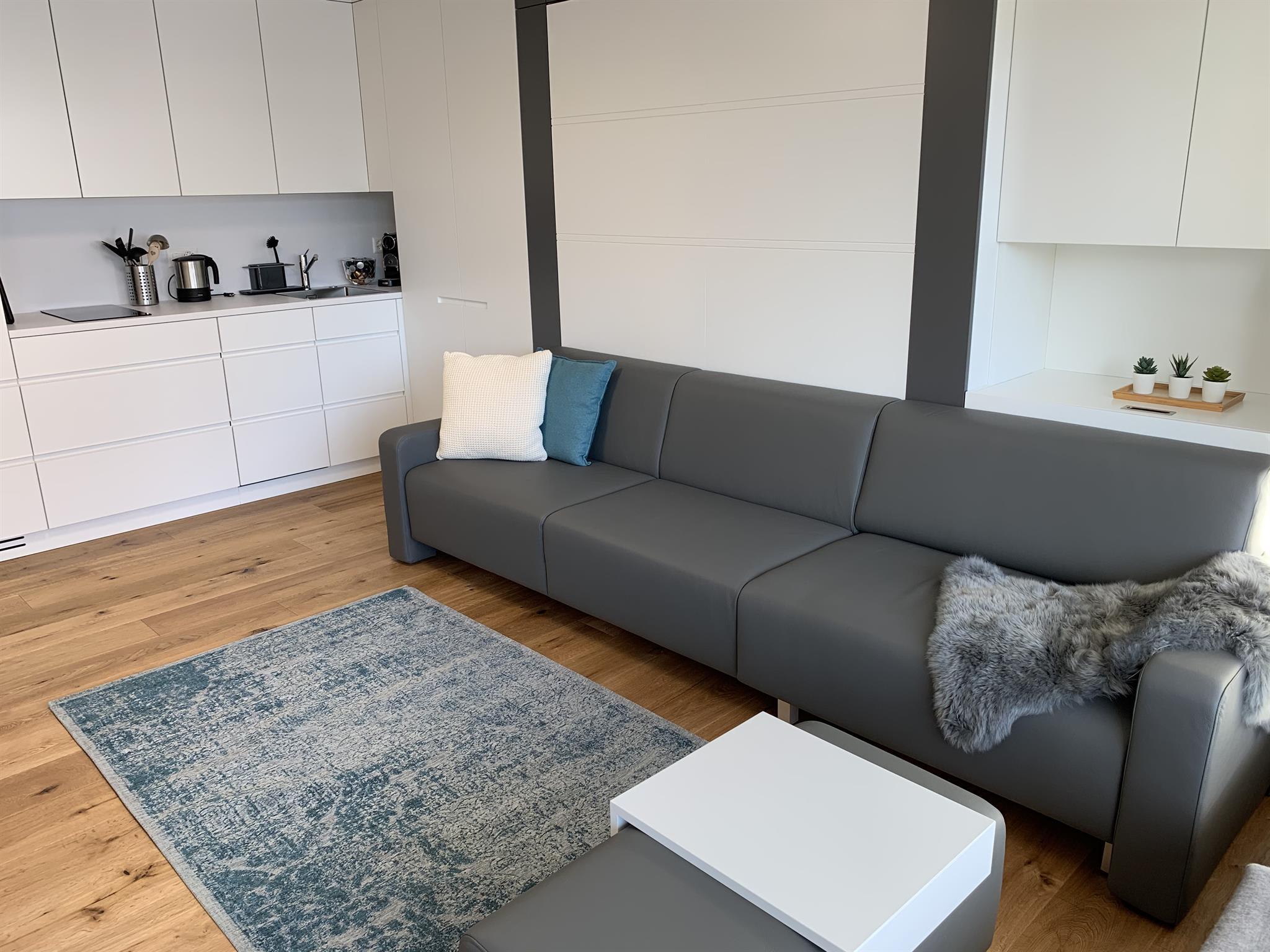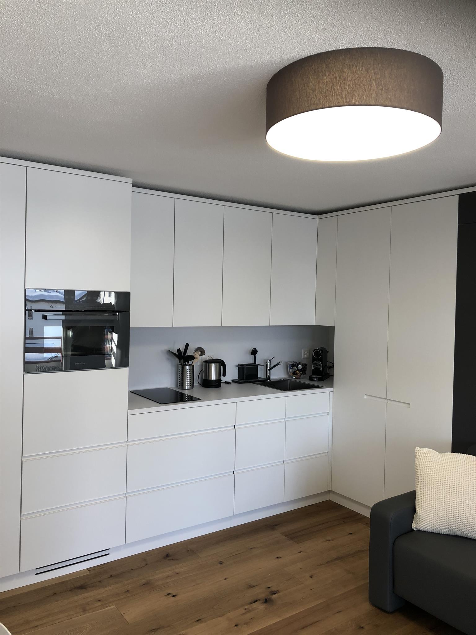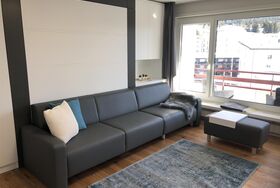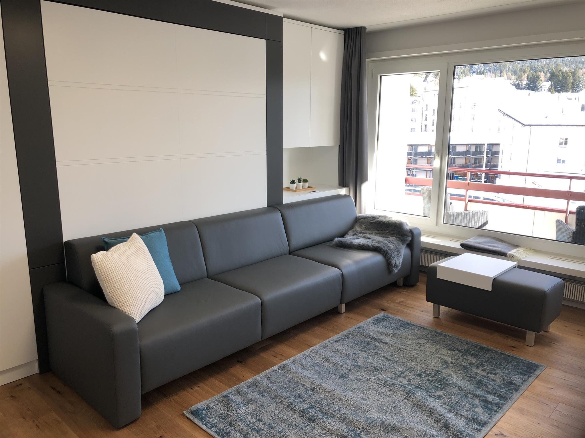 2 Zimmer-Wohnung mit Balkon, herrlicher Blick auf die Berge. Wohnzimmer mit Ledersofa, Schrank mit integriertem Klappbett (bequem mit einem Handgriff in ein Doppelbett verwandeln), gut ausgestattete Küche mit grossem Inventar, zahlreiche Einbauschränke mit viel Stauraum. Das Kinderzimmer (ohne direktes Fenster/Tür mit Milchglas-Verglasung für ein offenes Raumgefühl) ist liebevoll eingerichtet mit Etagenbett (90 x 200cm, seitlicher Rausfallschutz) und Kleiderschrank. Das Etagenbett ist nur für Kinder (jüngere und Schulkinder) geeignet. Das kleine Kinderzimmer wird durch normales Lüften über die grossen Fensterfronten automatisch belüftet. Das Badezimmer ist mit einer komfortablen Regendusche ausgestattet. Top WLAN. Hochwertiger und komfortabler Innenausbau für mehr Wohngenuss.