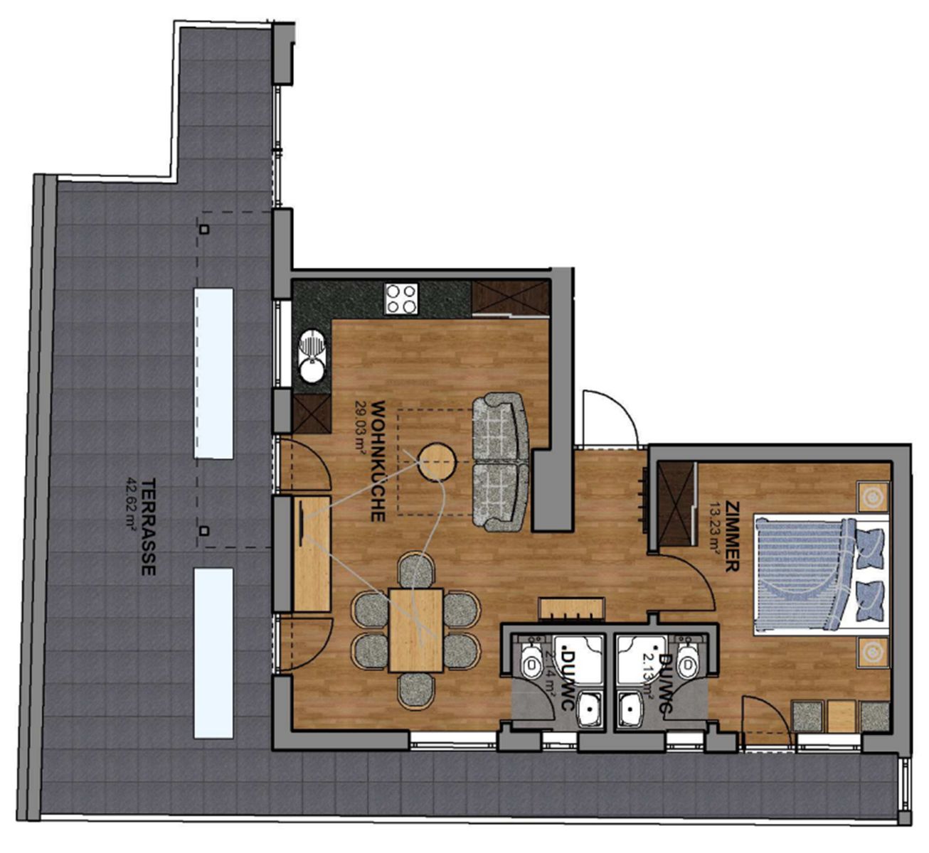 Das Appartement verfügt über 1 Schlafzimmer mit Balkon mit herrlichem Ausblick über Sölden, Kabel TV und Safe. 2 Badezimmer mit Dusche/WC und Föhn. Gemütliches Wohn- schlafzimmer mit Essbereich voll ausgestatteter Küche und Südterrasse. Freies W-Lan. Größe ca. 65 m². täglich Frischer Brötchenservice