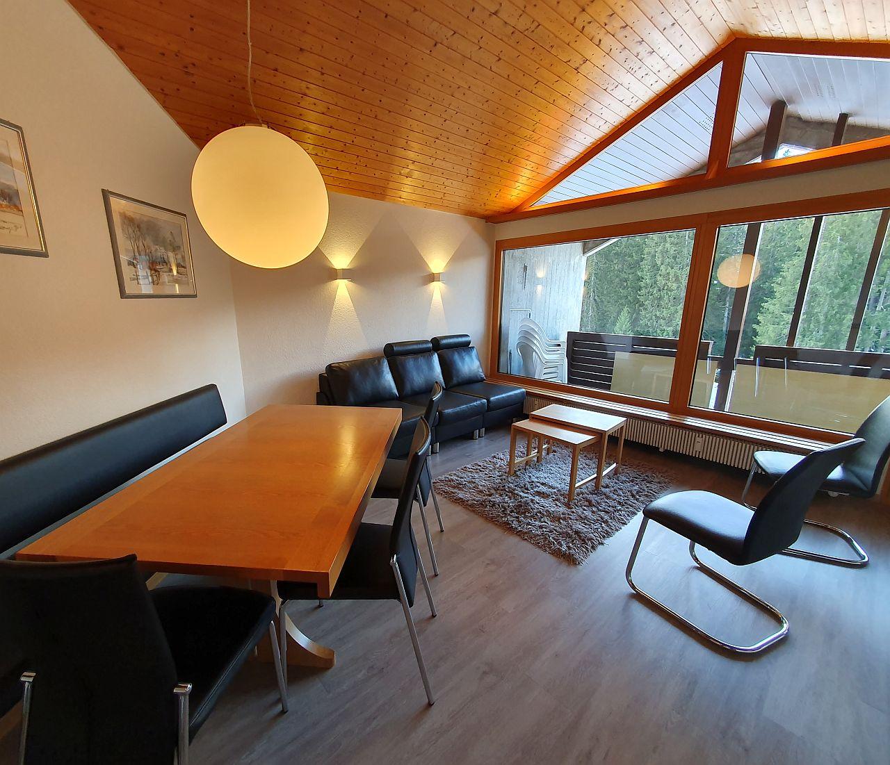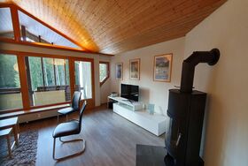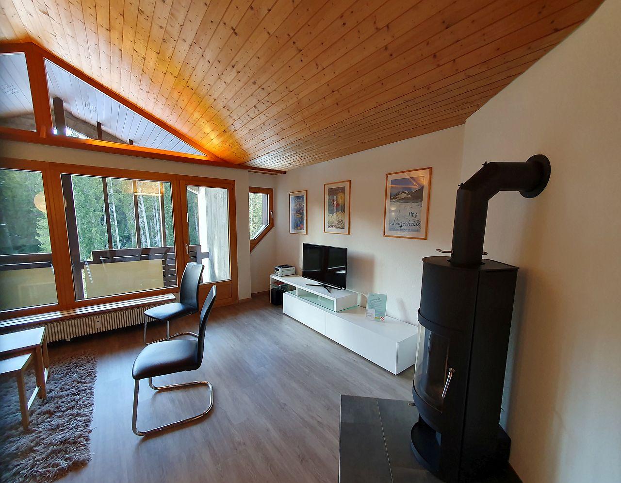 Renovierte 3- Zimmer-Dachwohnung (ca. 67 m²) im Haus Tavanera. Die Wohnung verfügt über ein grosses Wohnzimmer mit integrierter Einbauküche (Geschirrspüler, Backofen, Kühlschrank). Schwedenofen, Balkon, TV und W-Lan. Ein Schlafzimmer mit Doppelbett und ein Schlafzimmer mit Kajütenbett und einem einzelnen Bett. Dusche, separates WC.