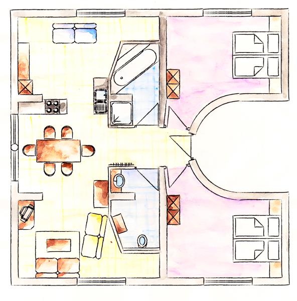 Geräumige und gemütliche Appartements mit gut ausgestatteter Küche, 2 Schlafzimmer, Wohnraum (zusätzliches Schlafzimmer mit Schlafcouch) WC, Bad und Dusche, Garderobe, Sat TV, WLAN, Bettwäsche, Handtücher, Tiefgarage. Waschmaschine und Trockner stehen zur Verfügung.