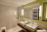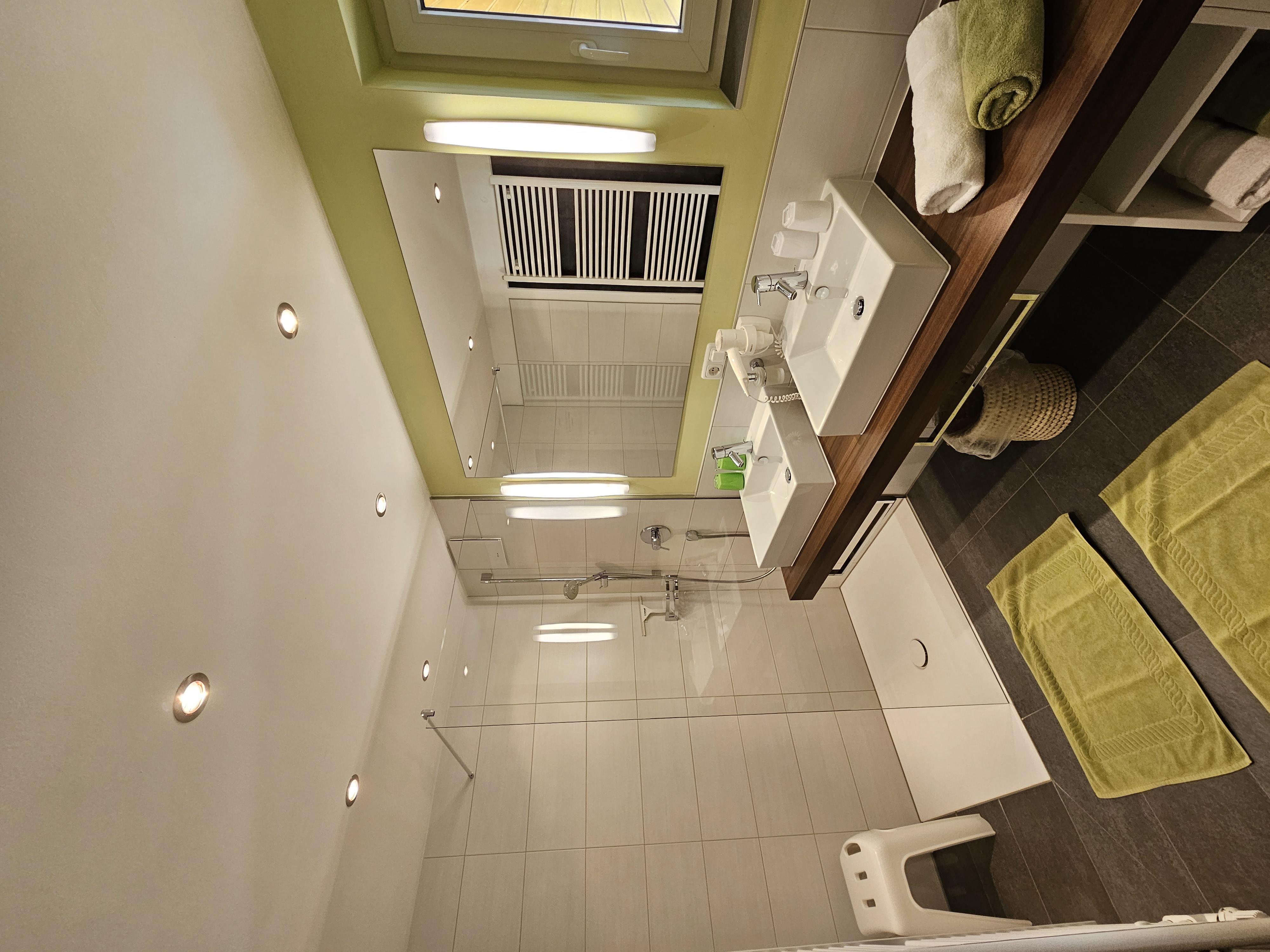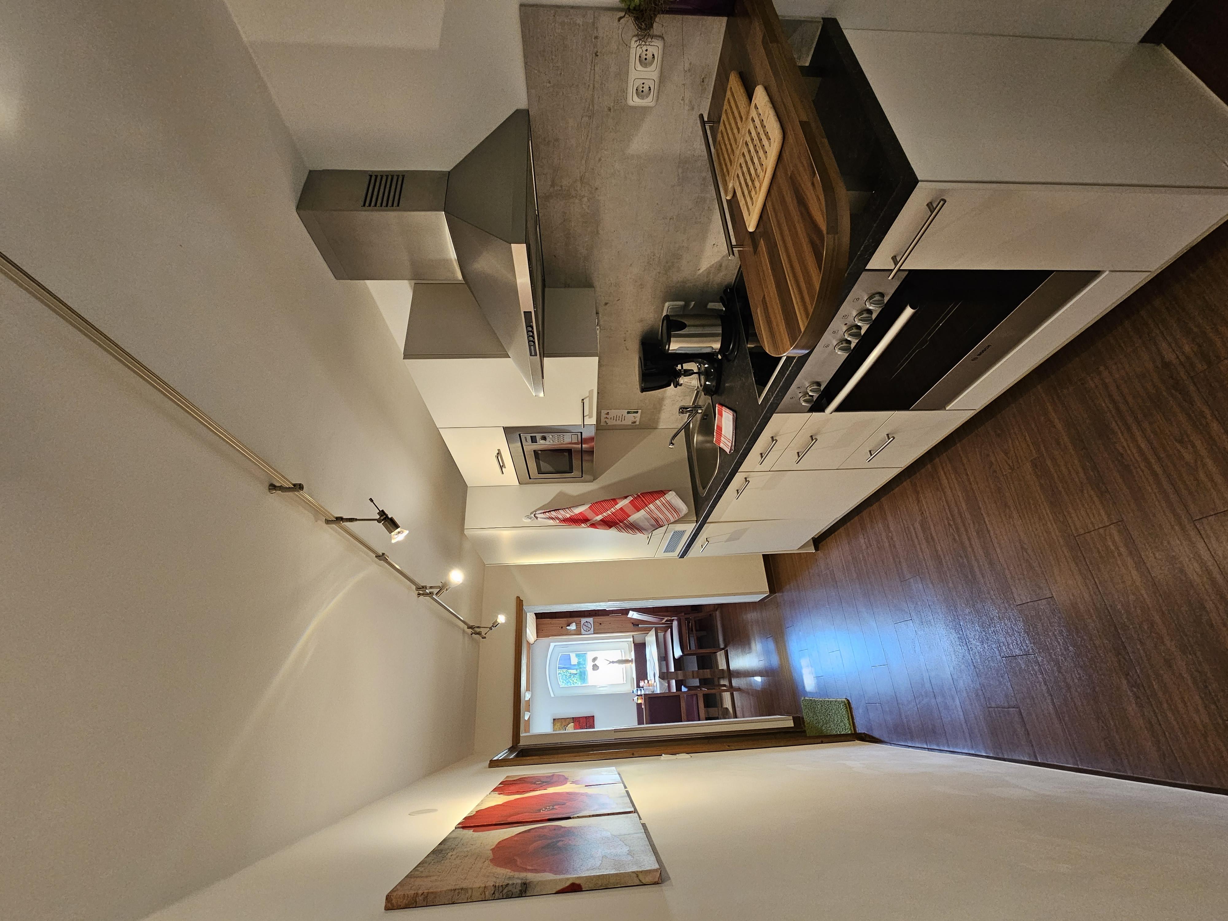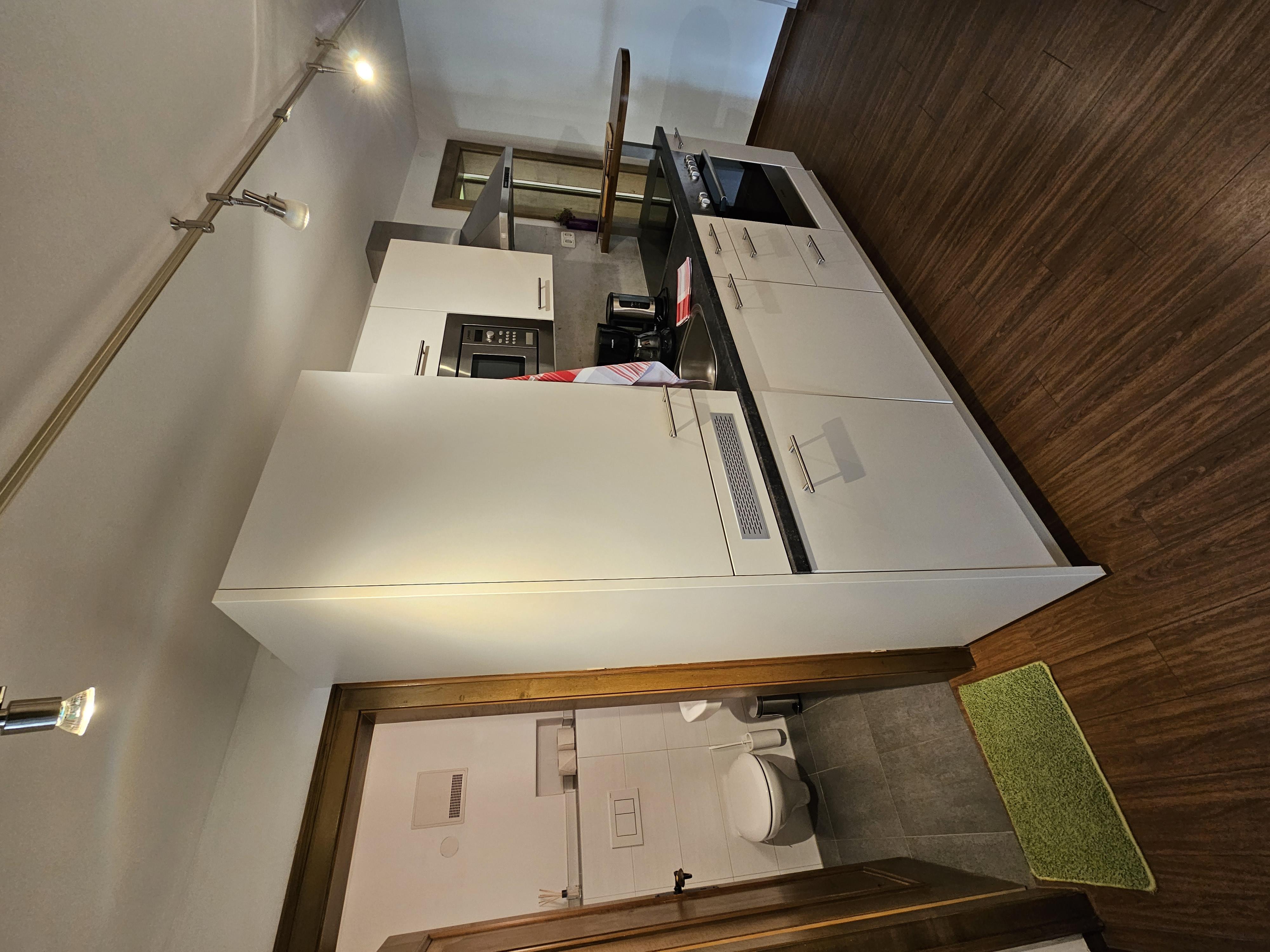 Es besteht aus einem Wohnteil, TV, extra WC, Küche mit Spülmaschine Kühlschrank und Micro, Dusche, zwei Waschtischen, kleine Garderobe, Terrasse.