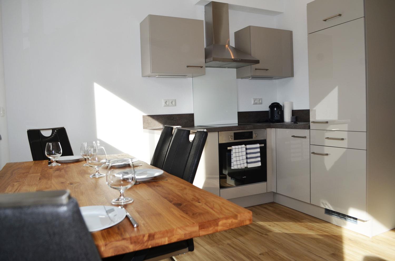 einem Induktionskochfeld, einem Backrohr, Geschirrspüler und einer Kaffeemaschine.