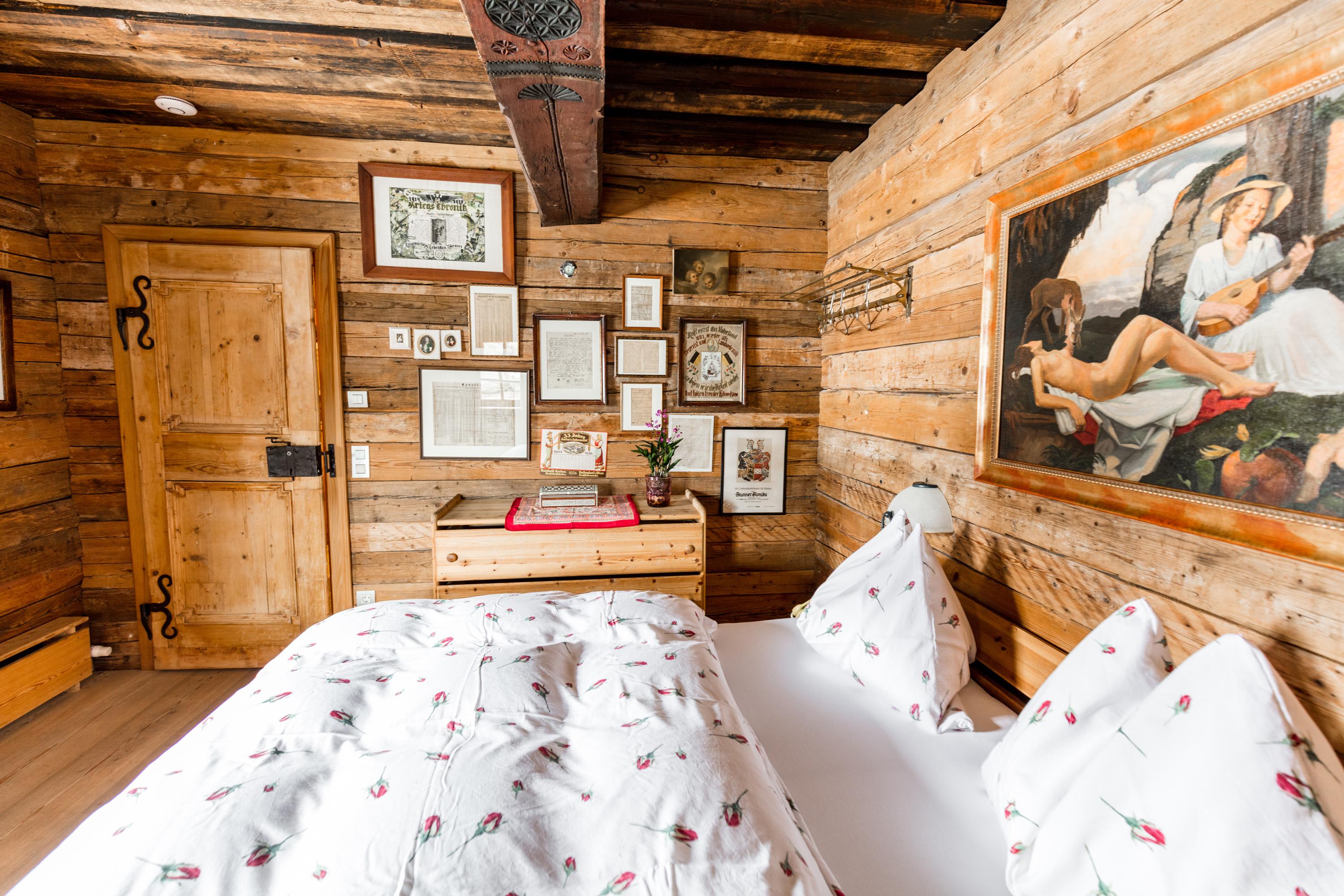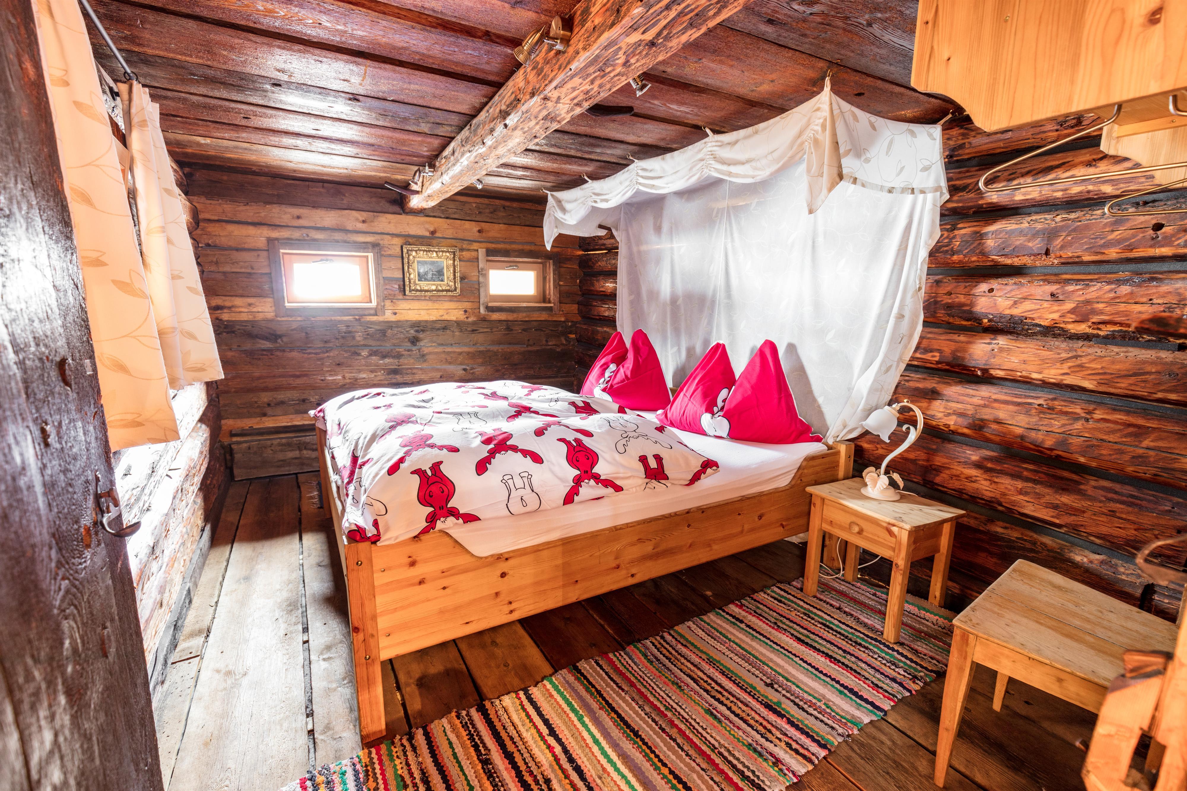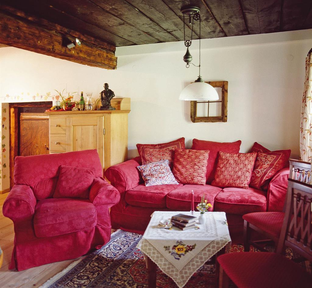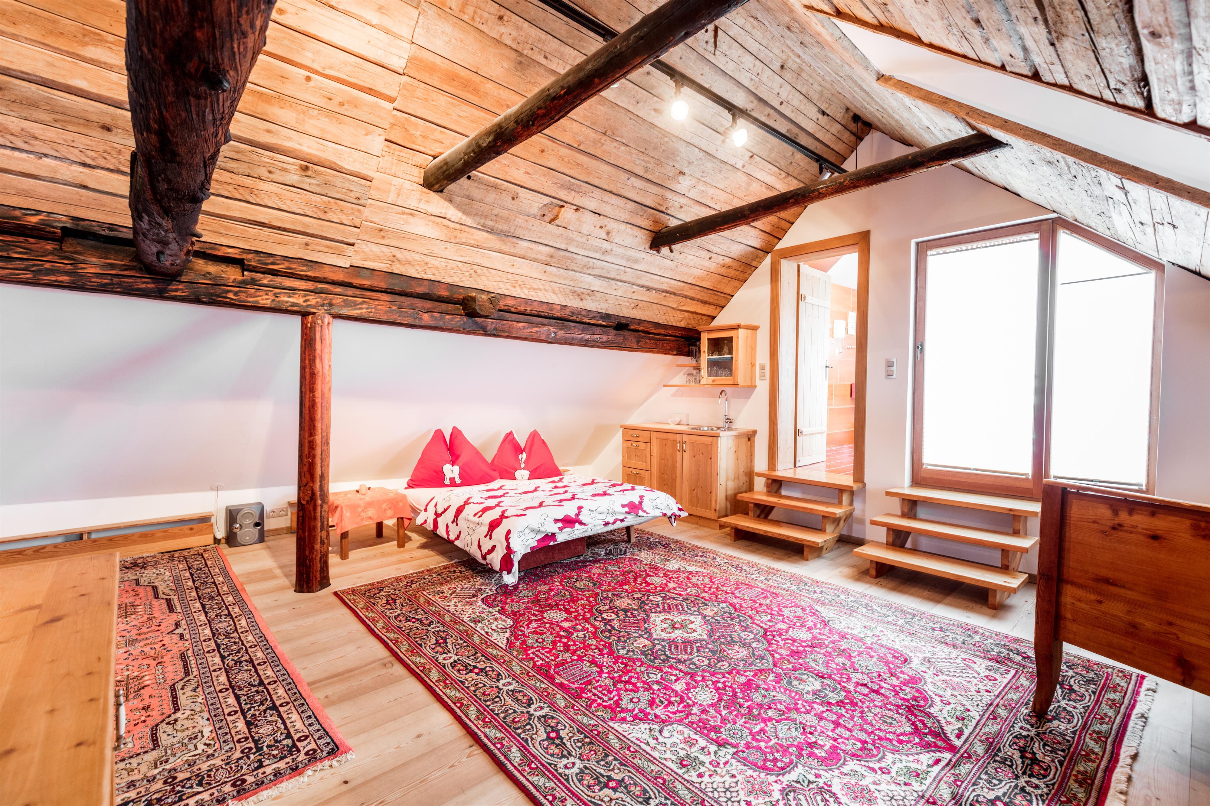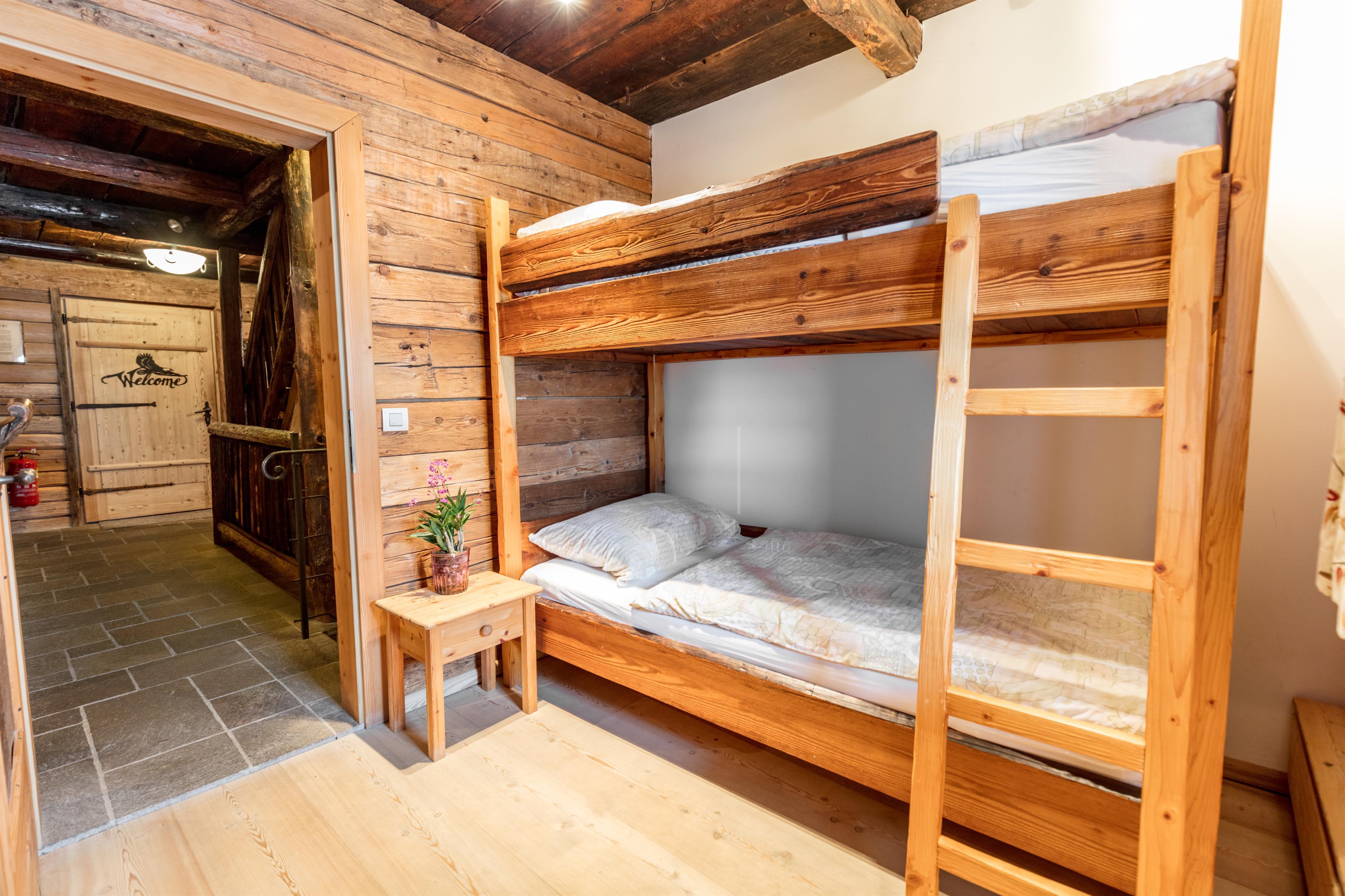 Obergeschoss für 4 bis 10 Personen (ca. 100 m²) Brautzimmer (ehemals Getreidekammer), Panoramazimmer (ehemals Heukammer) mit jeweils 2 Betten, großzügige Dachstube (40 m2) als Ruheraum mit Galerie und Unterdach für weitere Schlafgelegenheiten, Dusche/WC, Sauna, Balkon, Stereoanlage. Erdgeschoss für 4 bis 6 Personen (ca. 100 m²) Schlafkammer, Kinderzimmer, Kreativstube (ehemals Auszüglerstube) mit jeweils 2 Betten, Bad/Dusche und WC und 1 getrenntes WC, große Gardarobe in der Laube, großzügige Wohnstube (ehemals Rauchstube 42 m2) mit Bibliothek und Sat-TV, vollausgestattete Küche (Geschirrspüler, Mikrowelle, E-Herd, Kühl- und Eisschrank, Geschirr etc), Wireless Internet. Hauseingang von der Südseite, sowie separater Zugang über den Wirtschaftsraum bergseitig. Kellerräume – Waterloo (ca. 50 m²) Wellnesszone Waterloo mit Dampfsauna, Erlebnisdusche, Steinwaschbecken, WC, zwei Ovodarien (Ruhezonen, Tepidarium) sowie separat Waschraum (Waschmaschine, Trockner, Bügeleisen), Kellervorraum für Getränkedepot.