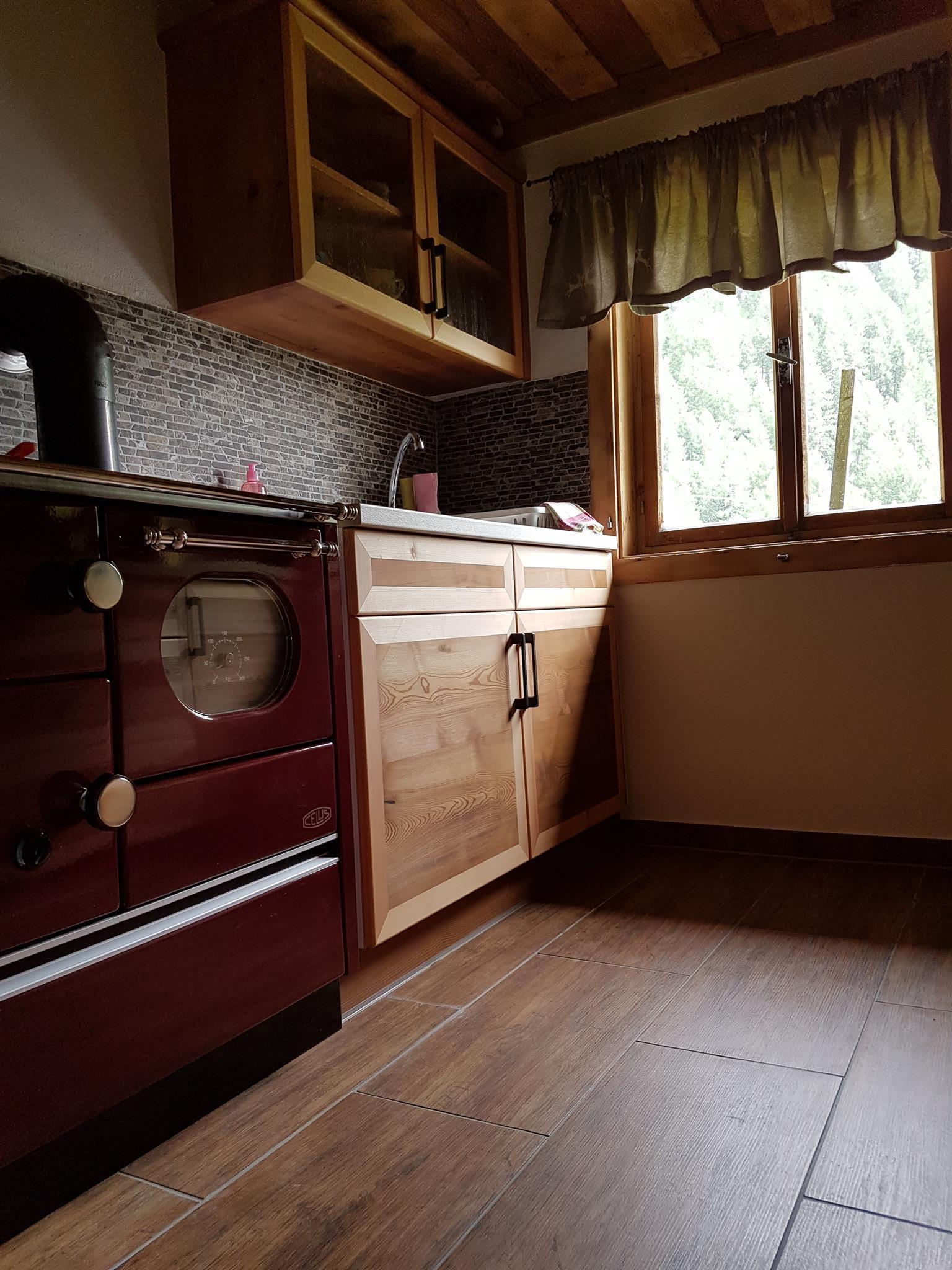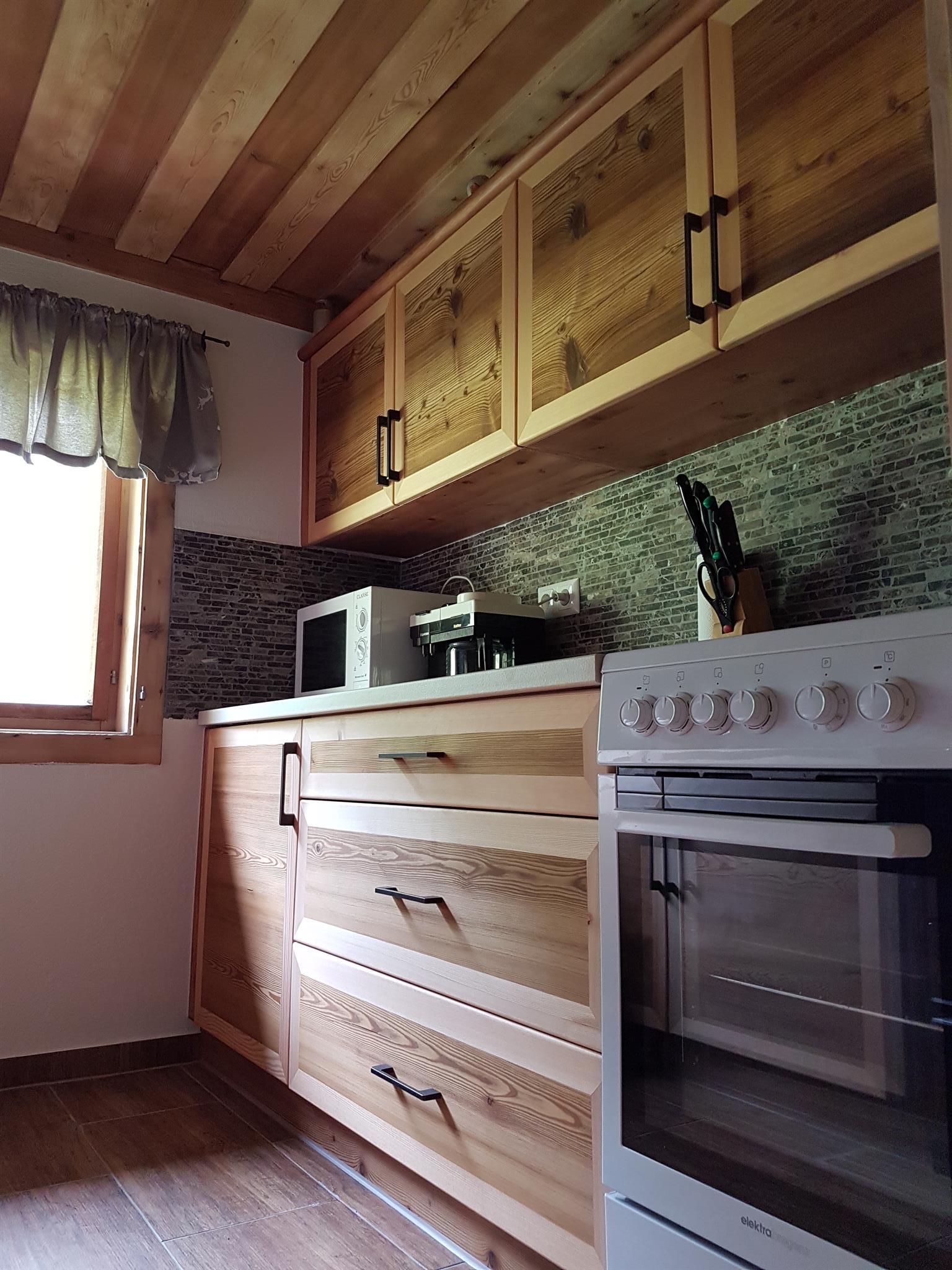 Ausstattung der Hütte: Küche mit E-Herd, Kühlschrank, Wasserkocher und Geschirr.