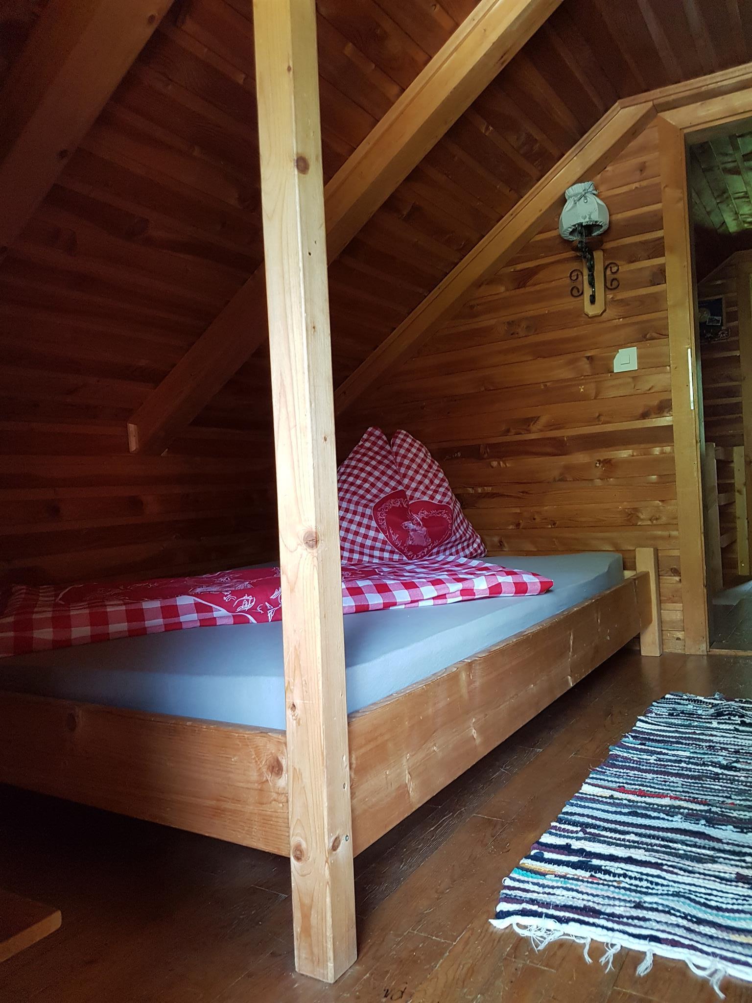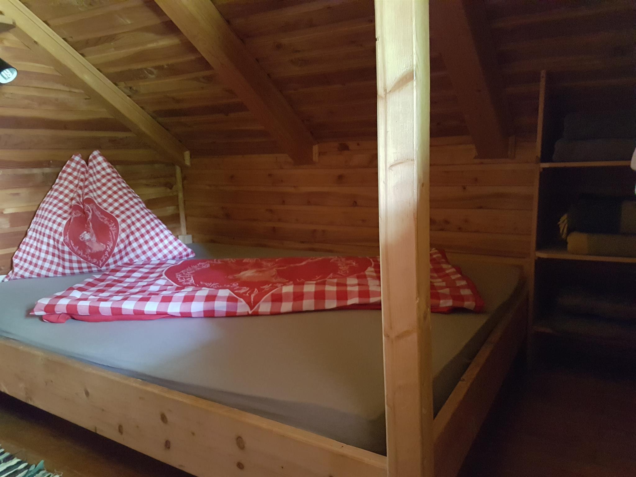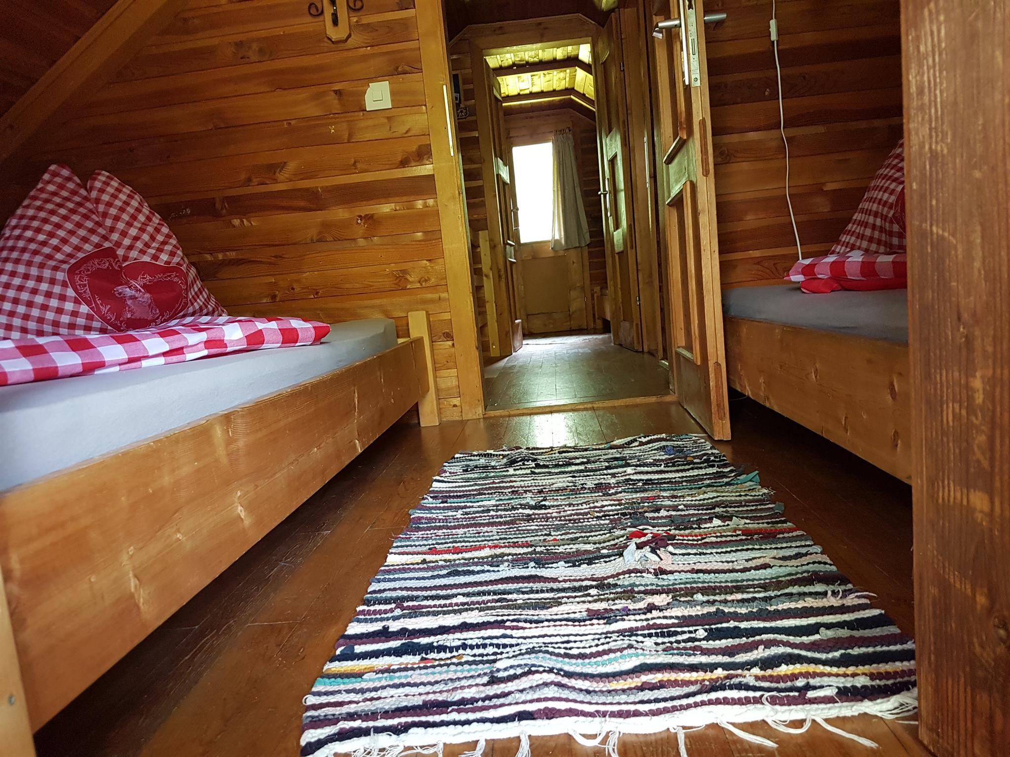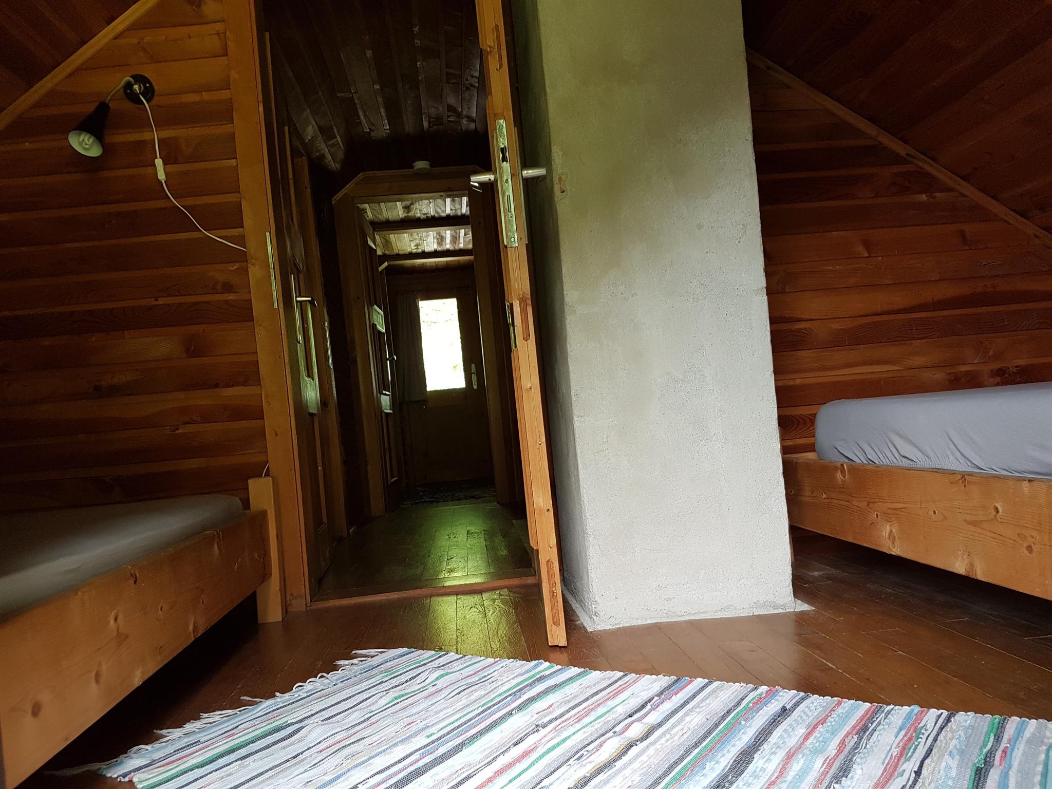 Zimmer: Die Hütte hat ein Zimmer mit 2 Doppelbetten, ein Zimmer mit 1 Doppelbett und 1 Einzelbett und ein Zimmer mit Einzelbett. Gitterbett auf Anfrage.